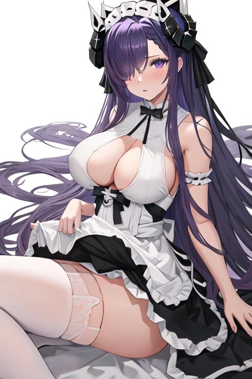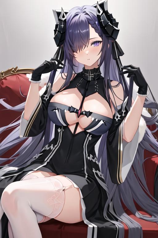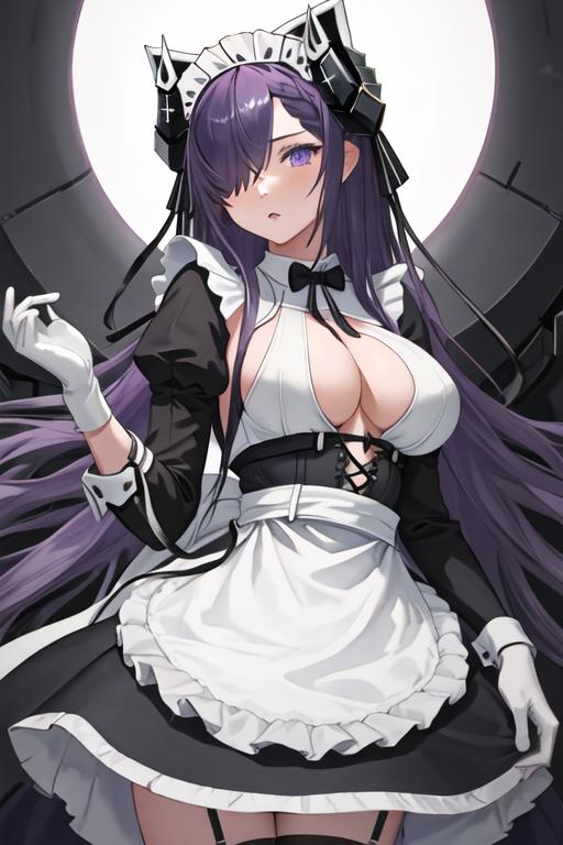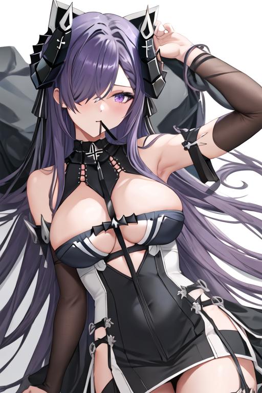 long_hair, hair_over_one_eye, horns, mechanical_horns, purple_eyes, breasts, large_breasts, curled_horns, purple_hair, very_long_hair, one_eye_covered
