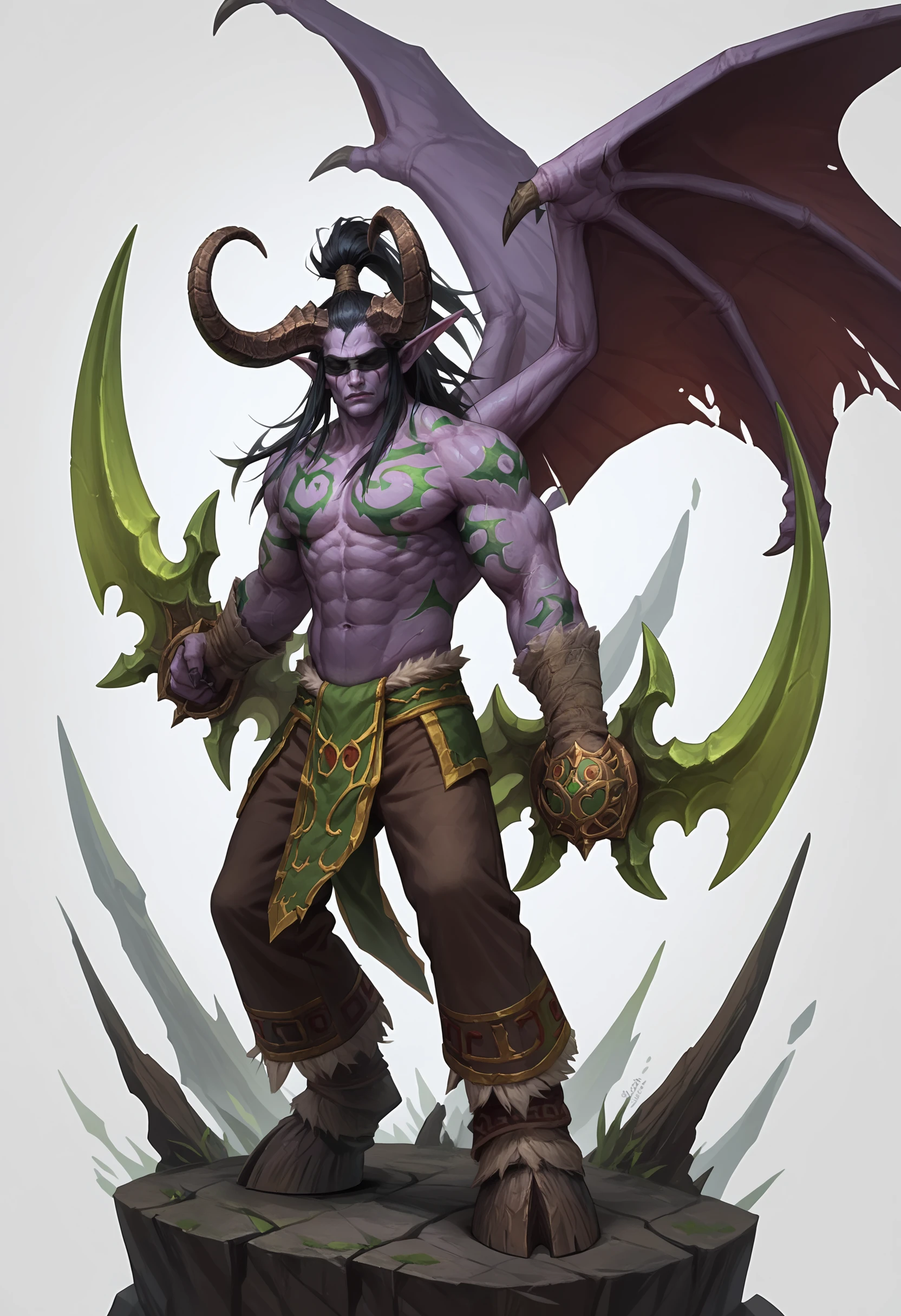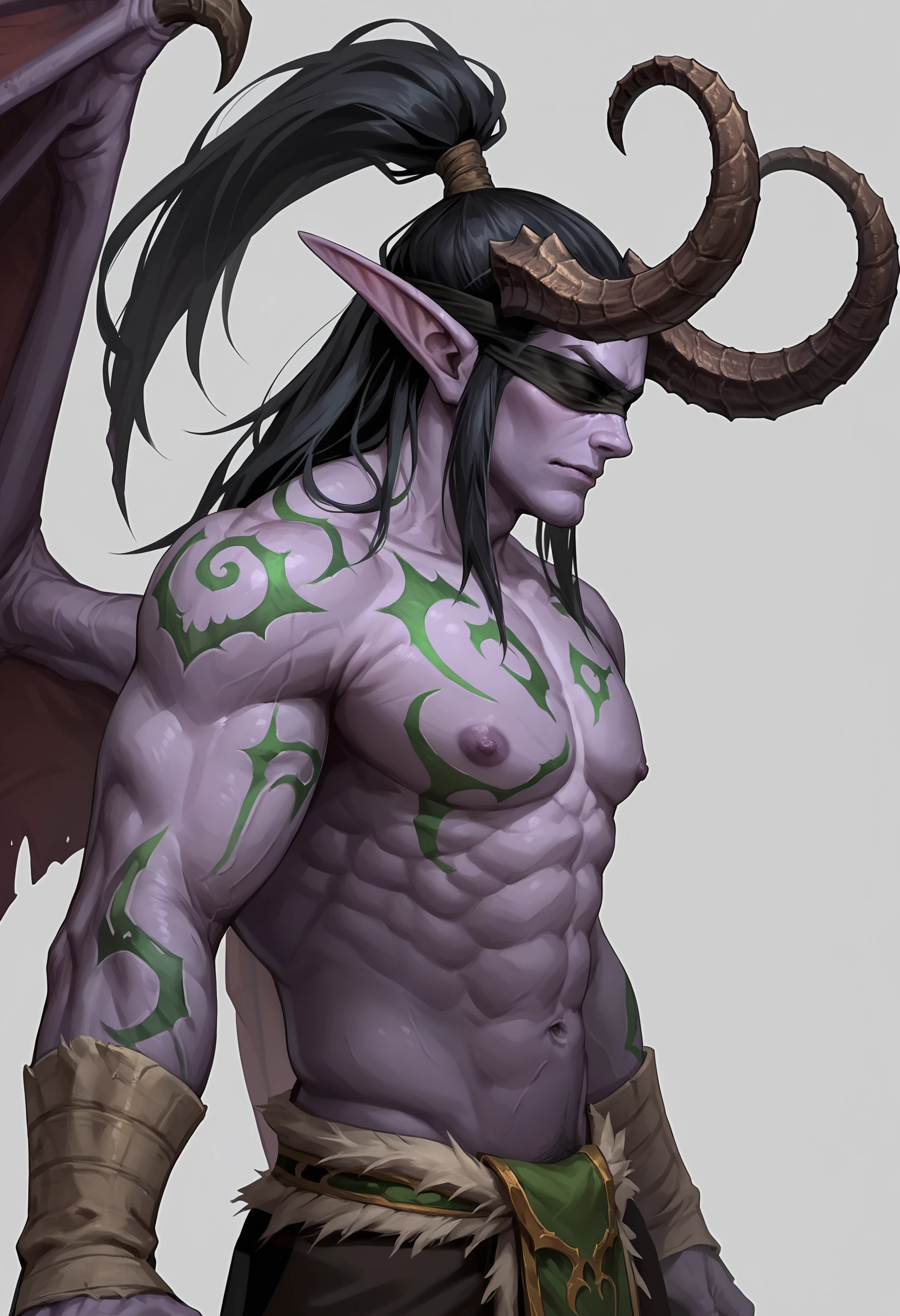 1boy male focus, horns, wings, colored skin, purple skin, demon wings, black hair, pointy ears, long hair, blindfold, glowing eyes, green eyes, abs, ??????? male,