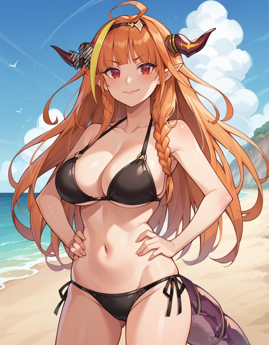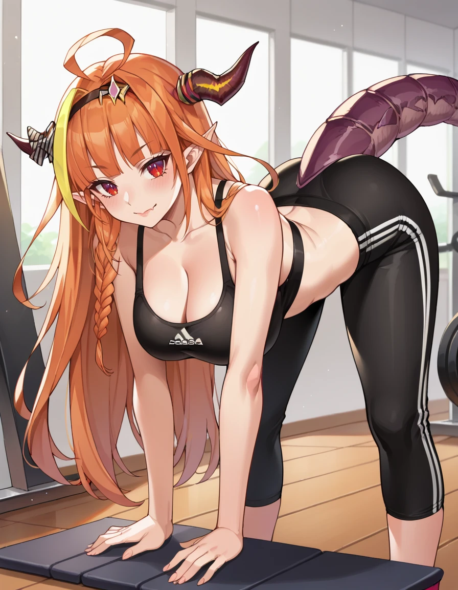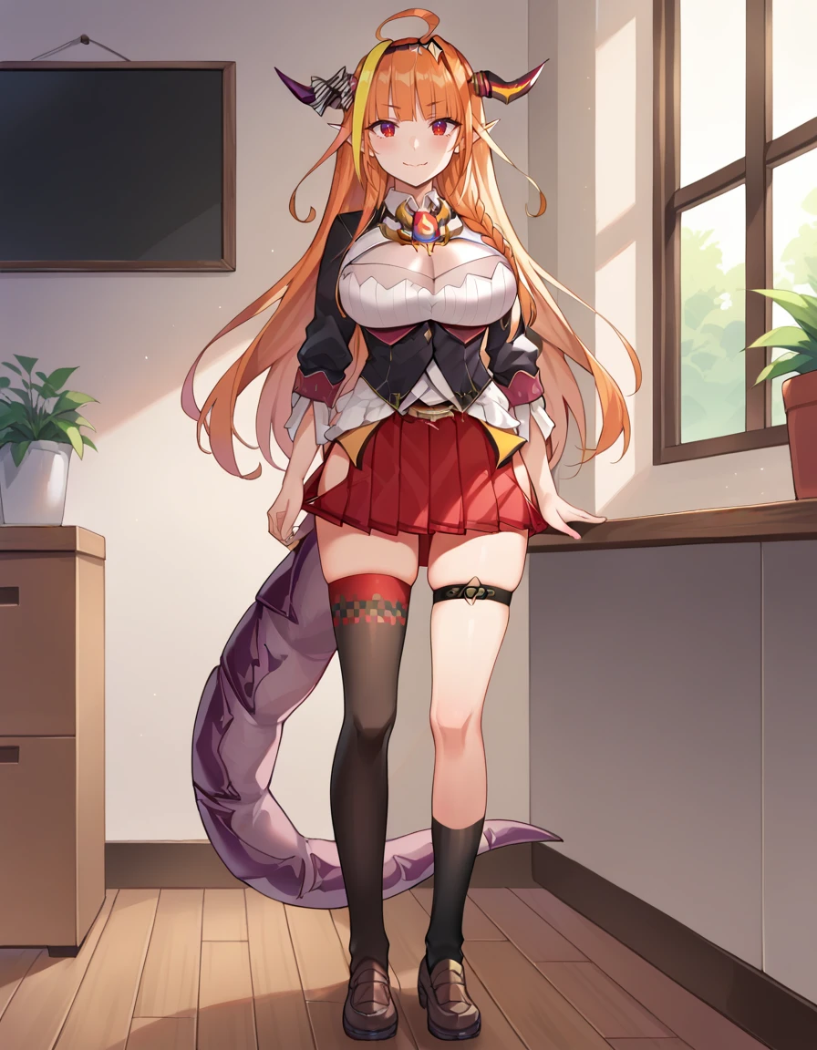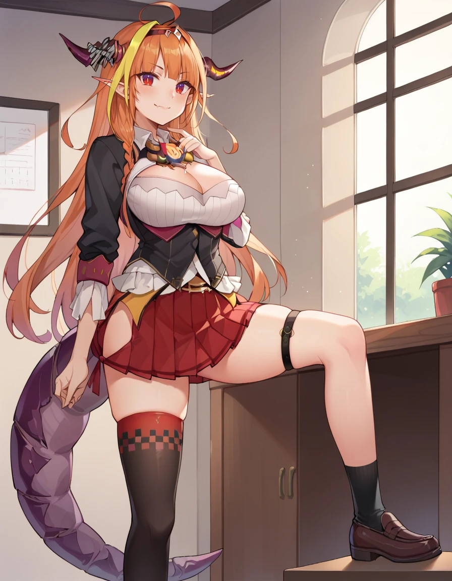kiryu_coco, coco_default, orange hair, long hair, streaked hair, single braid, black hairband, red eyes, pointy ears, horn bow, large breasts,, dragon tail, black jacket, white shirt, collared shirt, cleavage cutout, brooch, red skirt, single thighhigh, thigh strap, asymmetrical legwear, black sock, loafersTracksuit Outfit:
