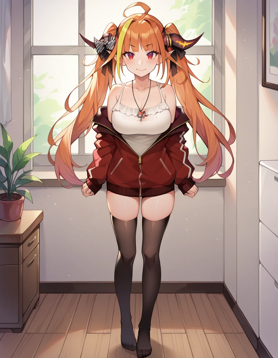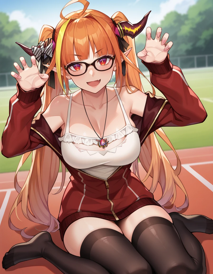kiryu_coco, coco_track, orange hair, red eyes, twintails, streaked hair, horn bow, pointy ears, necklace, collarbone, large breasts,, bare shoulders, partially unzipped, red jacket, track jacket, long sleeves, white camisole, frills, cleavage cutout, black thighhighsDescription