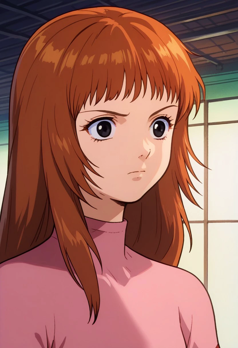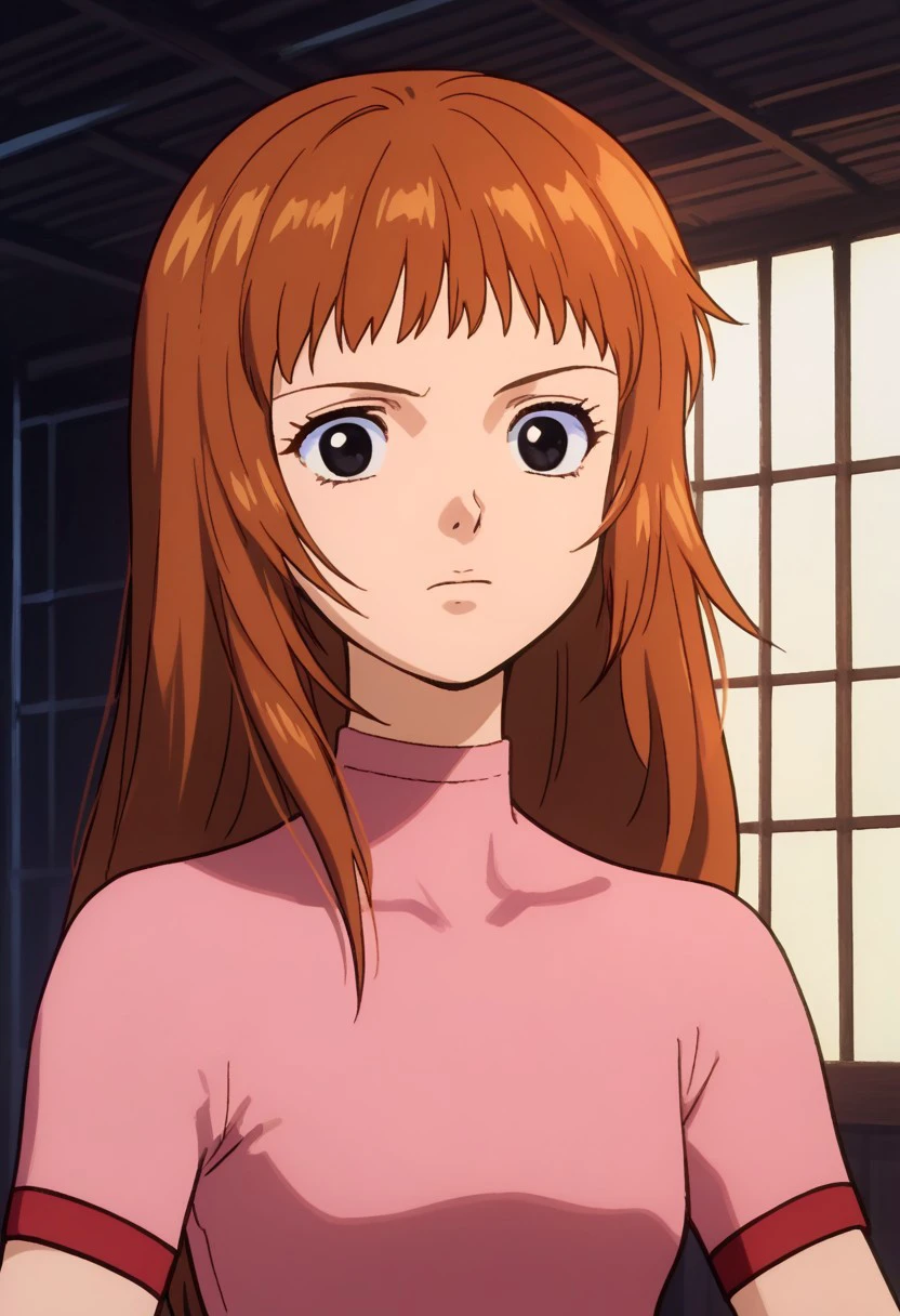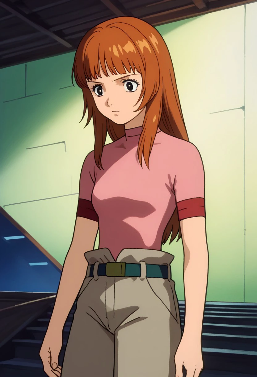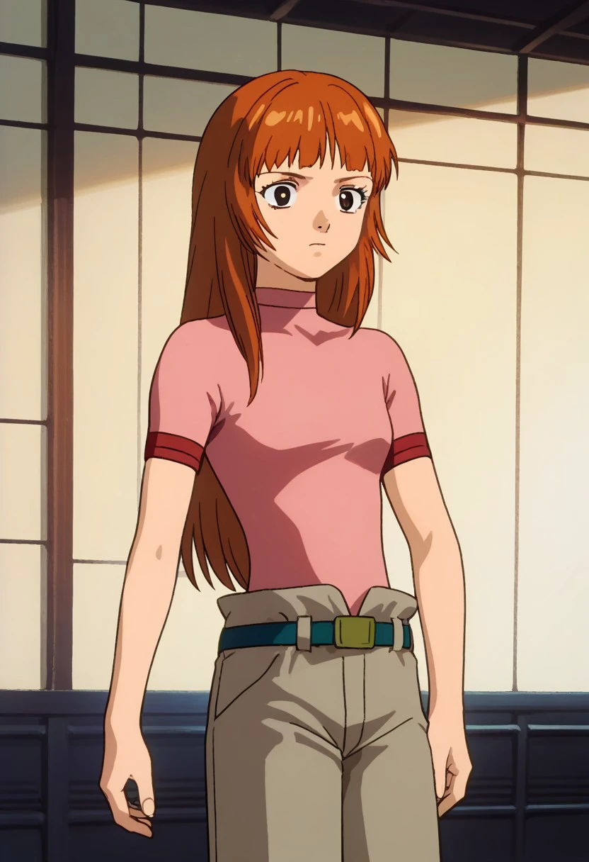 Utsumiya, 1girl, solo, black eyes, brown hair, long hair, bangs, shirt, pink shirt, short sleeves, belt, pants, shoes,