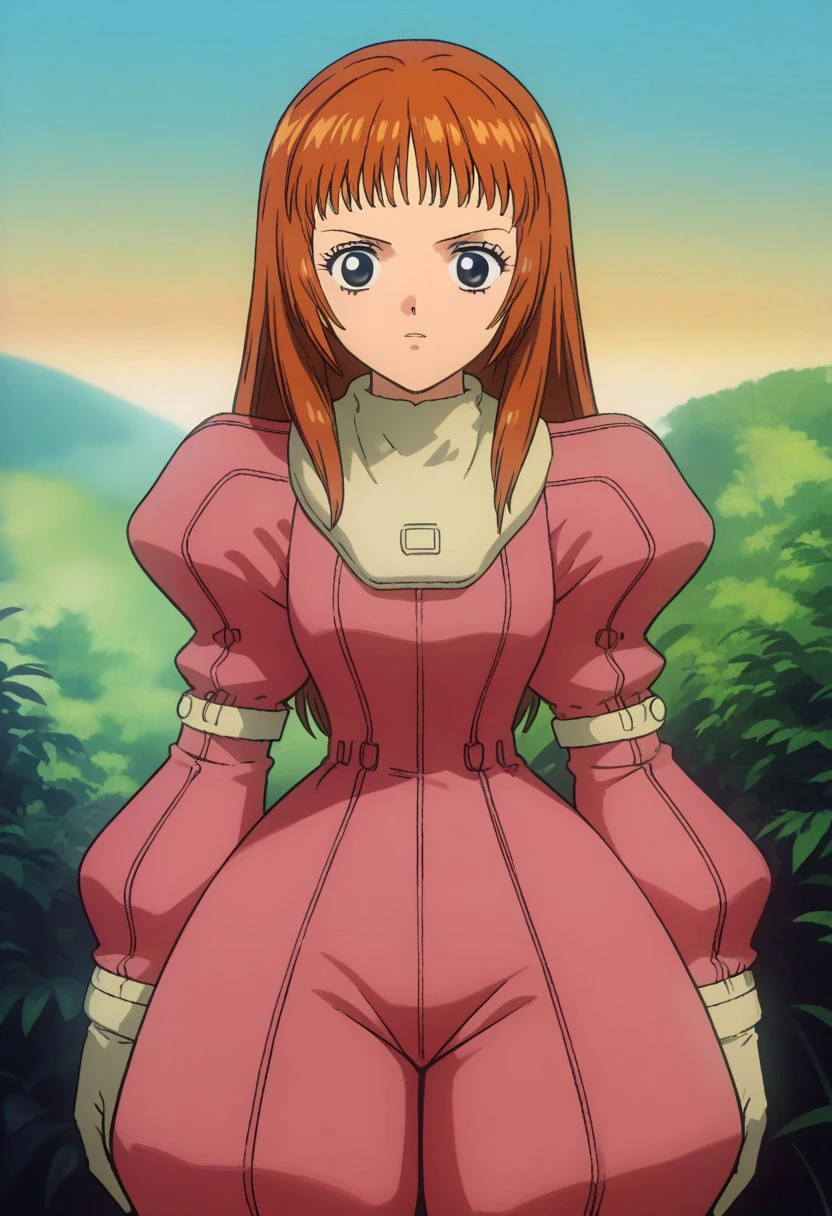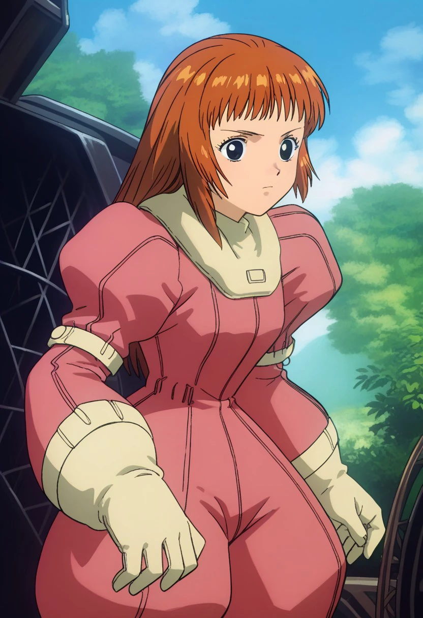 Utsumiya, 1girl, solo, black eyes, brown hair, long hair, bangs, pilot suit, pink suit, puffy sleeves, gloves, white gloves