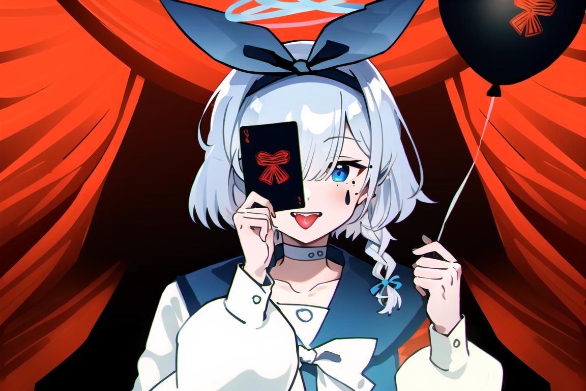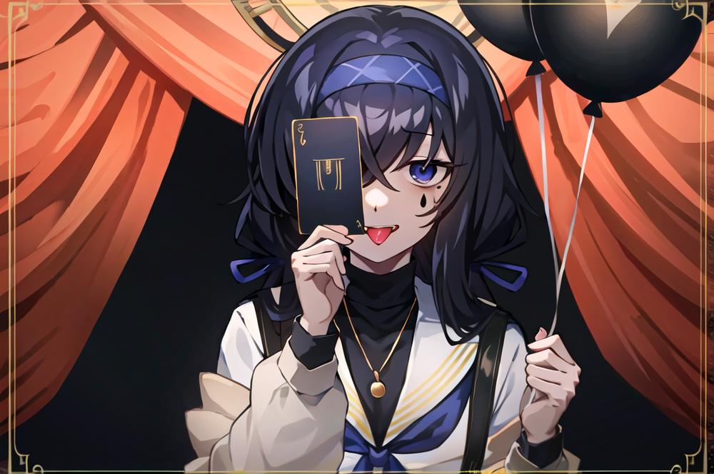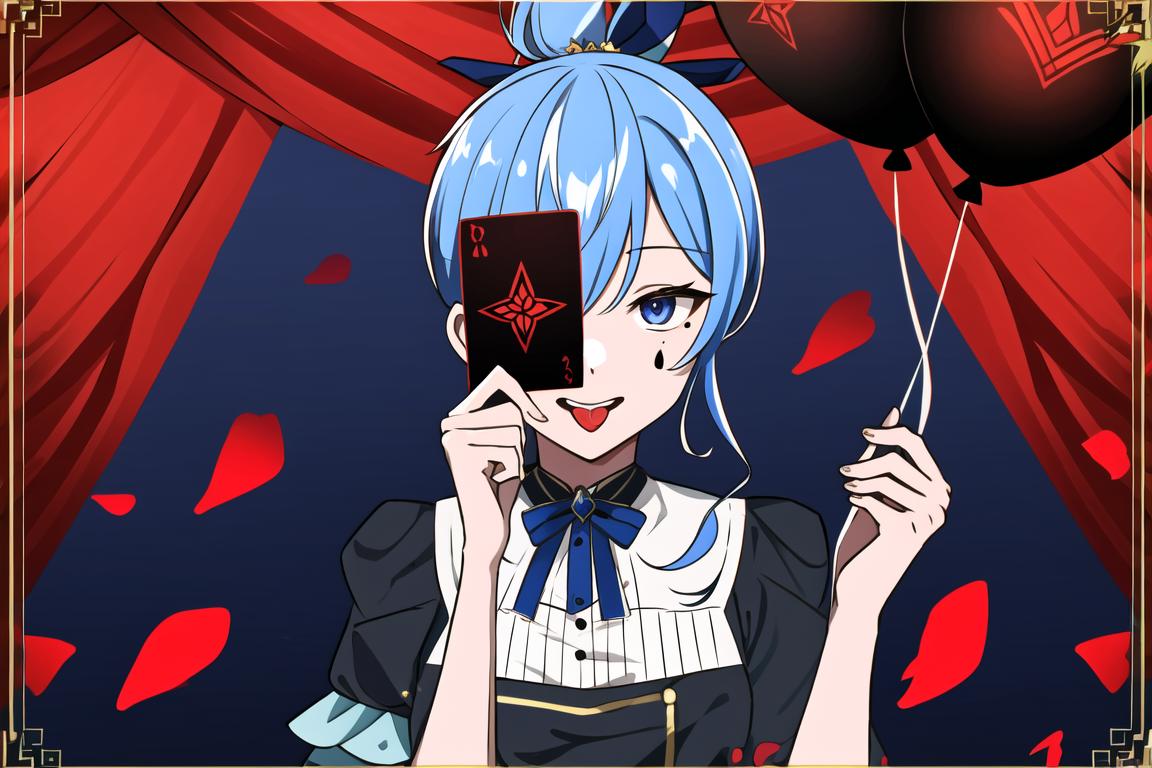 recommended prompt: envy baby, looking at viewer, holding, tongue, tongue out, mole, facial mark, curtains, one eye covered, card, balloon, red theme, holding card, framed, stage, holding balloon