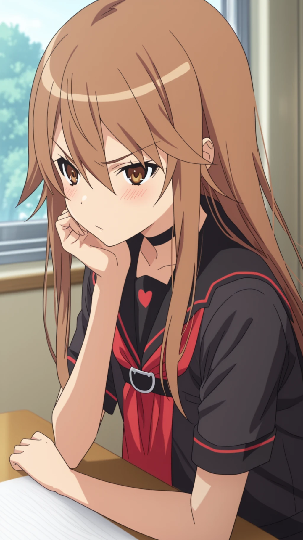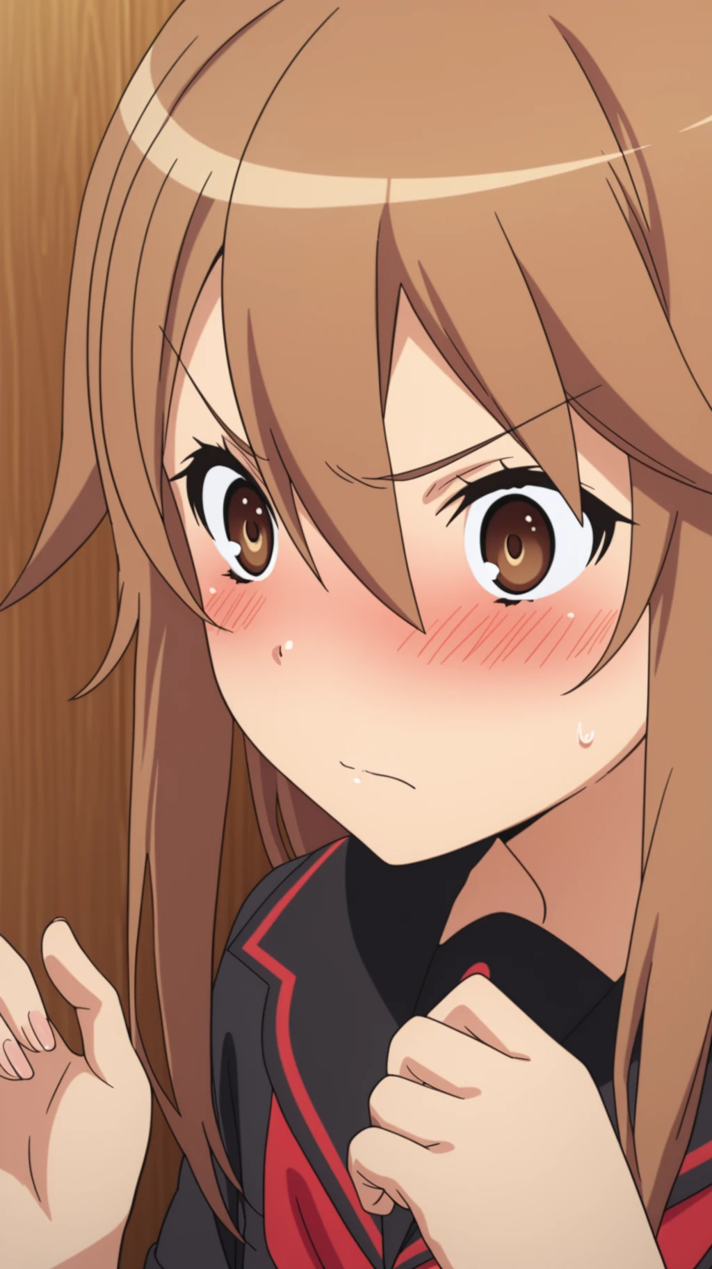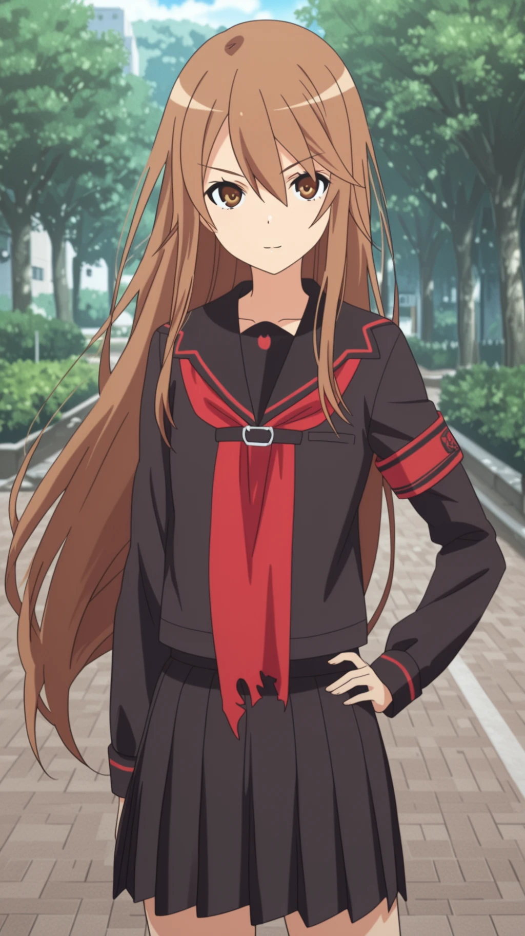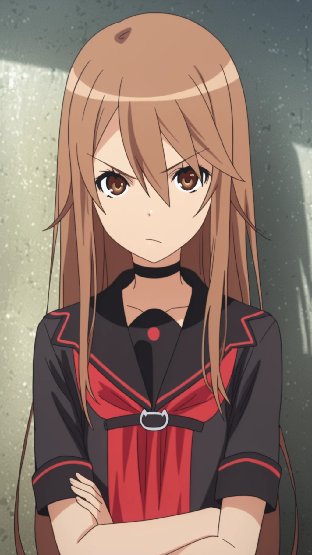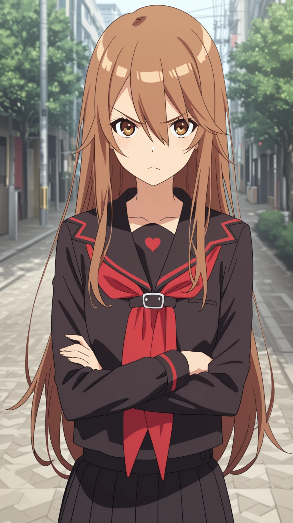 Ryoko Okami \(Okami-san\), 1girl, solo, school uniform, black serafuku, long brown hair, brown eyes, serious expression, arms crossed, looking at viewerRyoko Okami \(Okami-san\), 1girl, neko neko knuckles, boxing gloves, fighting stance, angry, determined expression, outdoorsDescription