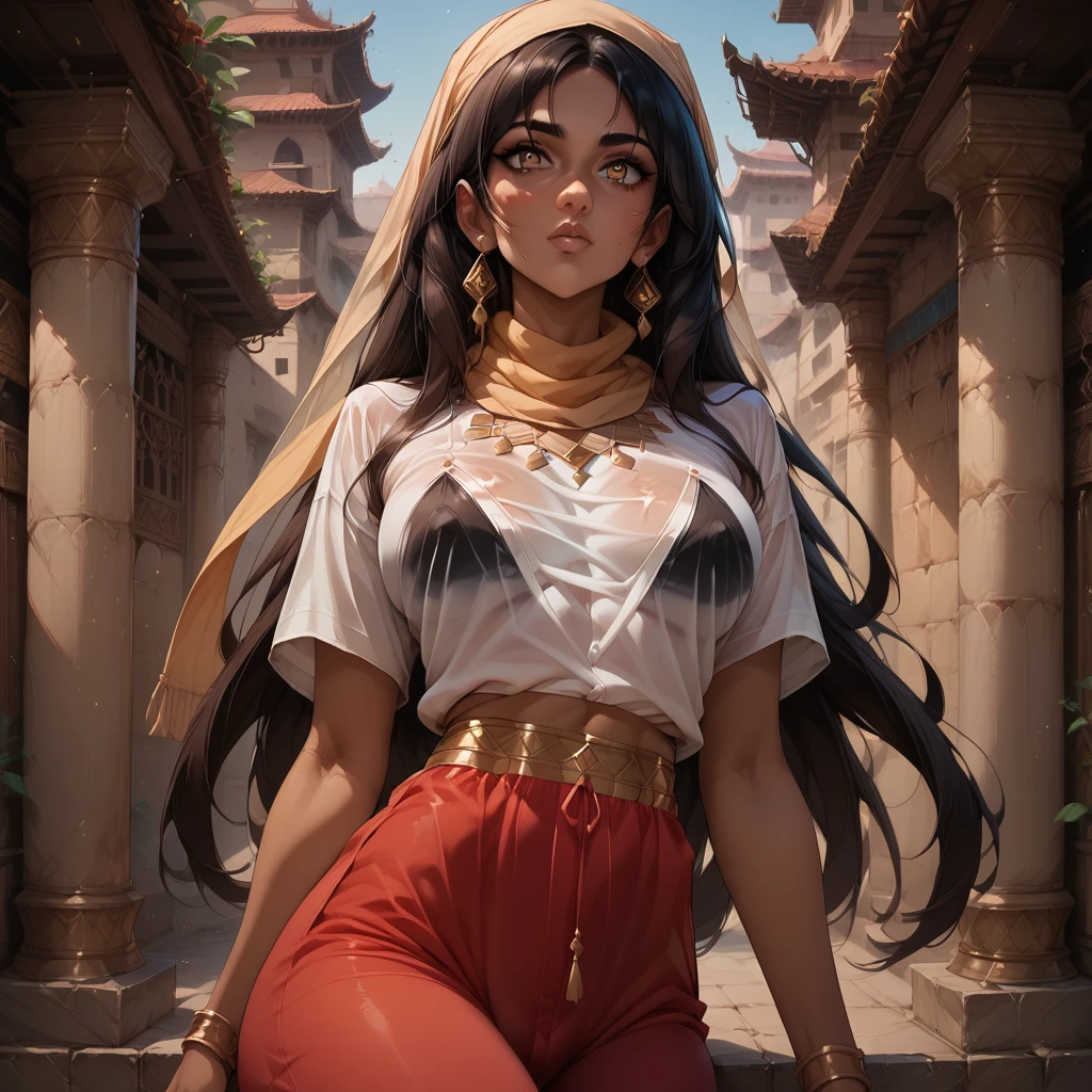 loose pants, harem_pants, see-through, silk, tight-fitting shirt, impossible shirt,