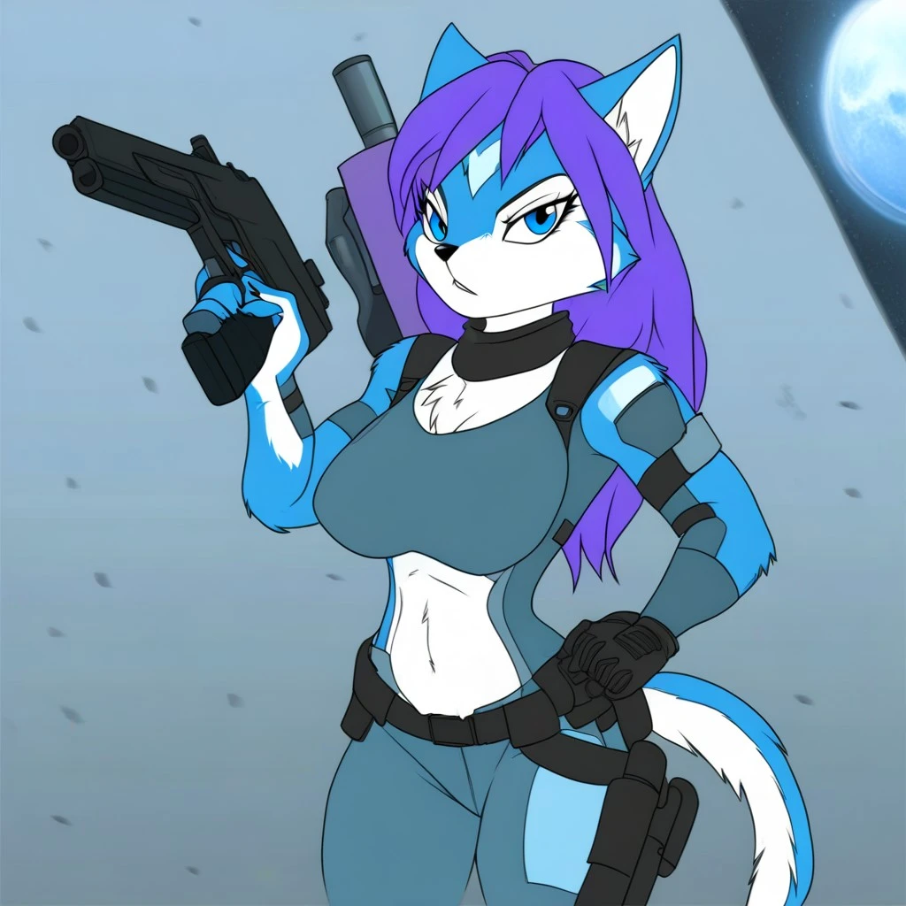 purple hair, green eyes, blue fur, fox ears, fox tail