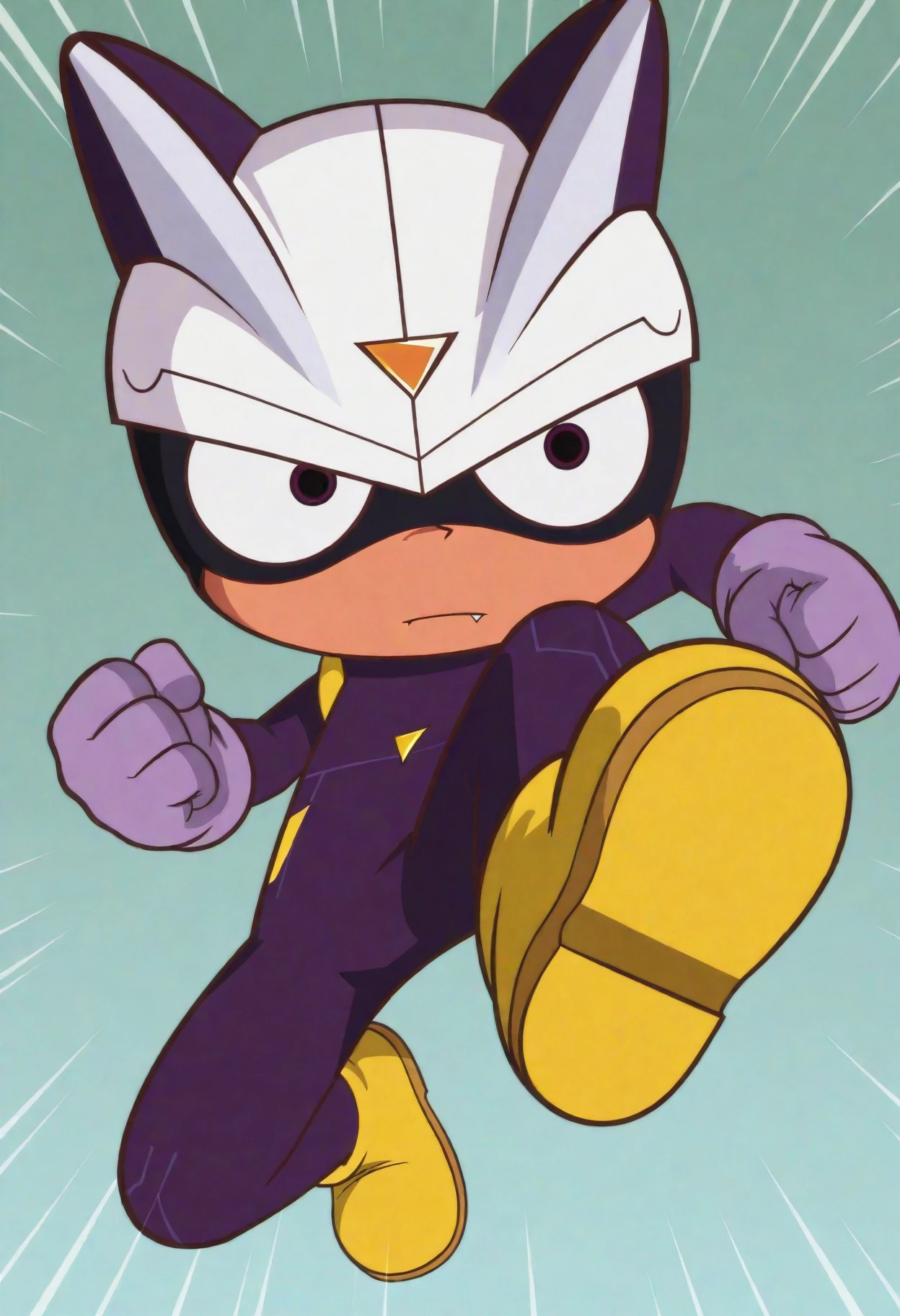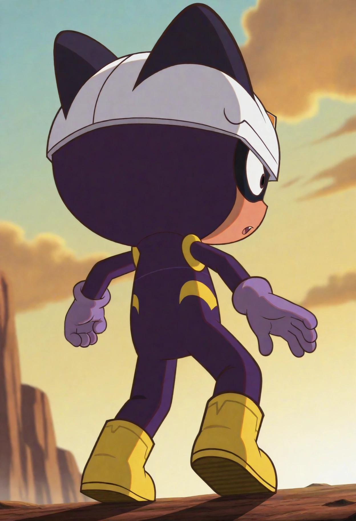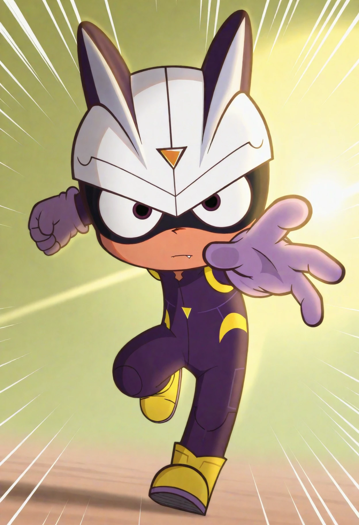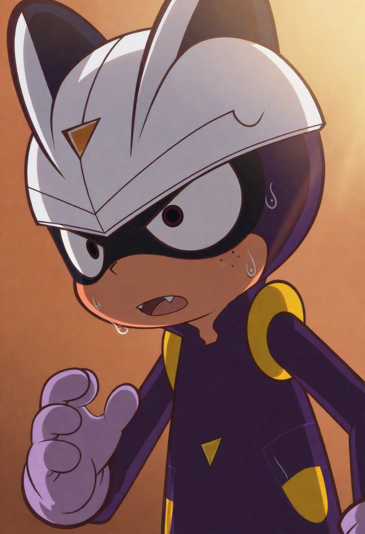 careful s., brown eyes, white helmet, purple bodysuit, purple gloves, yellow footwear,