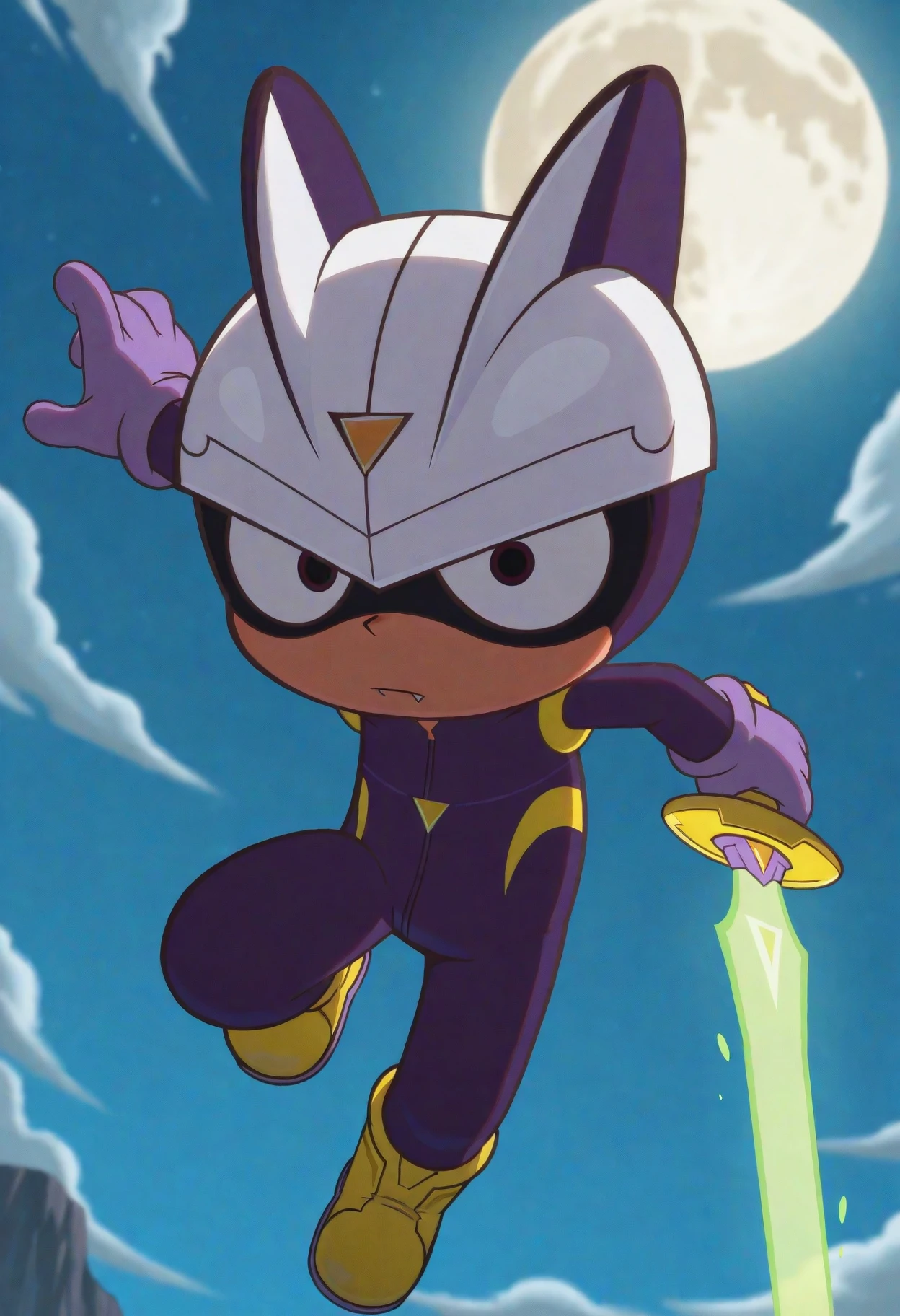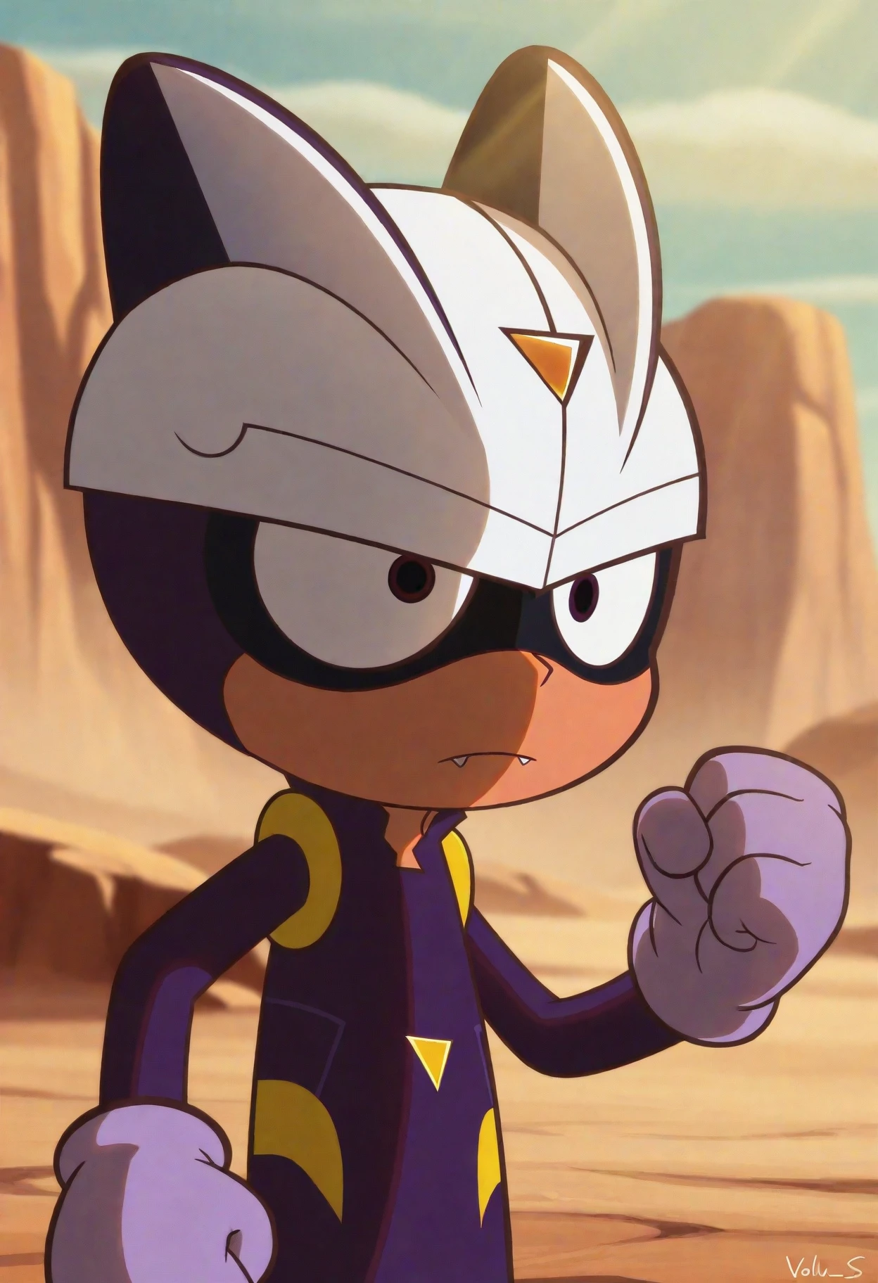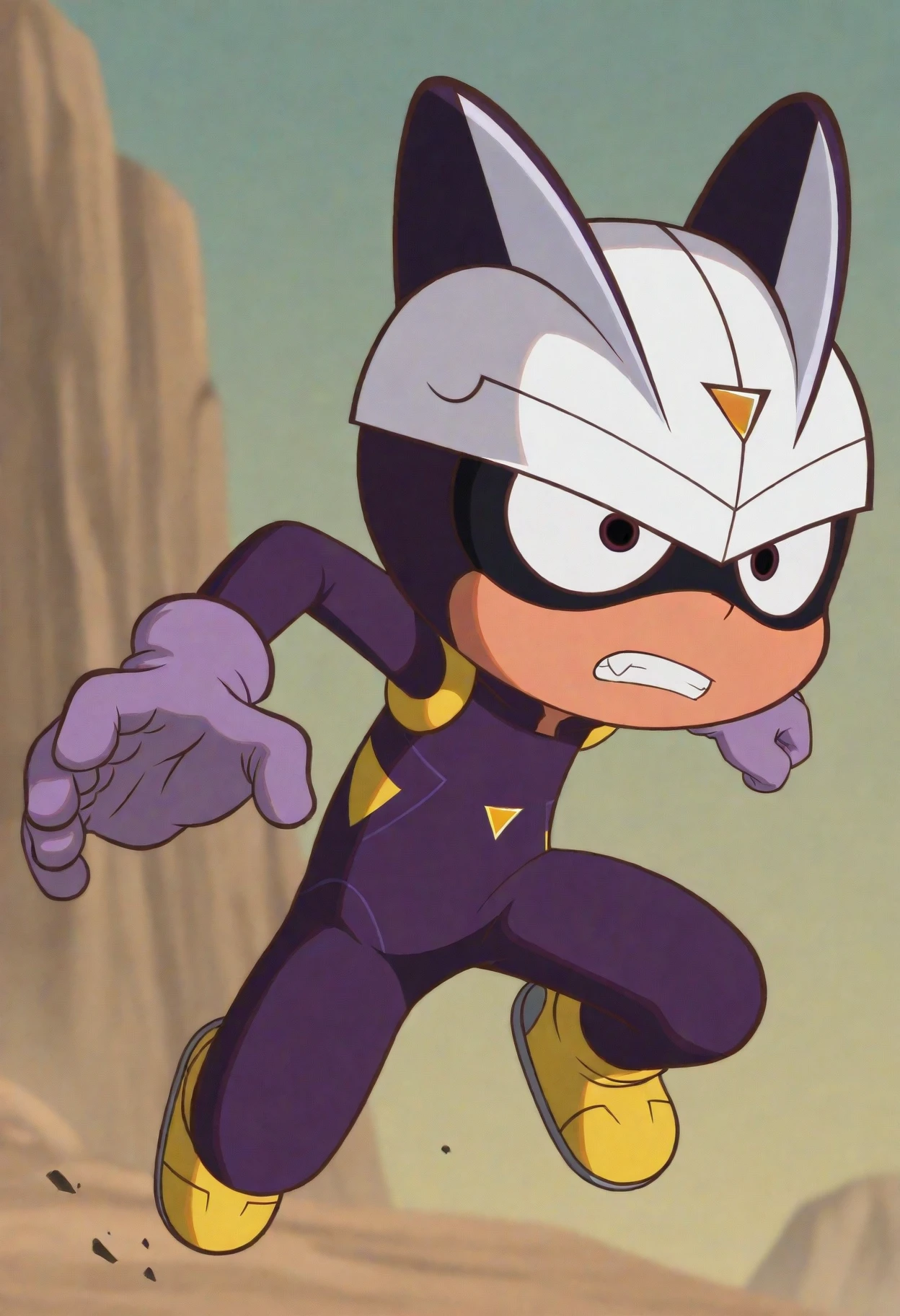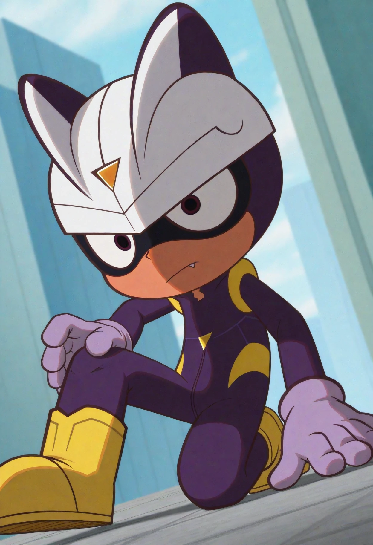 careful s., brown eyes, white helmet, purple bodysuit, purple gloves, yellow footwear,