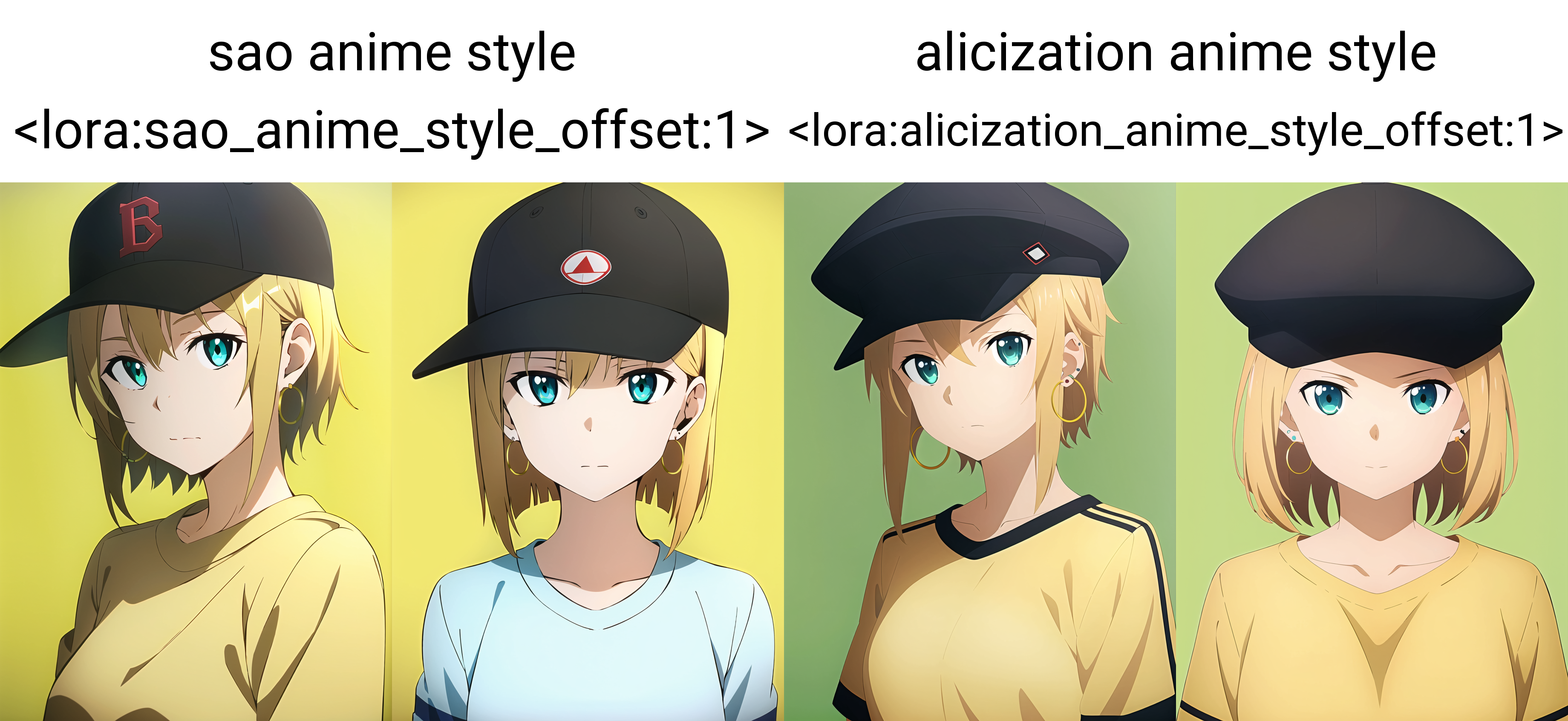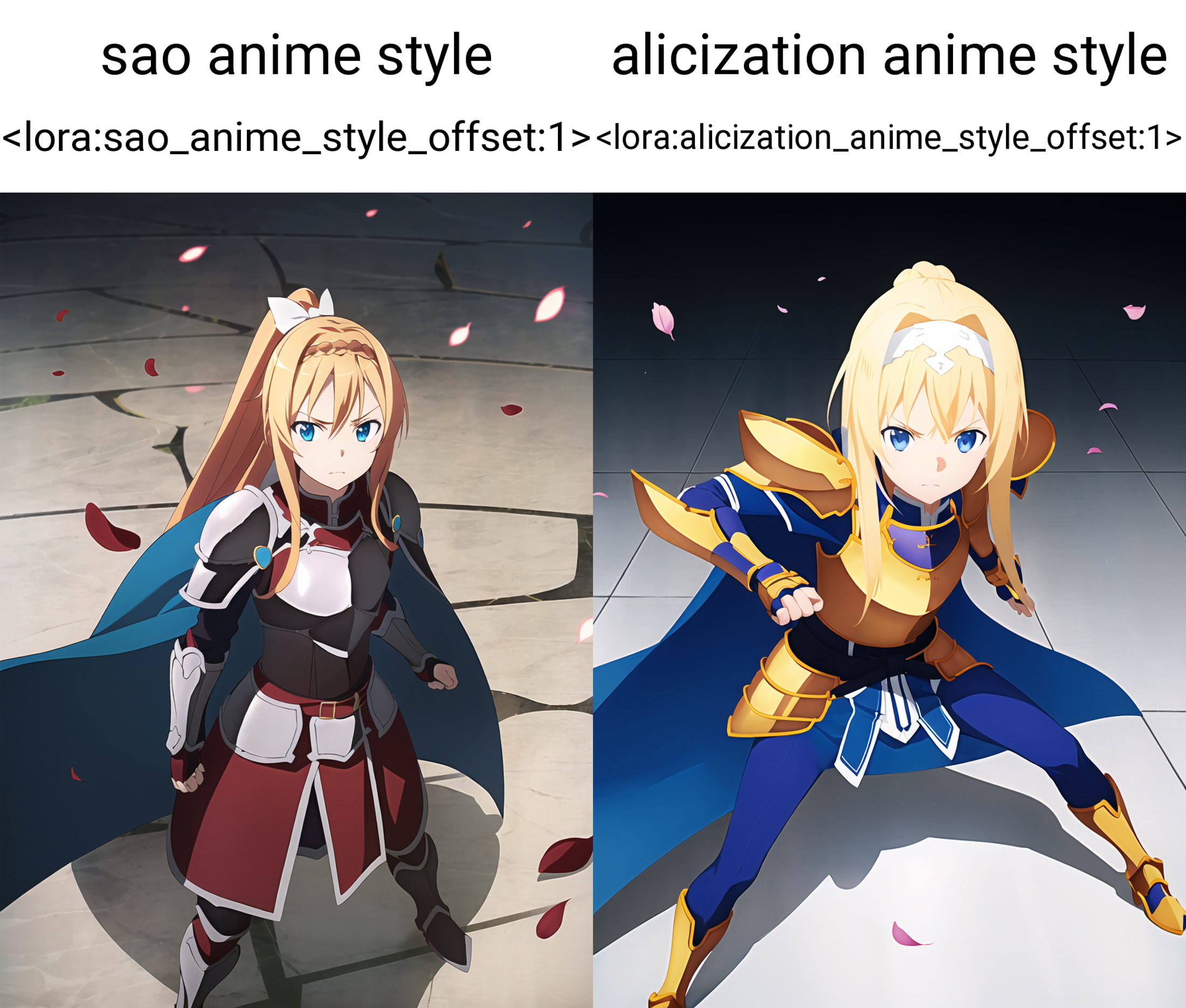 Works perfectly on AnyLoRA at weight 1. Increase the accuracy with the trigger sao anime style for the 1st season LoRA, and alicization anime style for the Alicization season LoRA. Also keep in mind your LoRA file name might be different from the ones I used in examples.