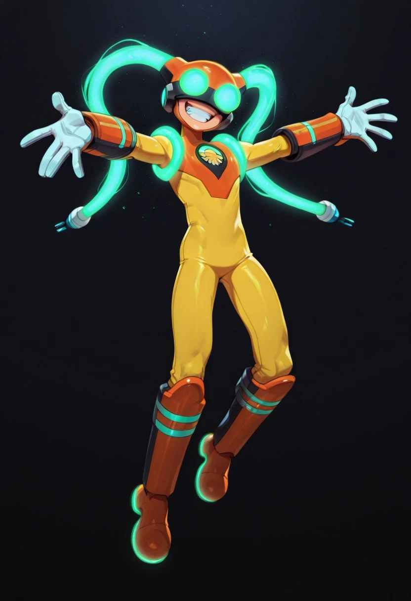 Helpful Prompts: male focus, helmet, bodysuit, gloves, white gloves, knee boots
