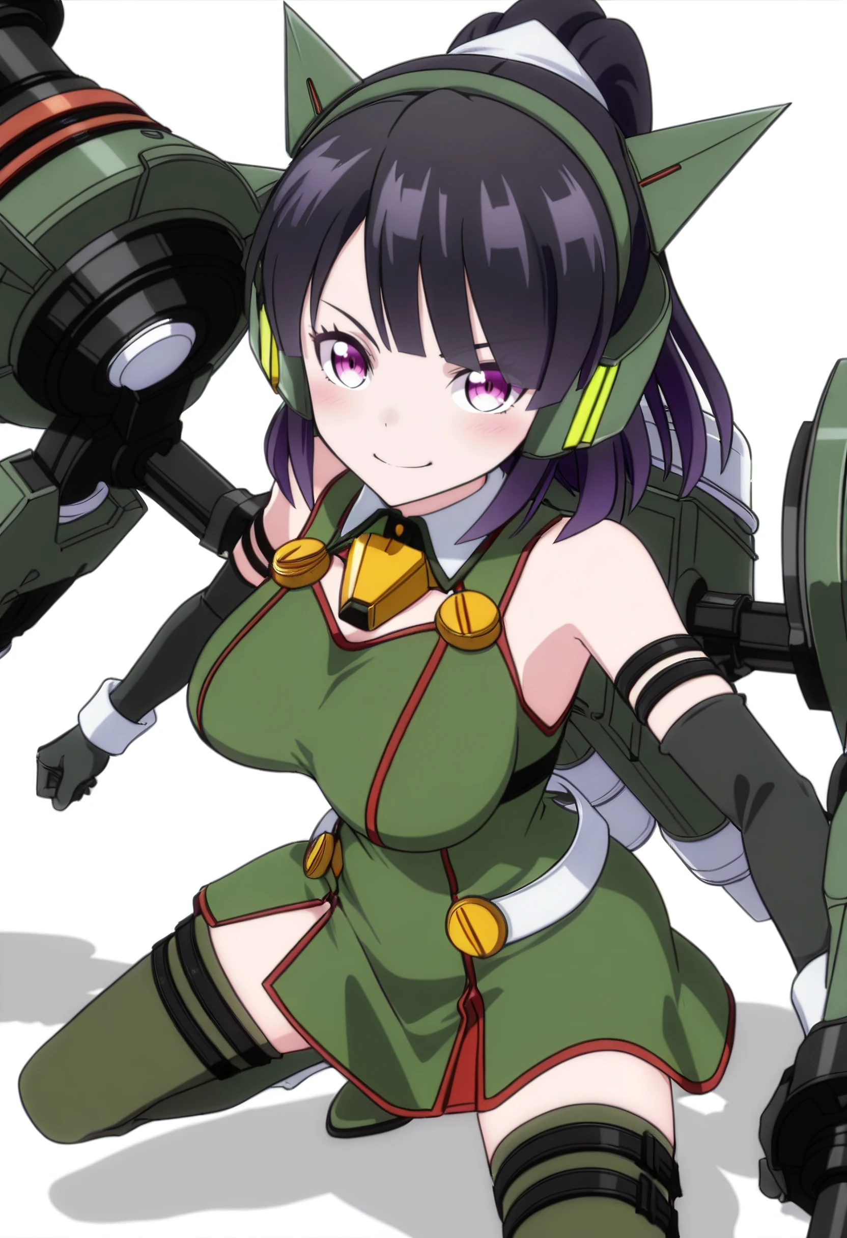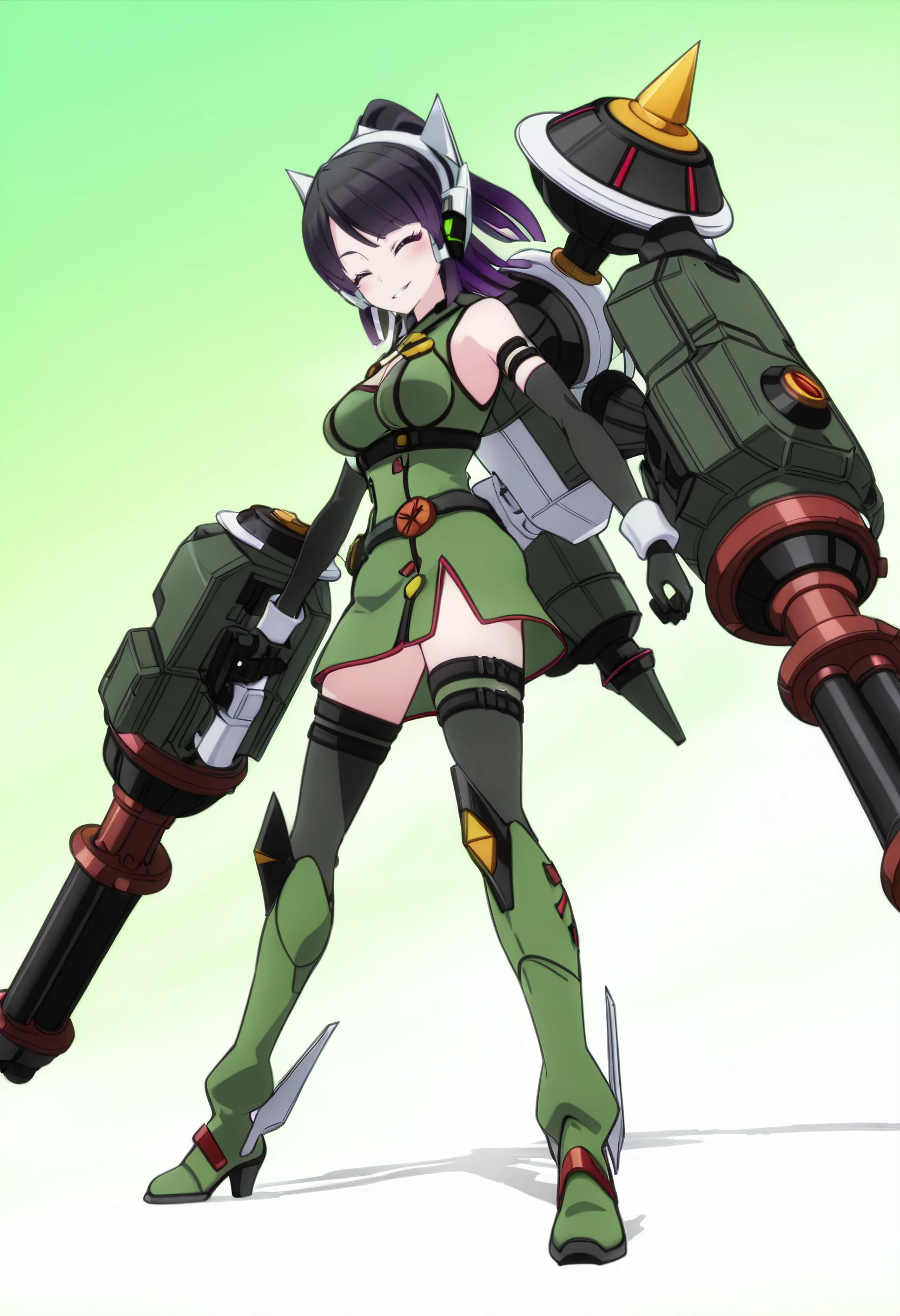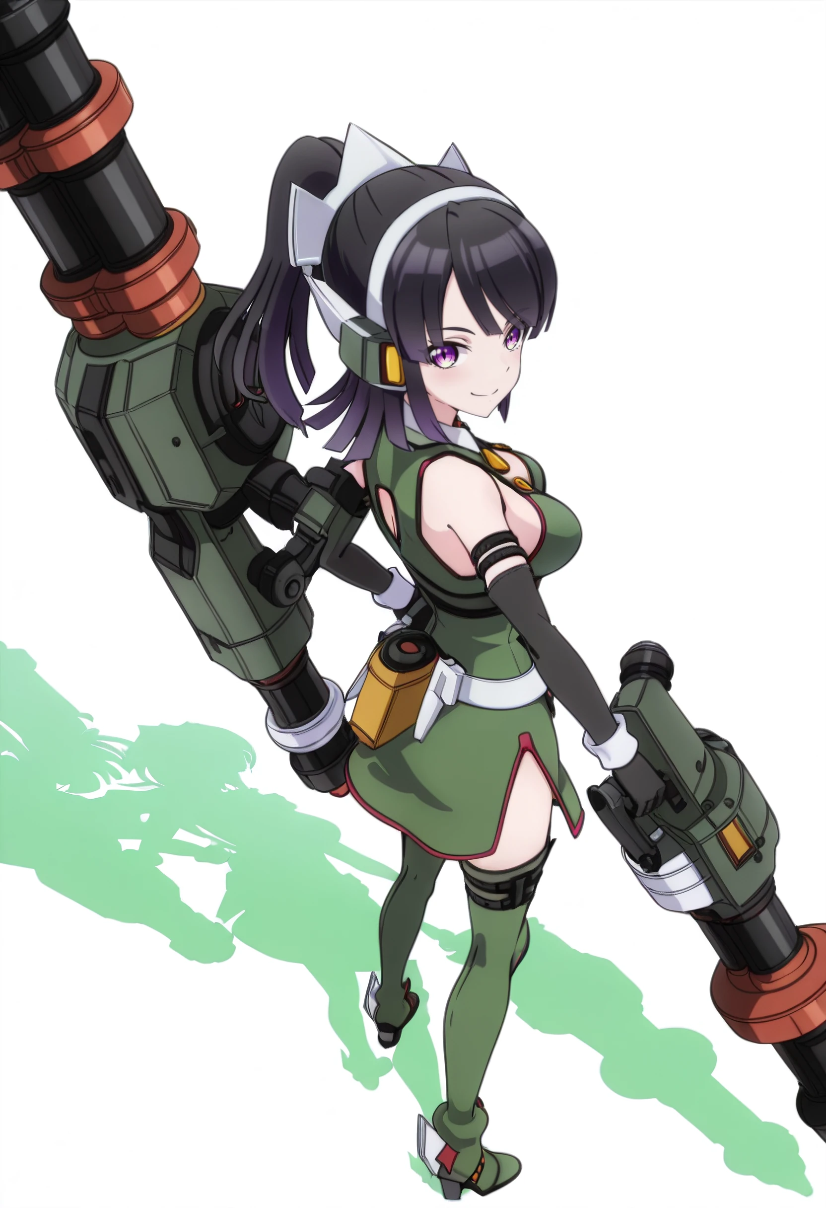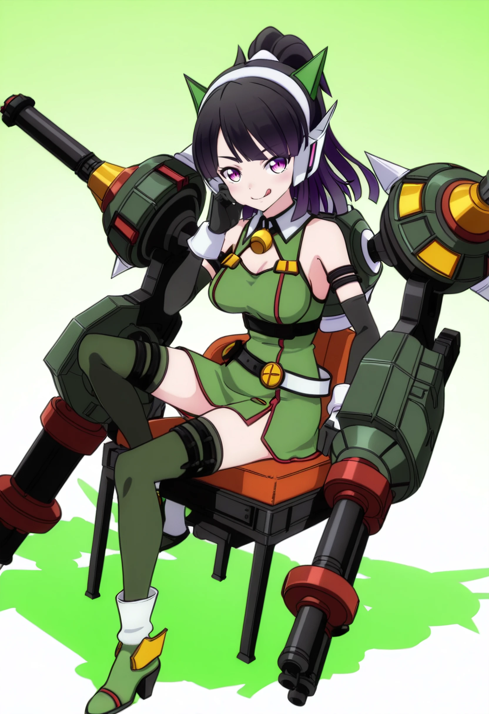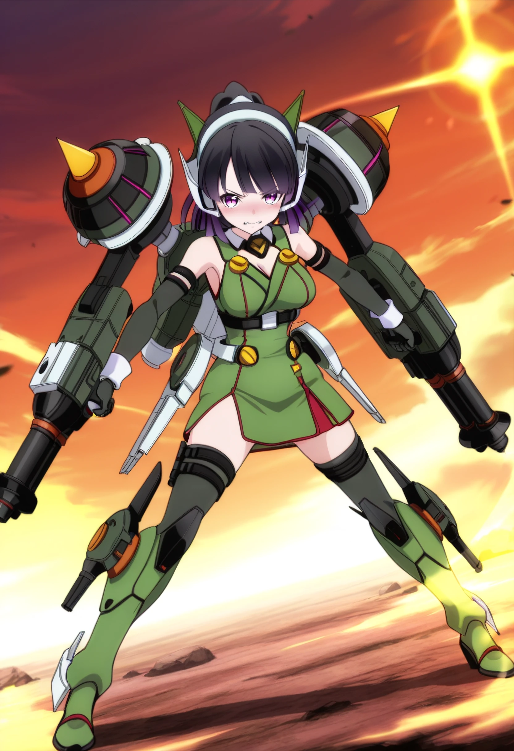 cannon, machinery, bare shoulders, elbow gloves, gloves, mecha musume, gun, mecha, weapon, boots, green legwear, headgear, thighhighs, armor, sleeveless, skirt, green skirt, green shirt,