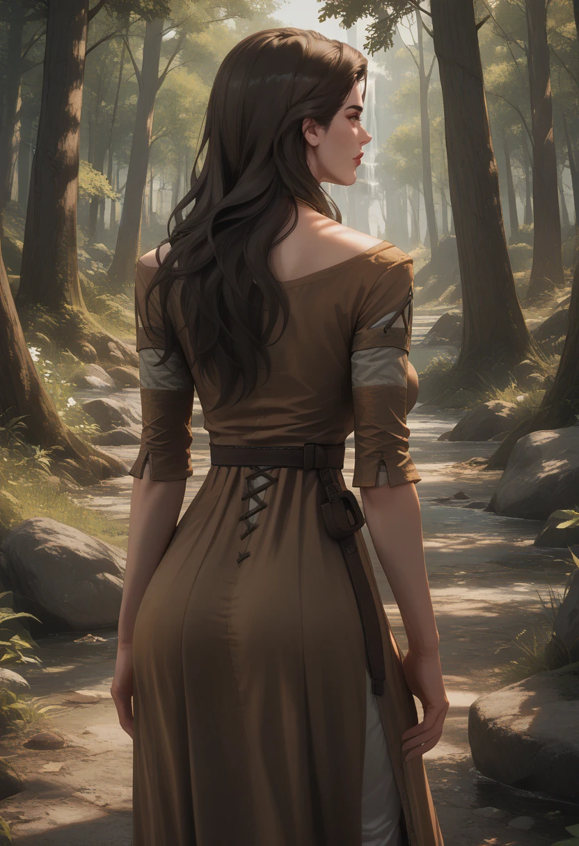 Camilla_ver1, long hair, brown hair, lips, breasts, brown dress, cleavage,