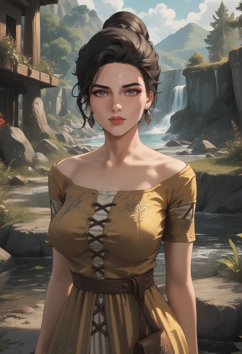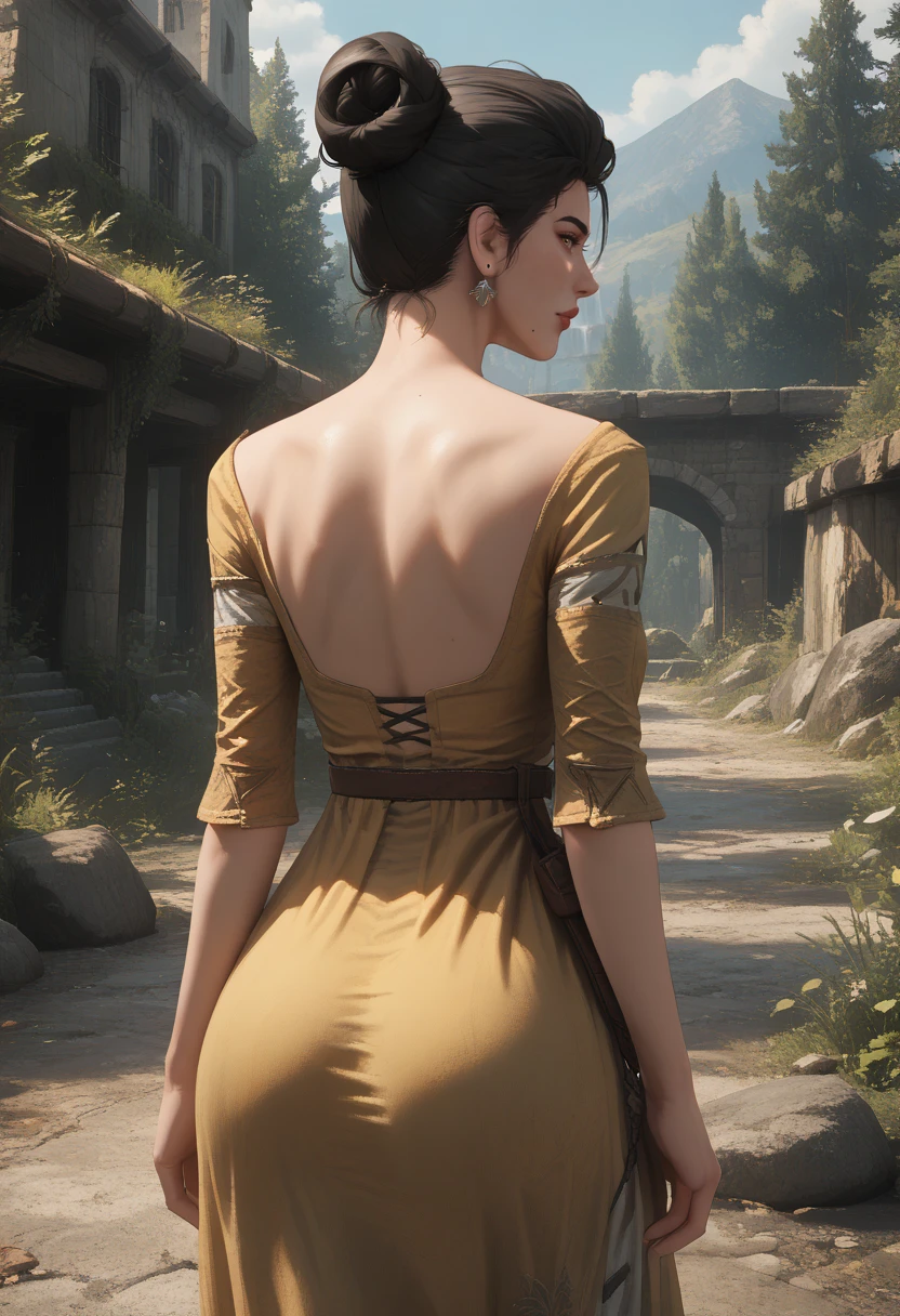 Camilla_ver2, single hair bun, hair bun, black hair, lips, mole, mole under mouth, breasts, jewelry, earrings,short yellow dress, cleavage,