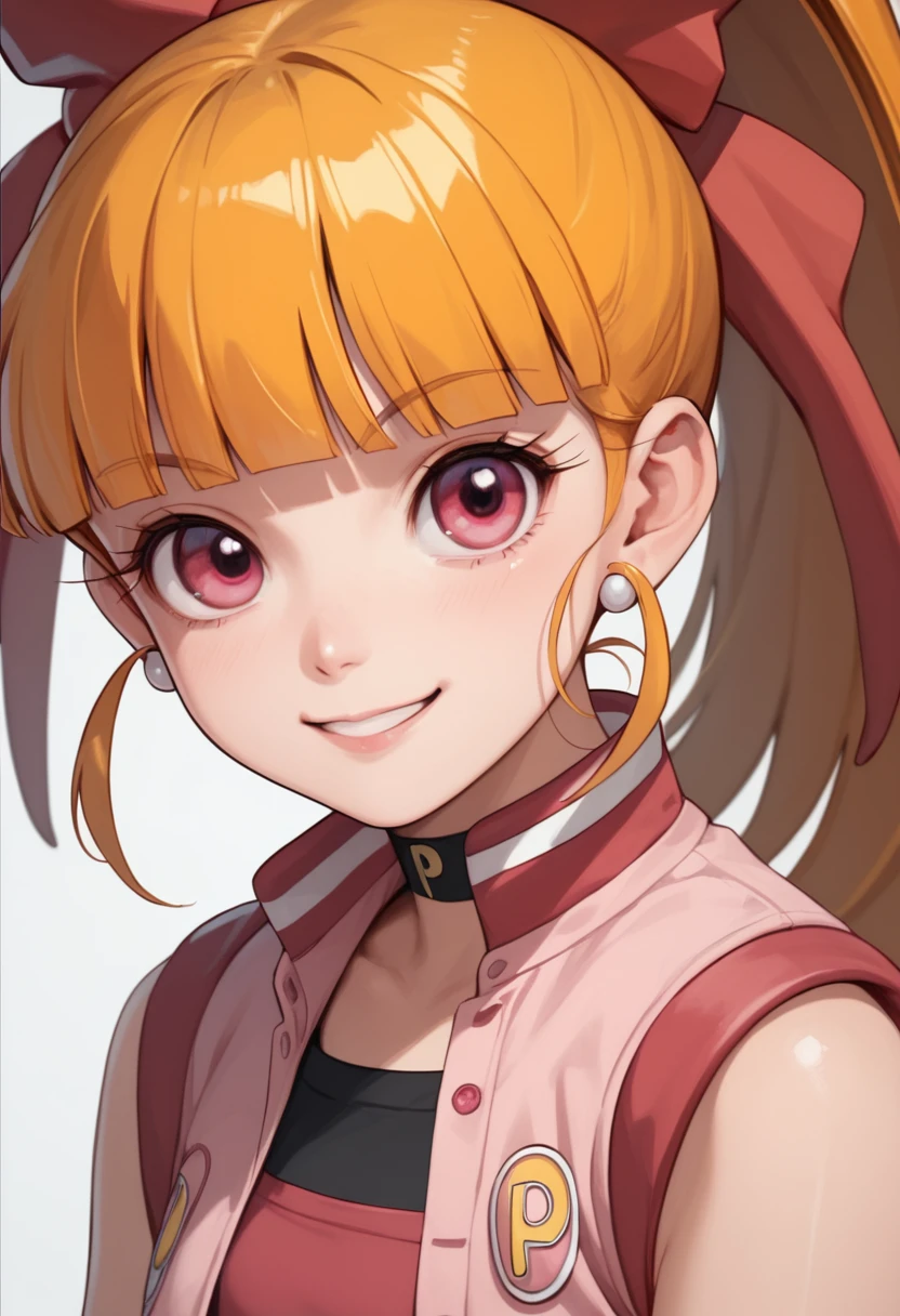 pink eyes, orange hair, blunt bangs, hair bow, ponytail, earrings