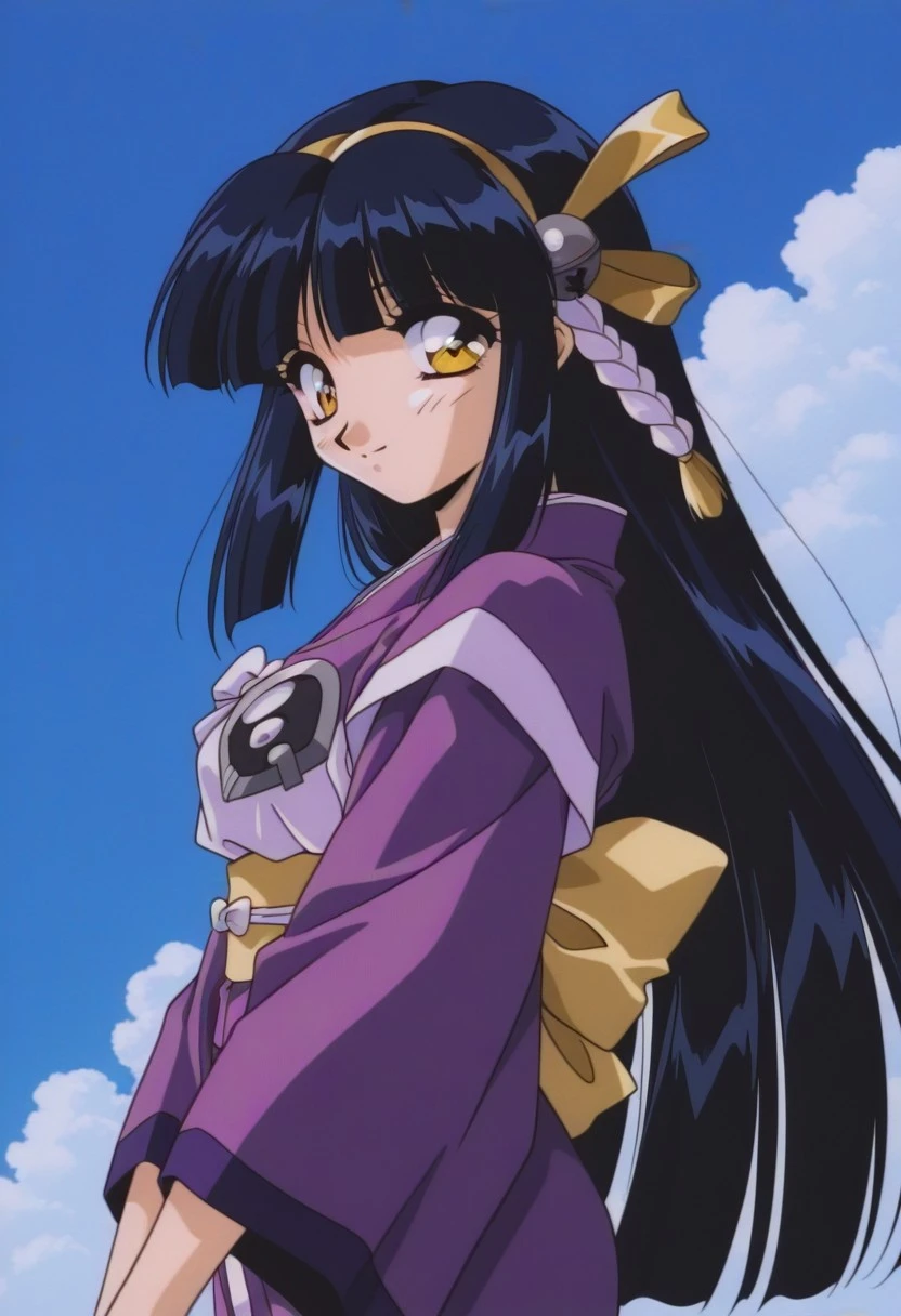 1girl, Shion, long dark blue hair, blunt bangs, yellow eyes, purple miko-style outfit, gold armor skirt panels, decorative obi, long waist ribbons, staff hair ornament, wide sleeves