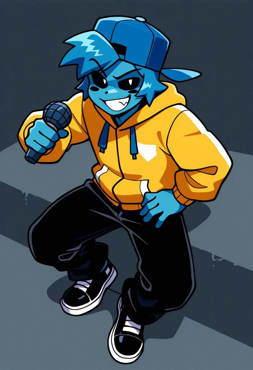 But anyway, here's the prompt: Minus BF, blue skin, blue hair, black sclera, black eyes, blue hat, yellow jacket, black pants, black shoes