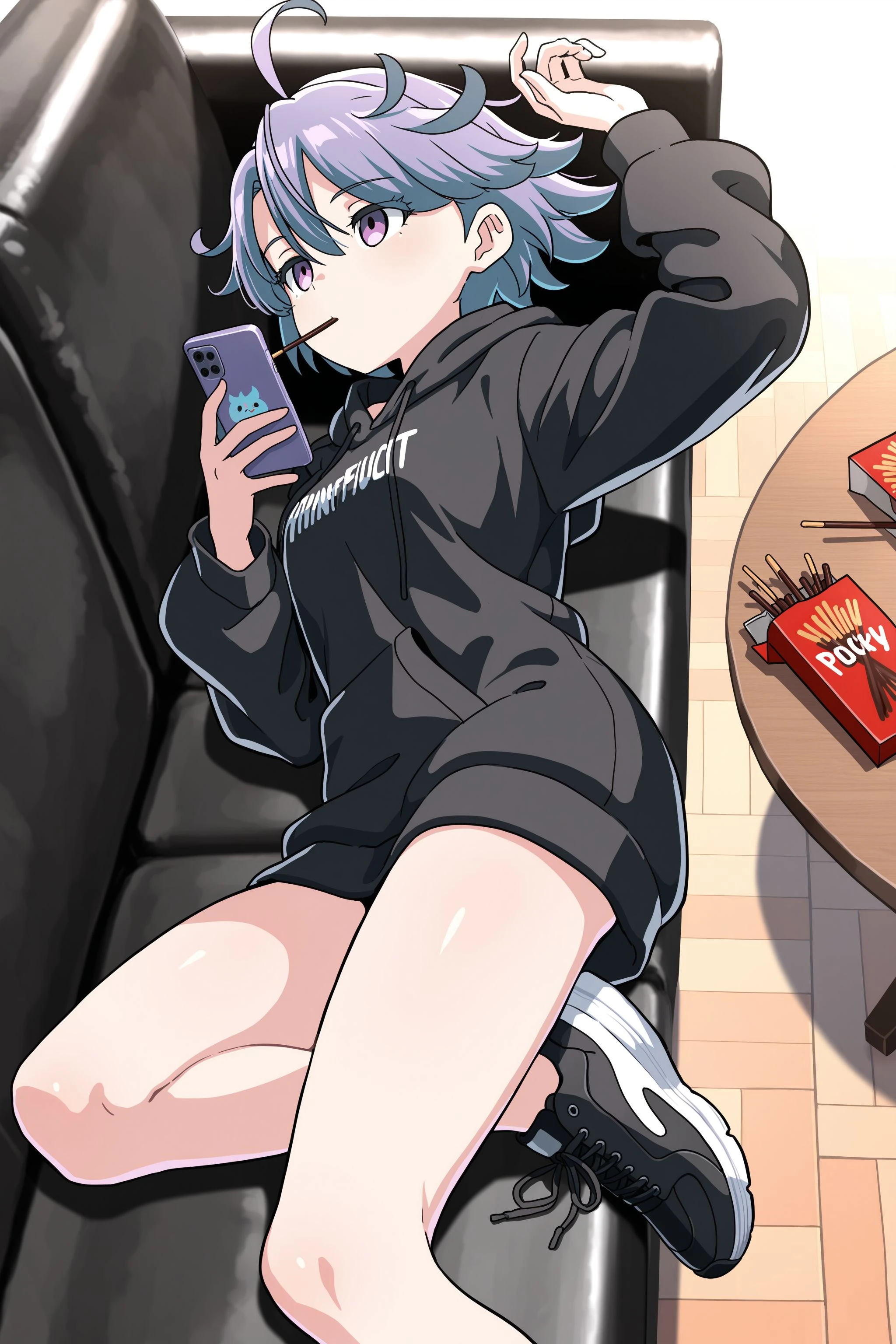 HolidayCasual: hcasual, black hoodie, hood down, drawstrings, clothes writing, bare legs, sneakers, black footwear