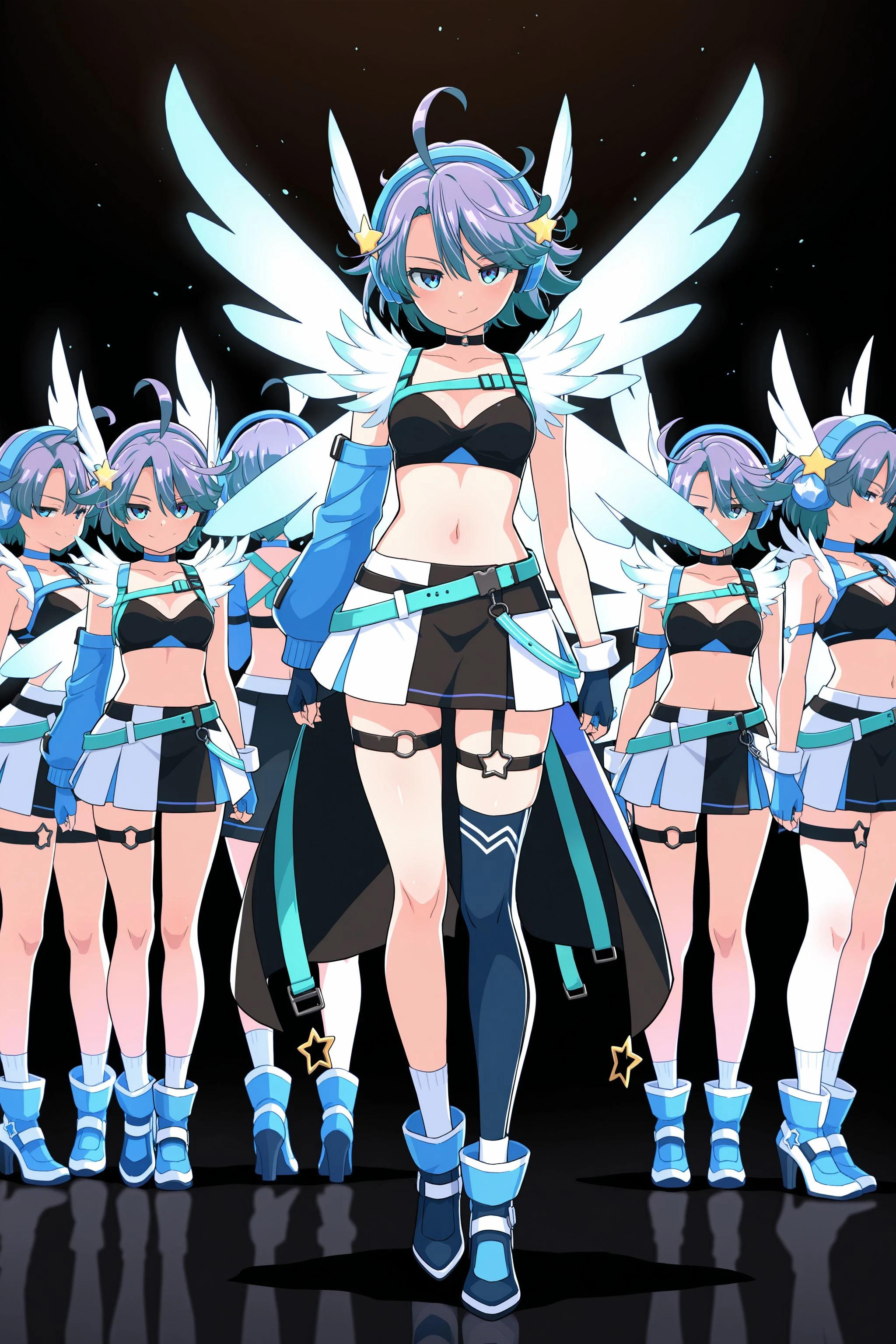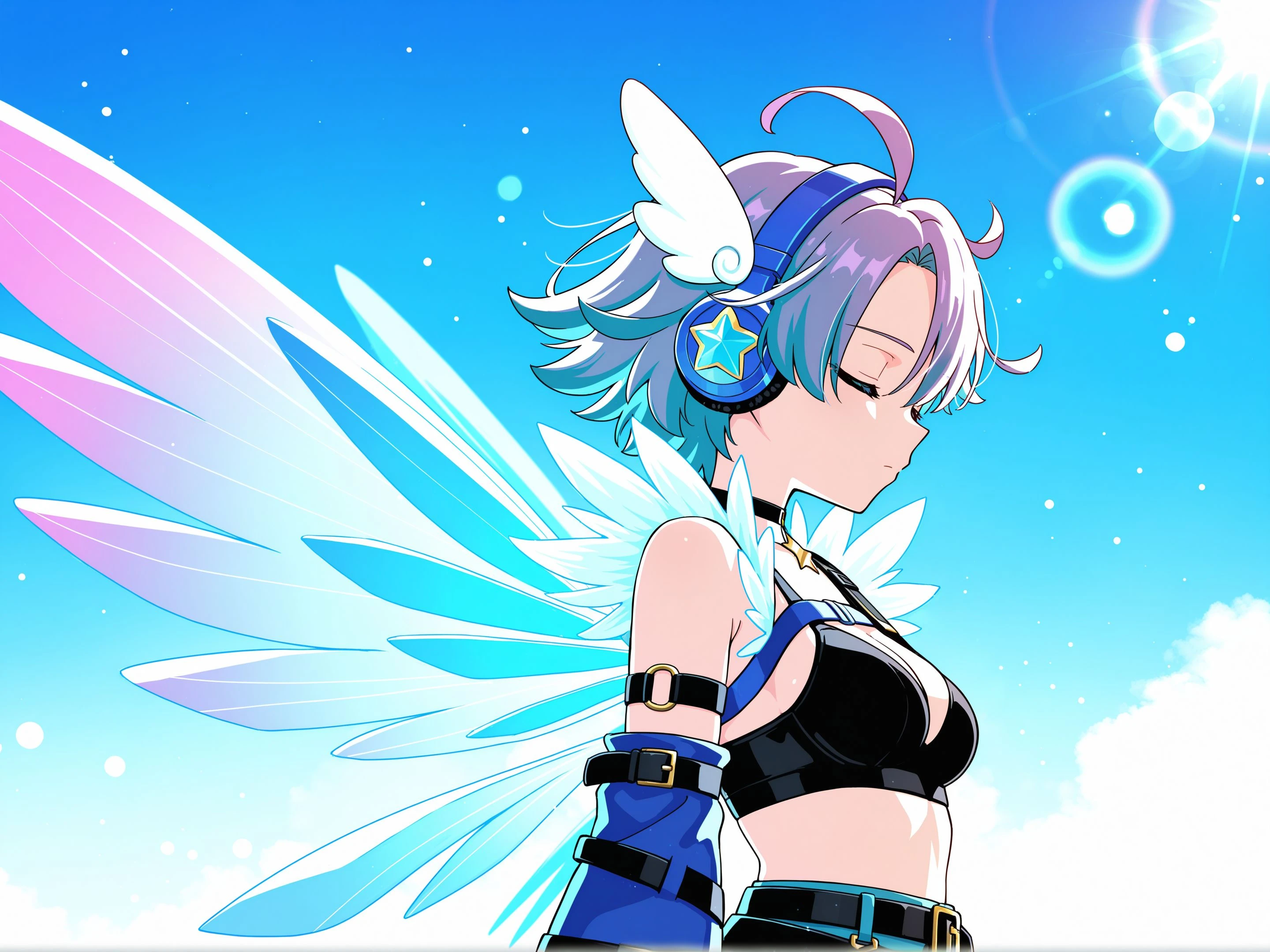 ParadoxMagica: paramagica, headphones, star \(symbol\), wing hair ornament, choker, asymmetrical clothes, feather sleeves, black bra, strap, belt, navel, single detached sleeve, blue sleeve, blue gloves, fingerless gloves, fake wings, two-tone skirt, black skirt, white skirt, miniskirt, asymmetrical legwear, thigh strap, blue single thighhigh, white socks, blue footwear, heels