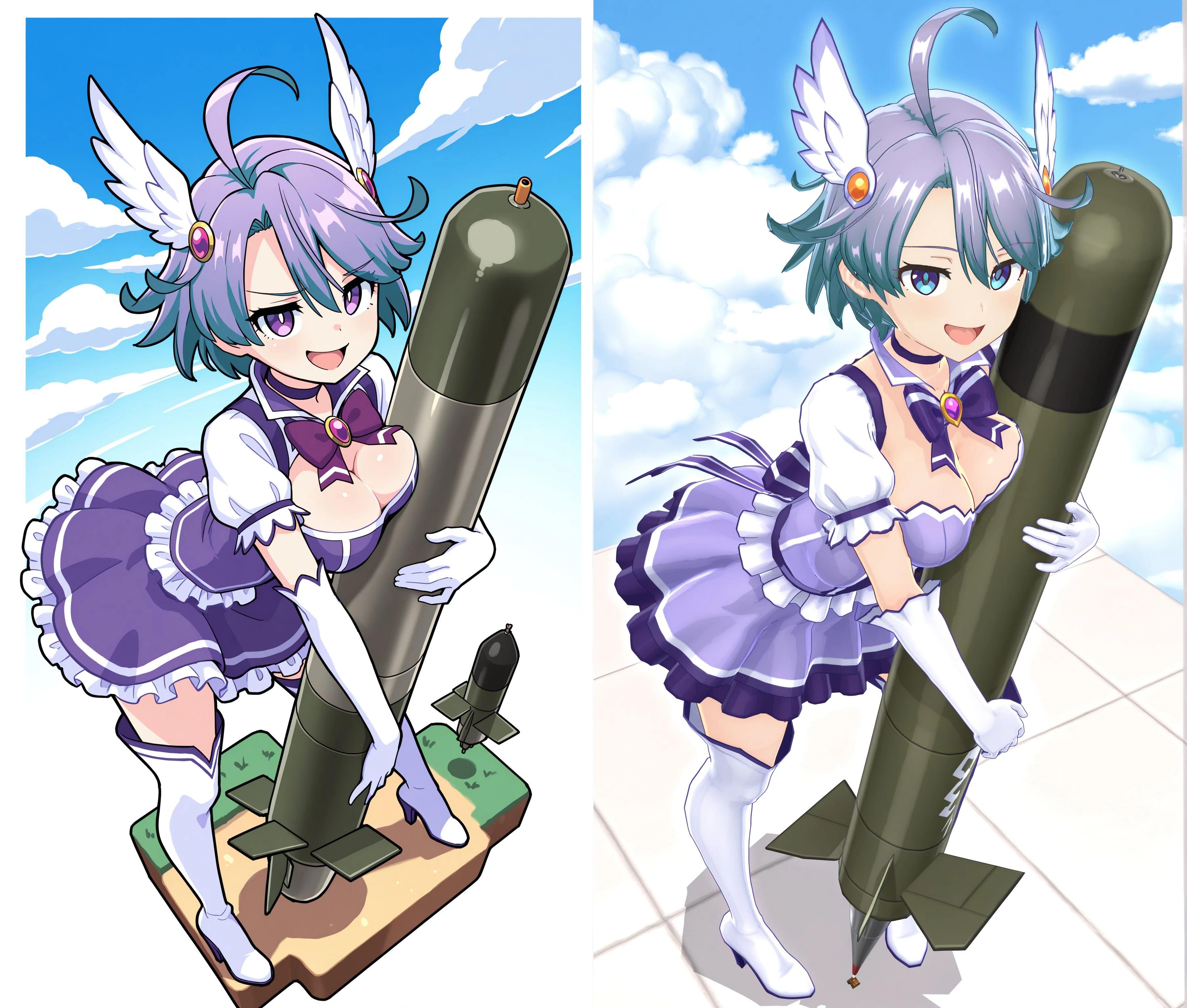 Magica2019: magica2019, wing hair ornament, choker, purple dress, purple bowtie, brooch, purple bow, short sleeves, cleavage, white gloves, elbow gloves, purple skirt, frills, thigh boots, white footwear, heels