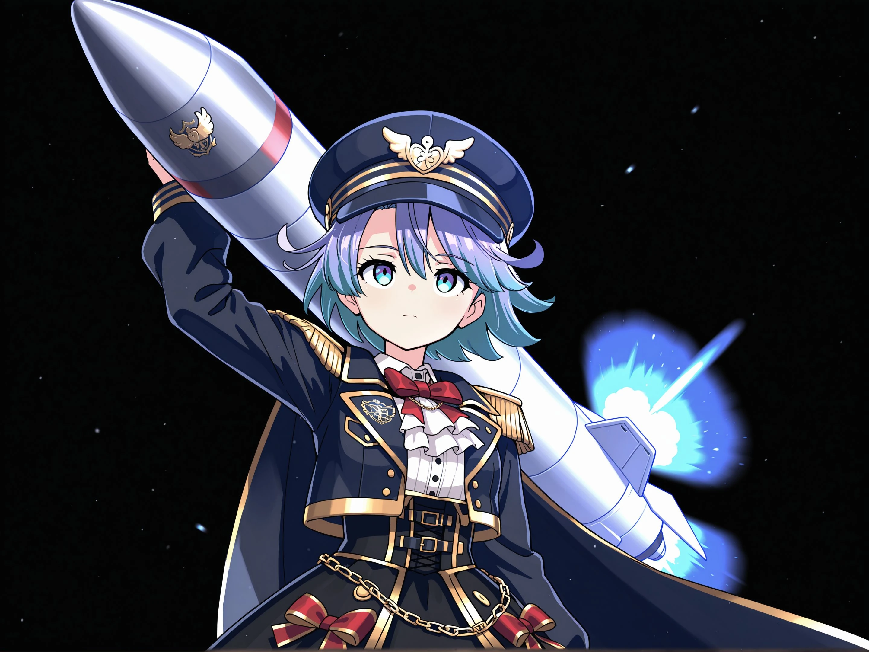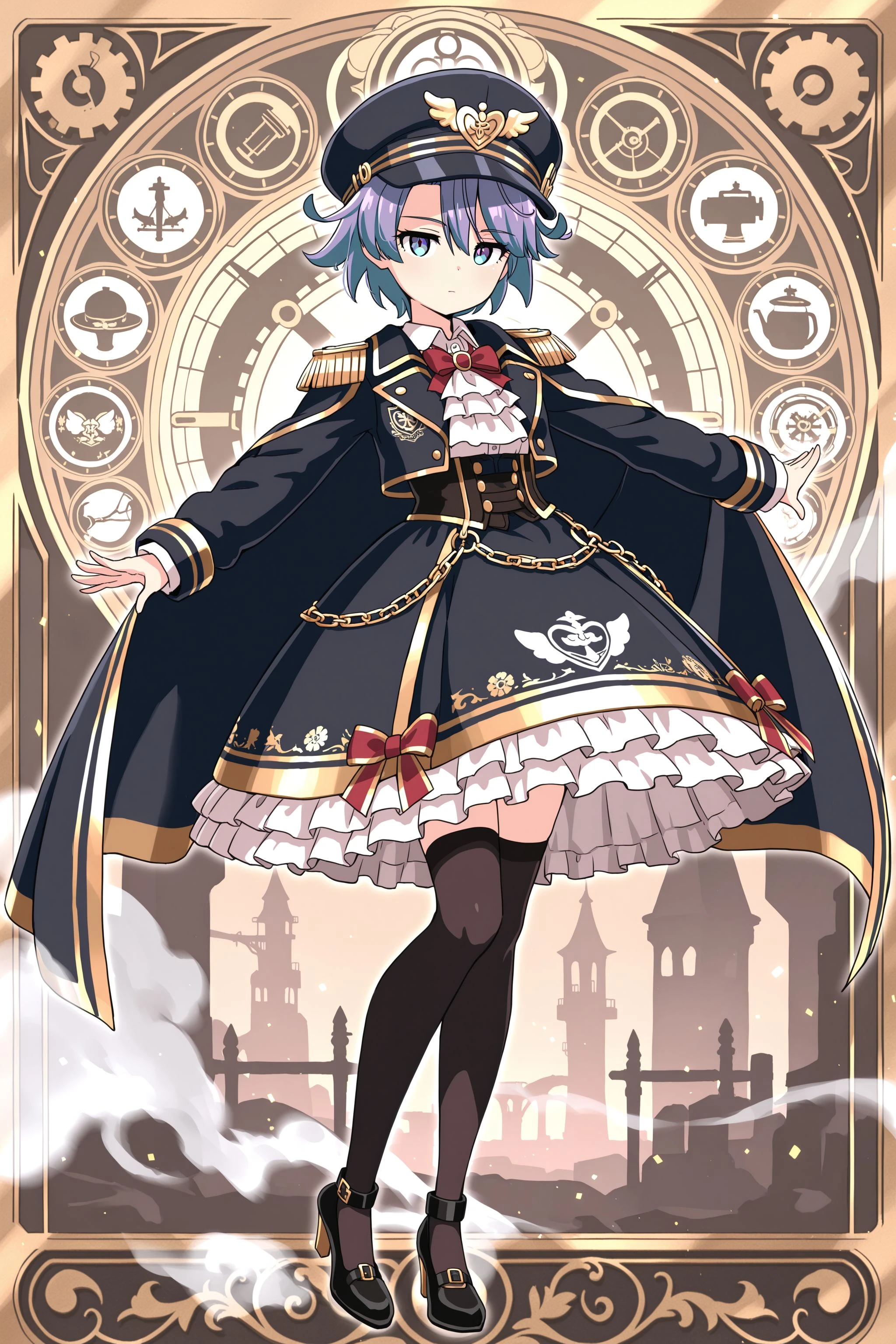 MagicaMaiden: magicamaiden, militaly hat, peaked cap, emblem, black jacket, epaulettes, long sleeves, gold trim, white collared shirt, red bowtie, white ascot, black dress, buttons, chain, red bow, black cape, frilled skirt, black thighhighs, black footwear, heels