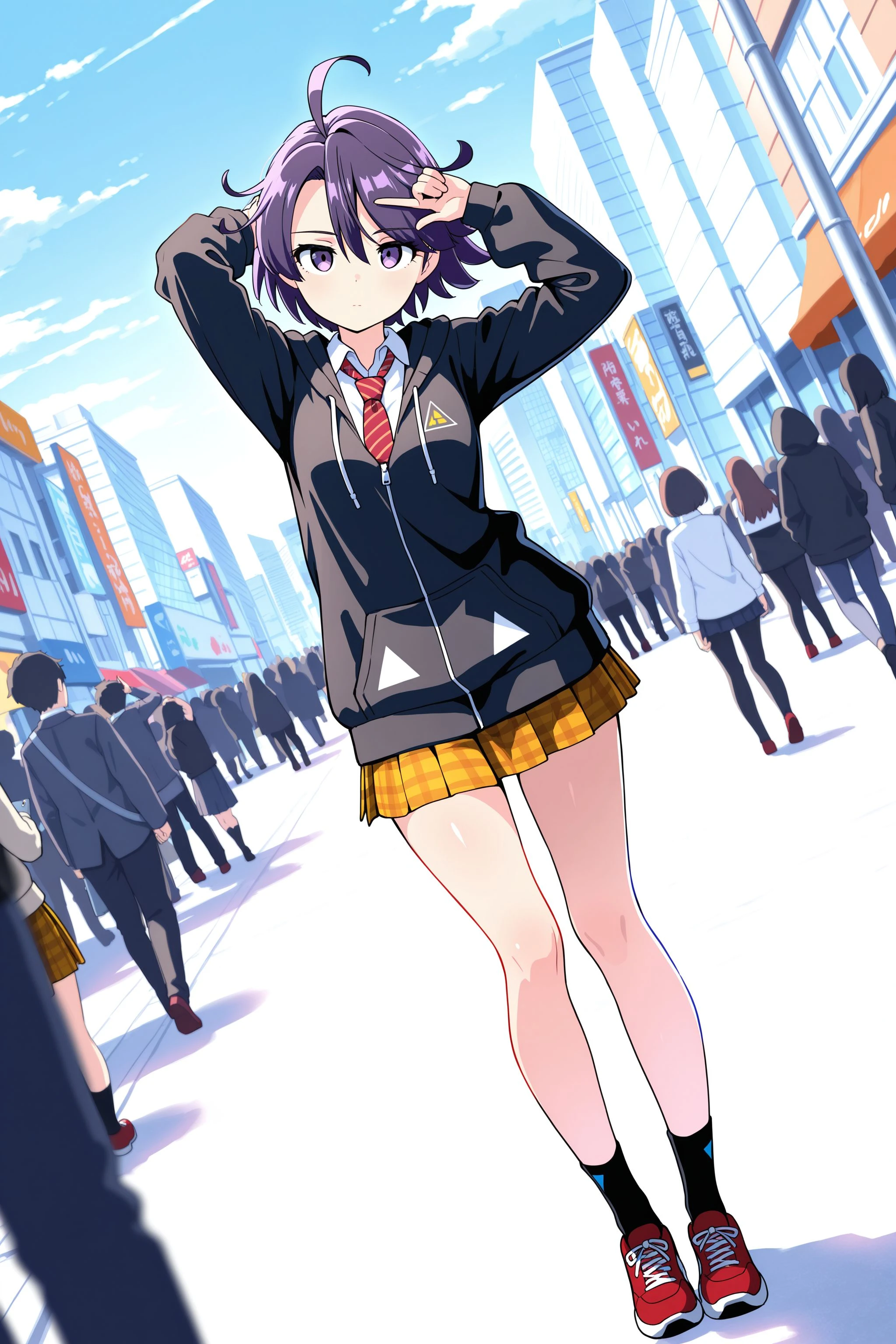 SchoolUniform: school uniform, black hoodie, long sleeves, white collared shirt, red necktie, striped necktie, yellow plaid skirt, miniskirt, black socks, red footwear, sneakers