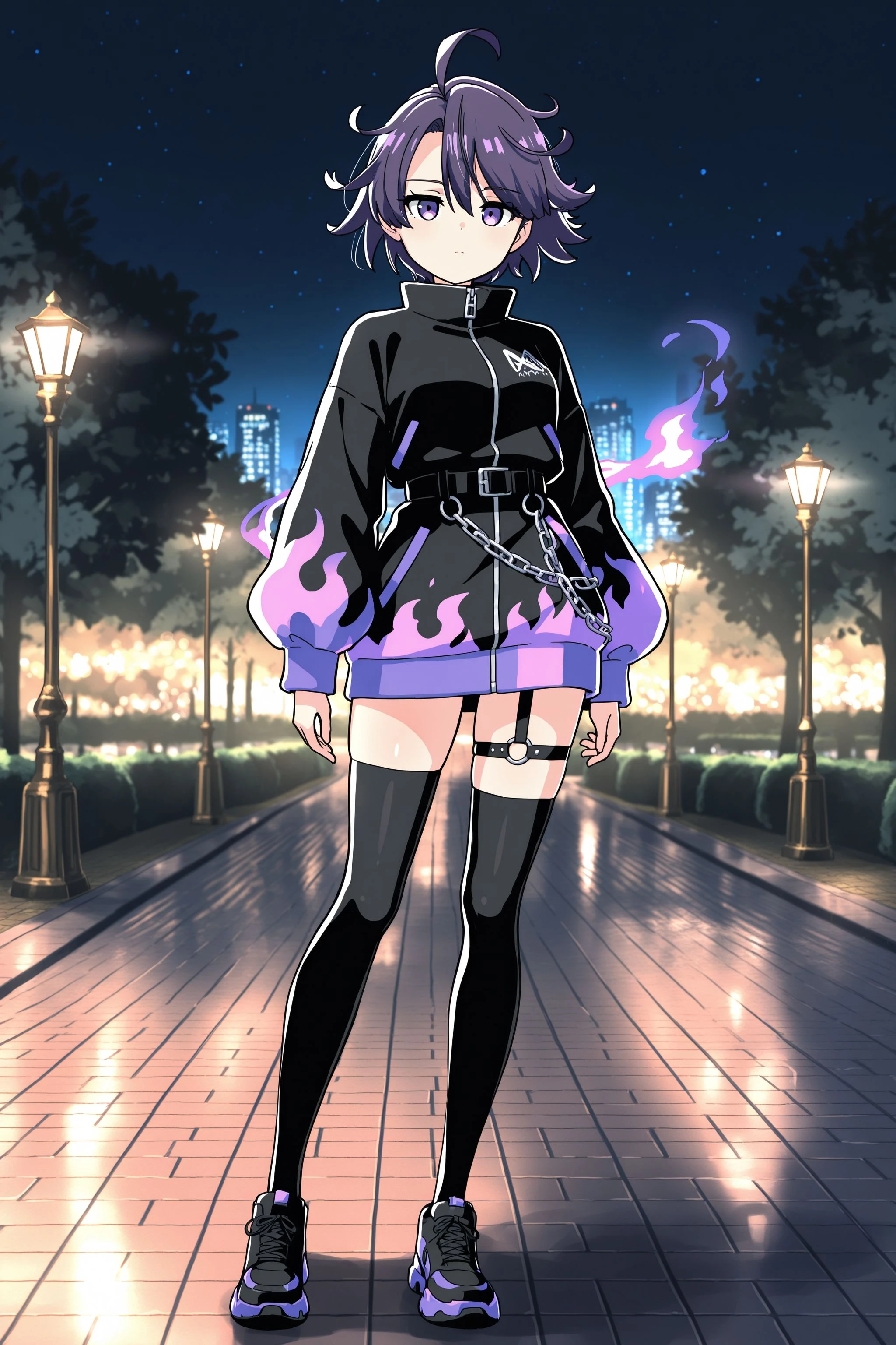 concept: black jacket, purple flame print, puffy long sleeves, black belt, chain, black thighhighs, single garter strap, black sneakers,