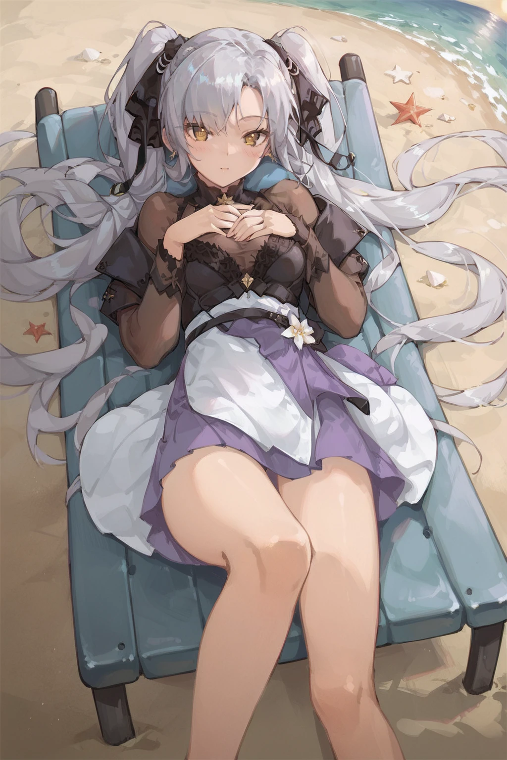 aug para, twintails, yellow eyes, grey hair, bangs, skirt, bow, bag, thighhighs, black footwear, very long hair, full body