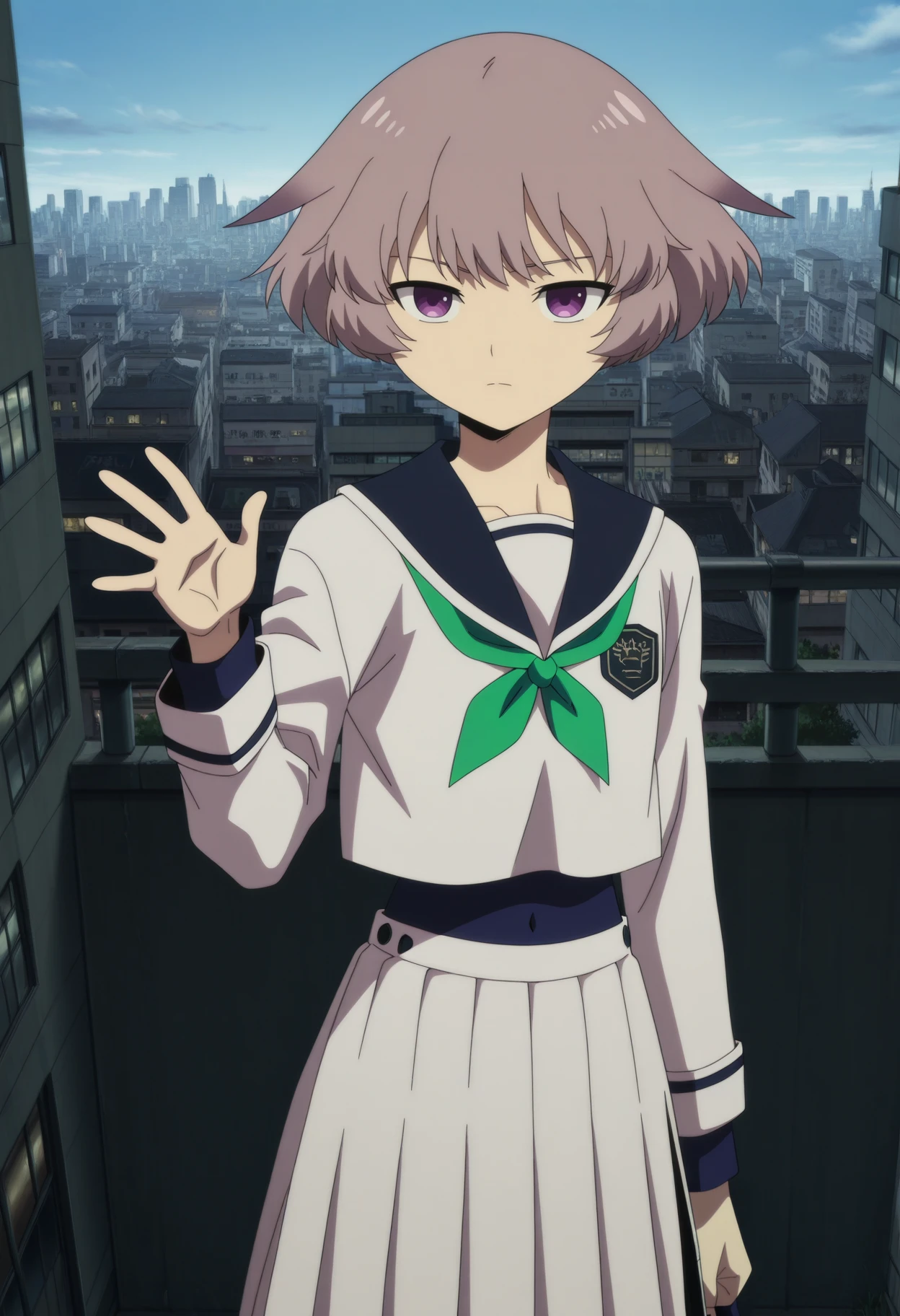 short hair, grey hair, gradient hair, purple eyes, serafuku