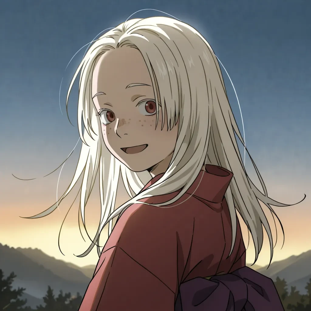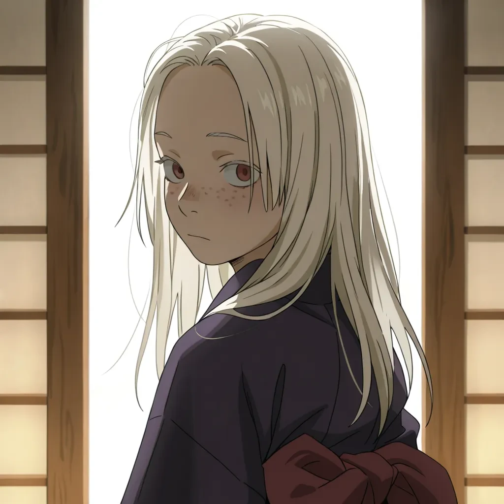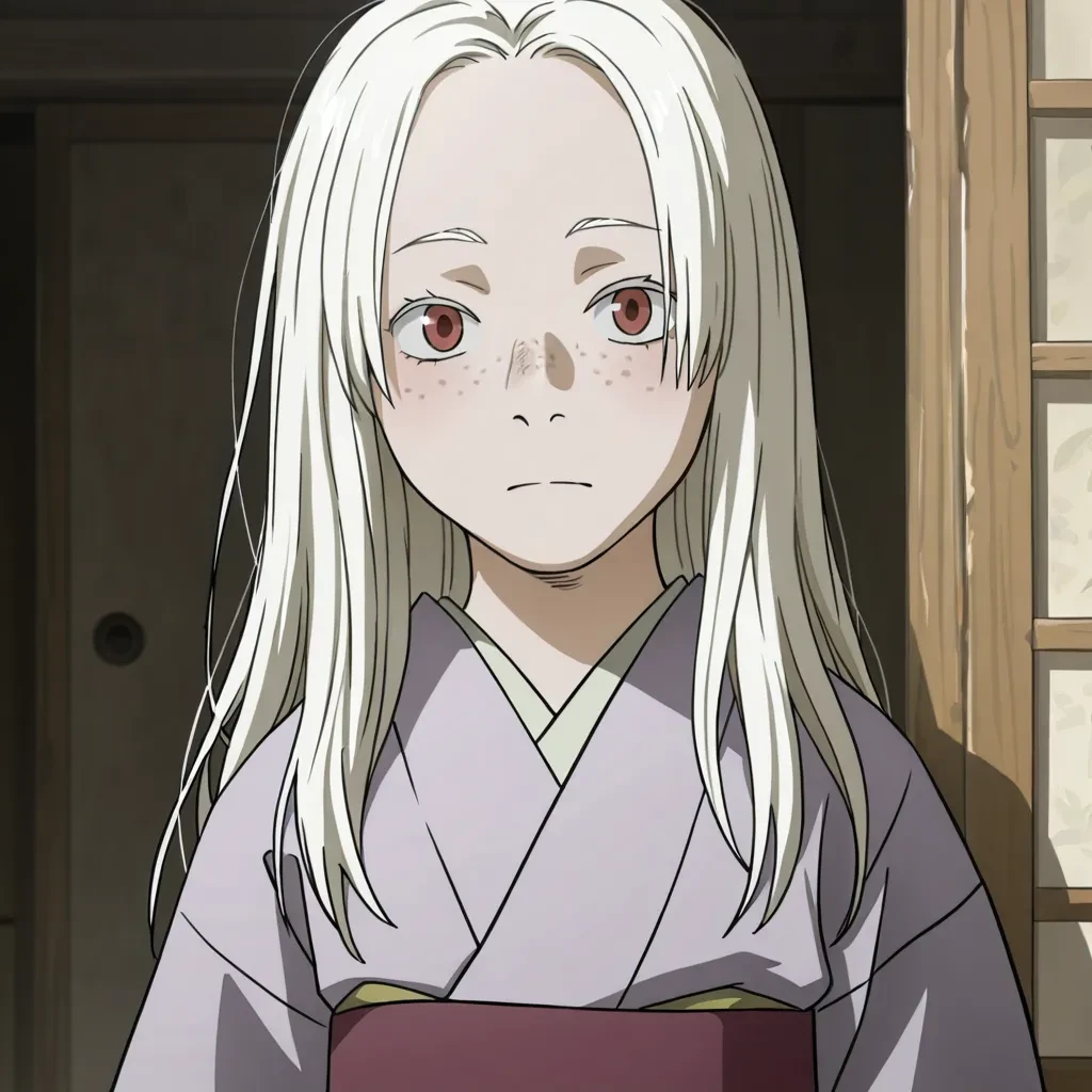 Hiyori / ヒヨリ. Mushishi Tokubetsu-hen: Hihamukage.Trigger words:H1y0r7, 1girl, solo, long hair, freckles, white hair, red eyes, japanese clothes, blonde hair, kimono