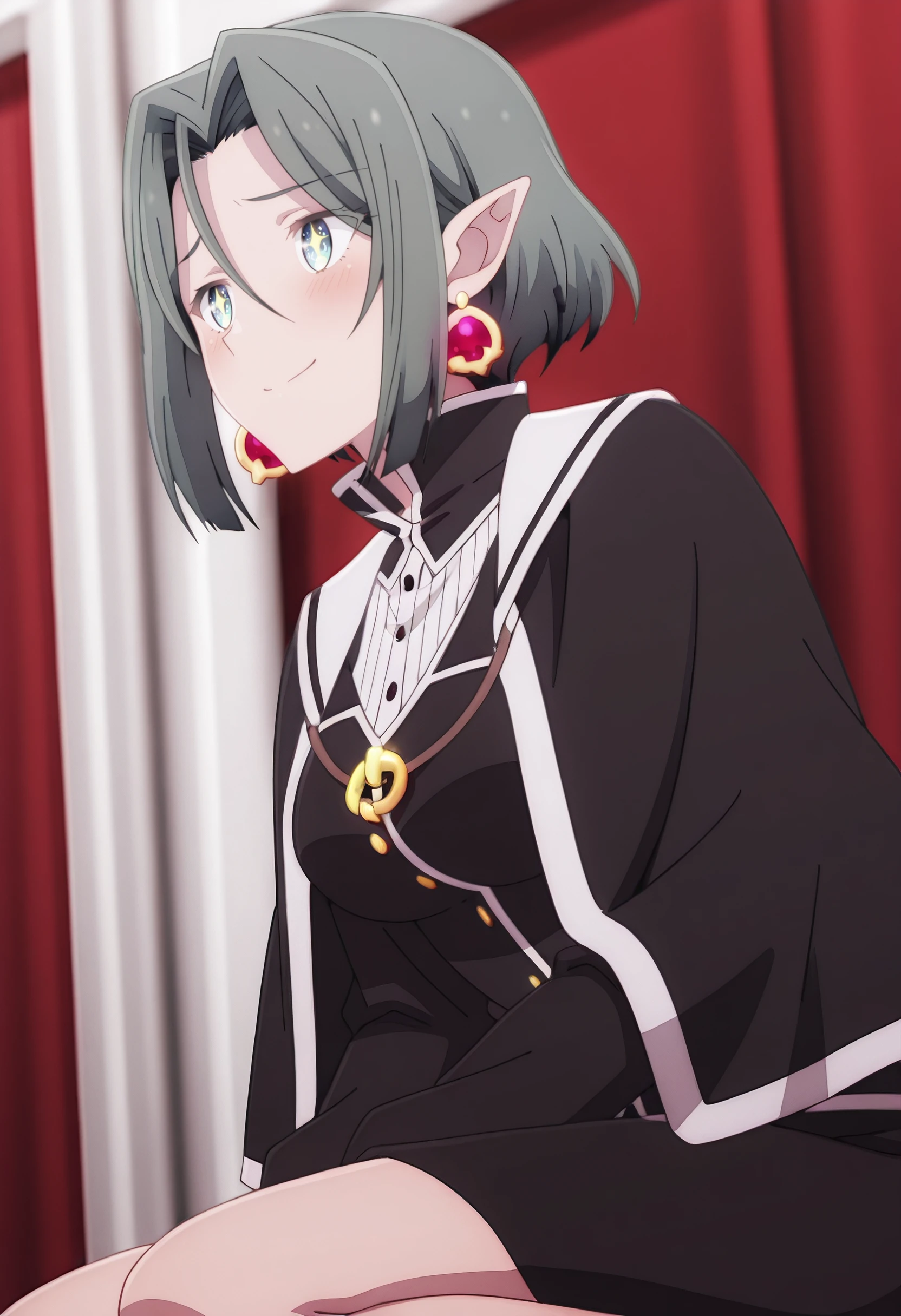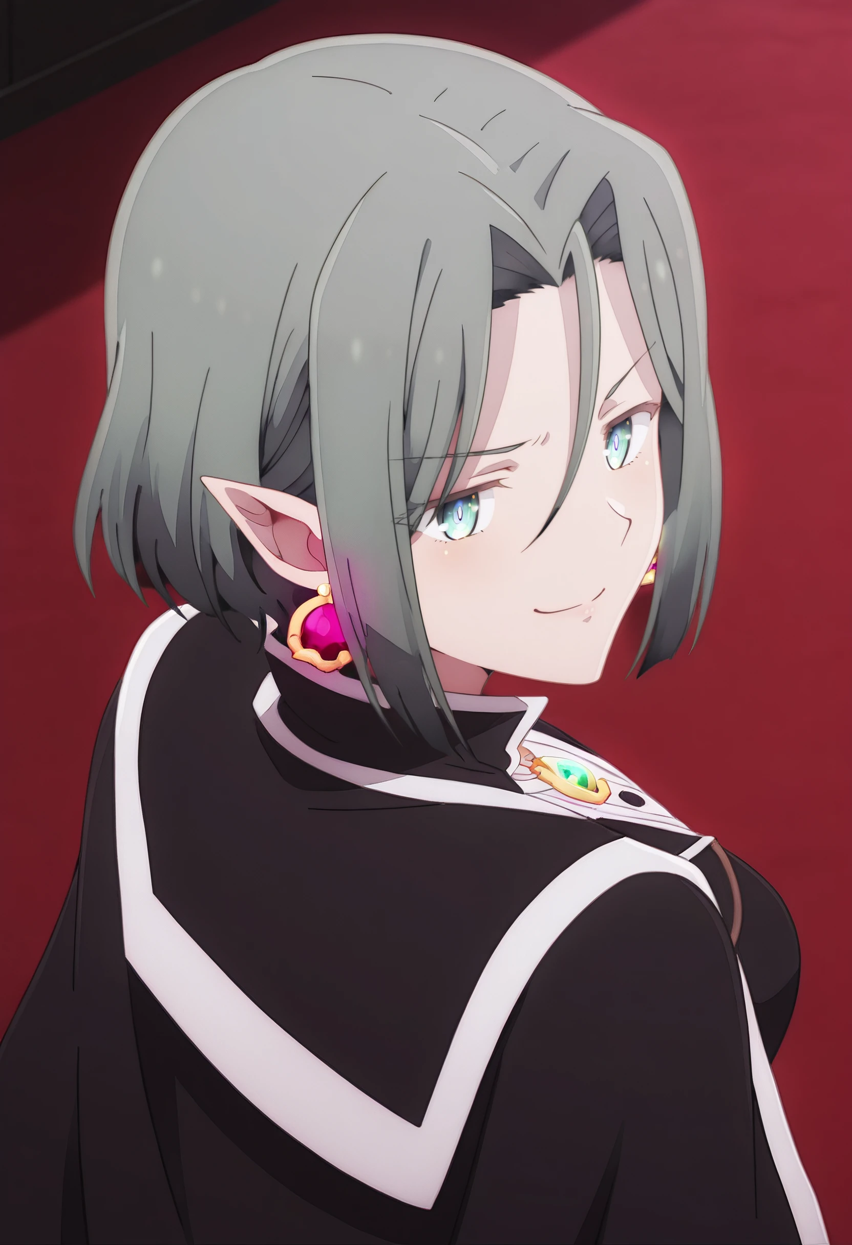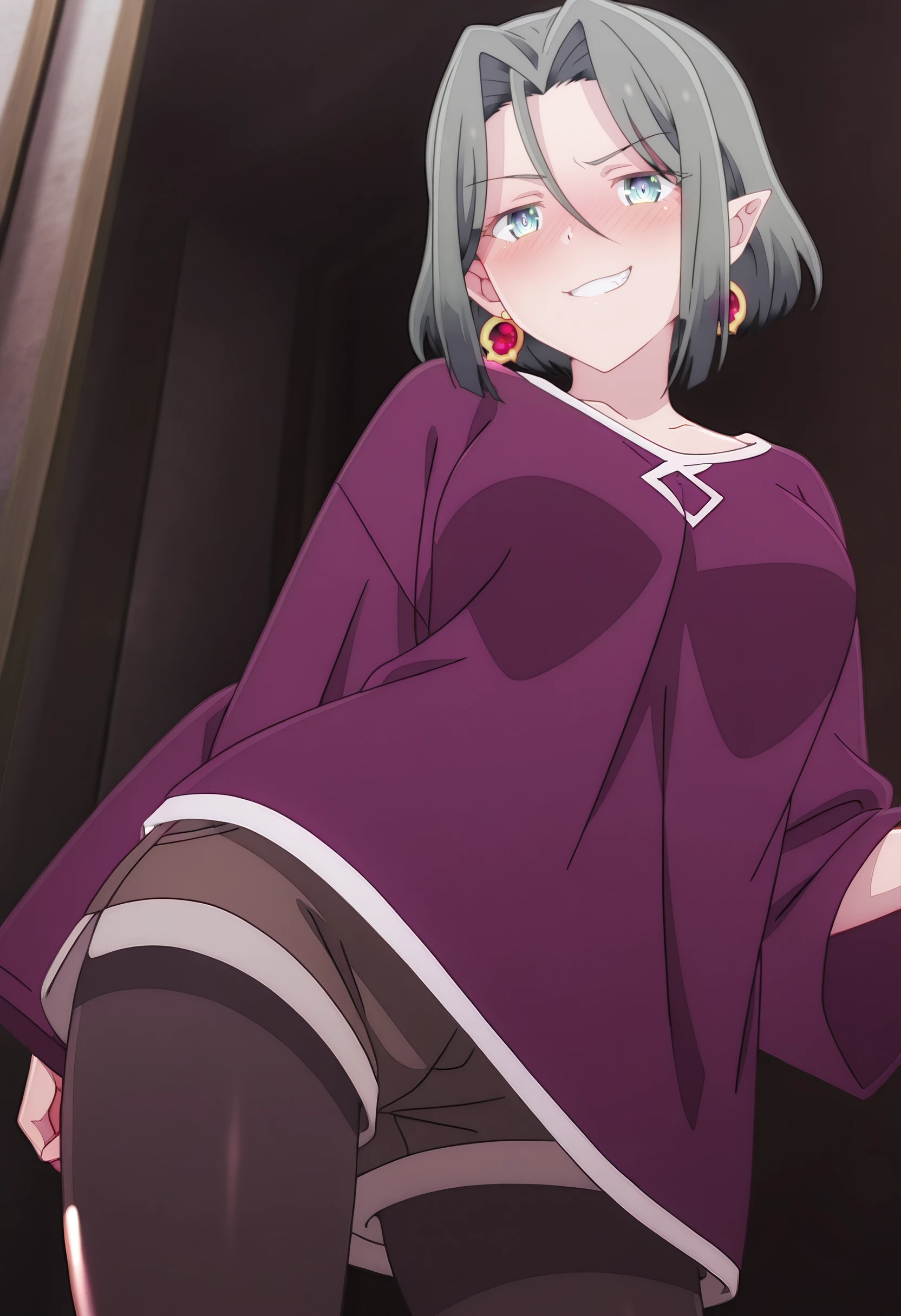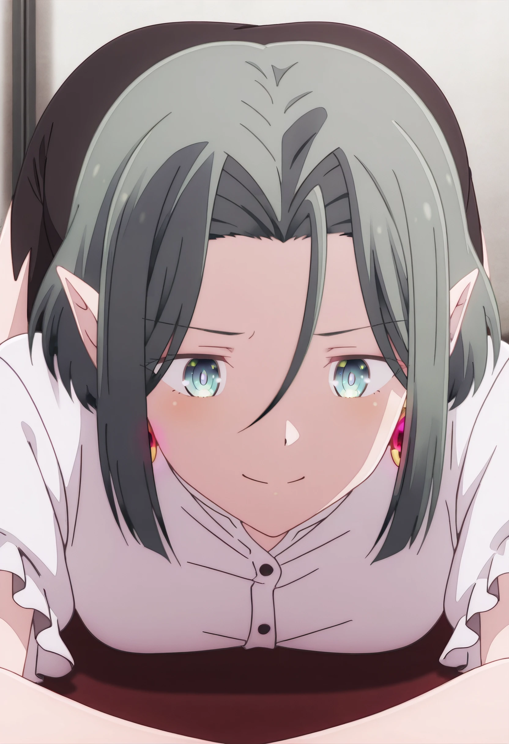 MGNMenou, short hair, pointy ears, hair between eyes, blue eyes, grey hair, hair intakes, elf,