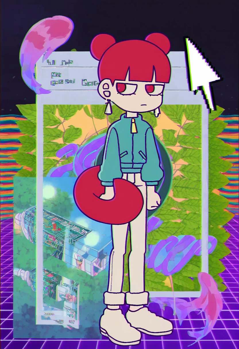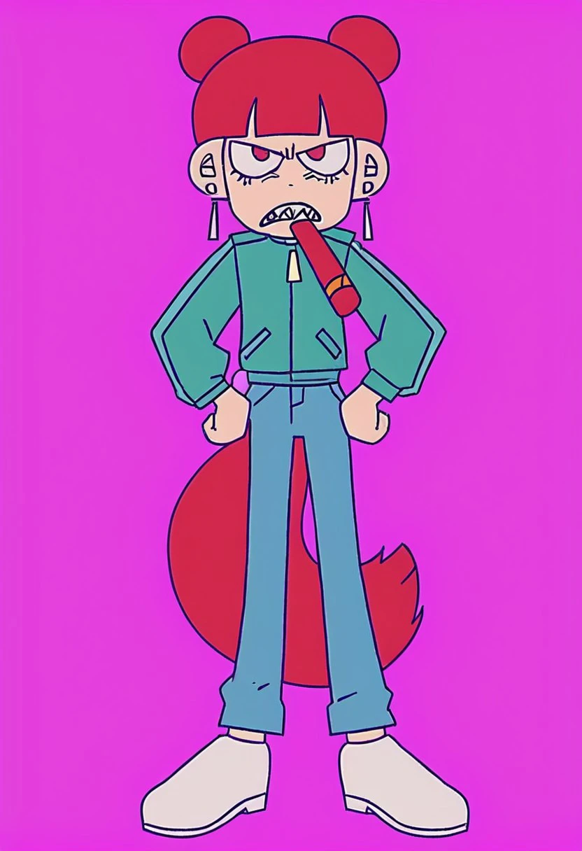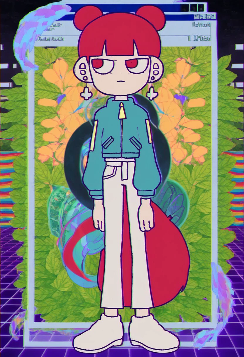 Triggers: daram, 1girl, solo, double bun, hair bun, earrings, bangs, blunt bangs, tail, dress, jacket, pants, boots, white footwear