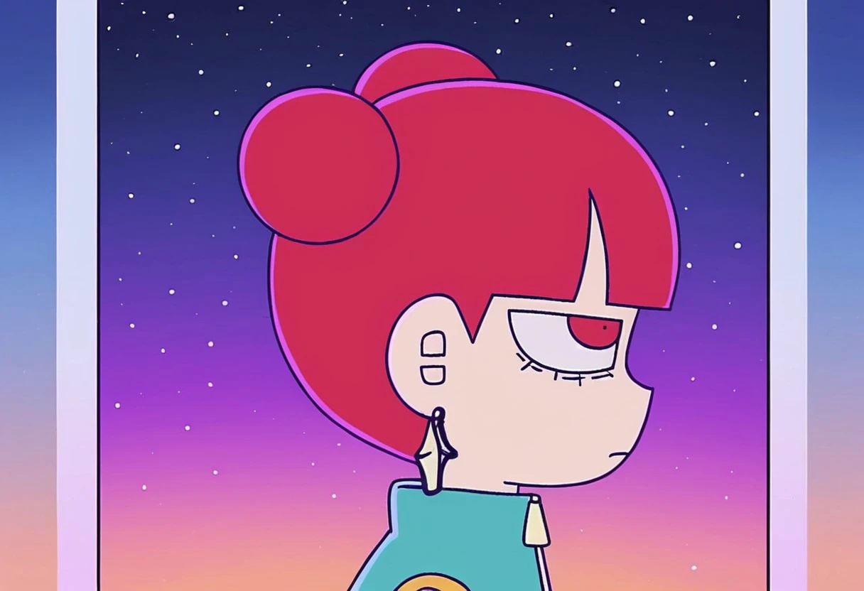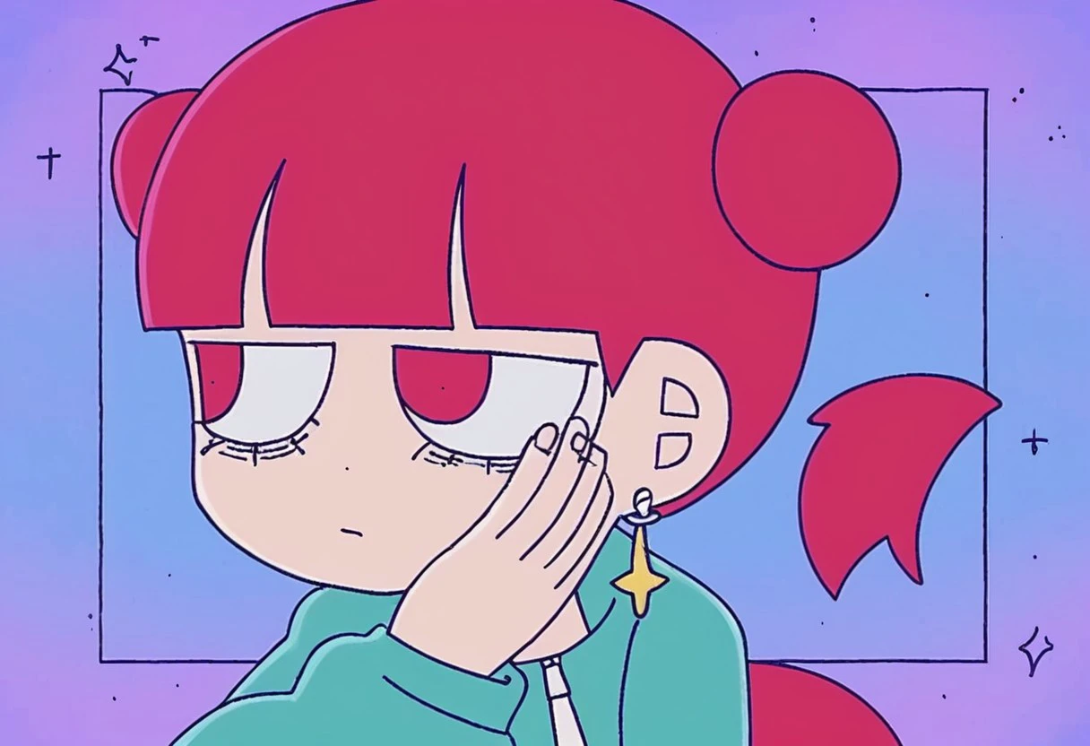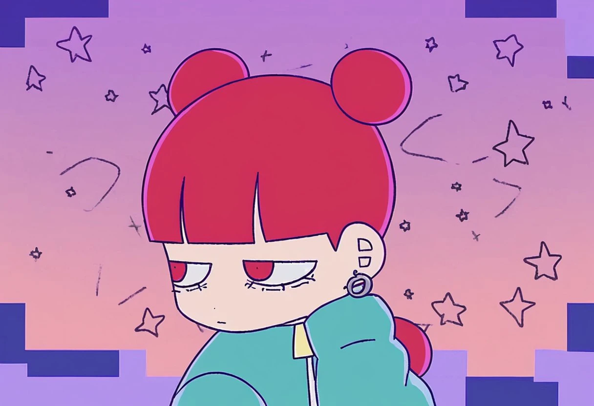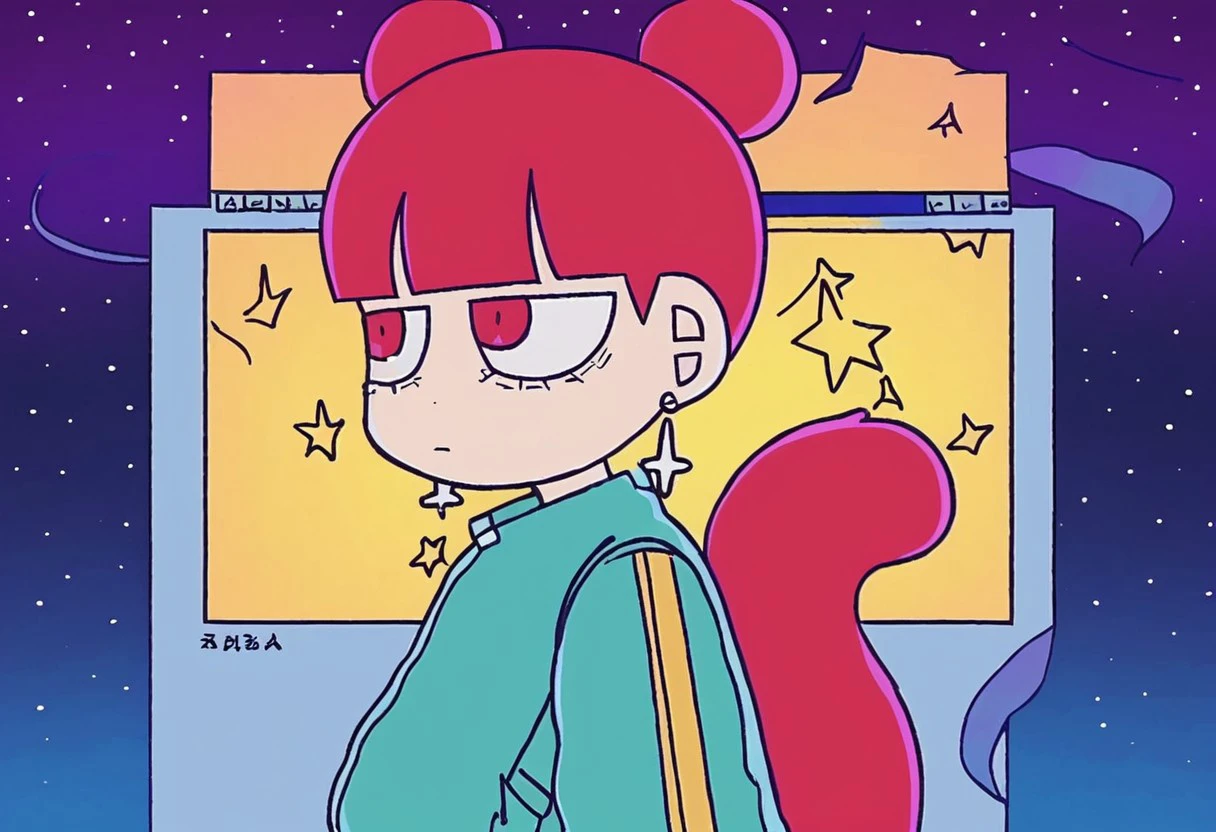 Triggers: daram, 1girl, solo, double bun, hair bun, earrings, bangs, blunt bangs, tail, dress, jacket, pants, boots, white footwear