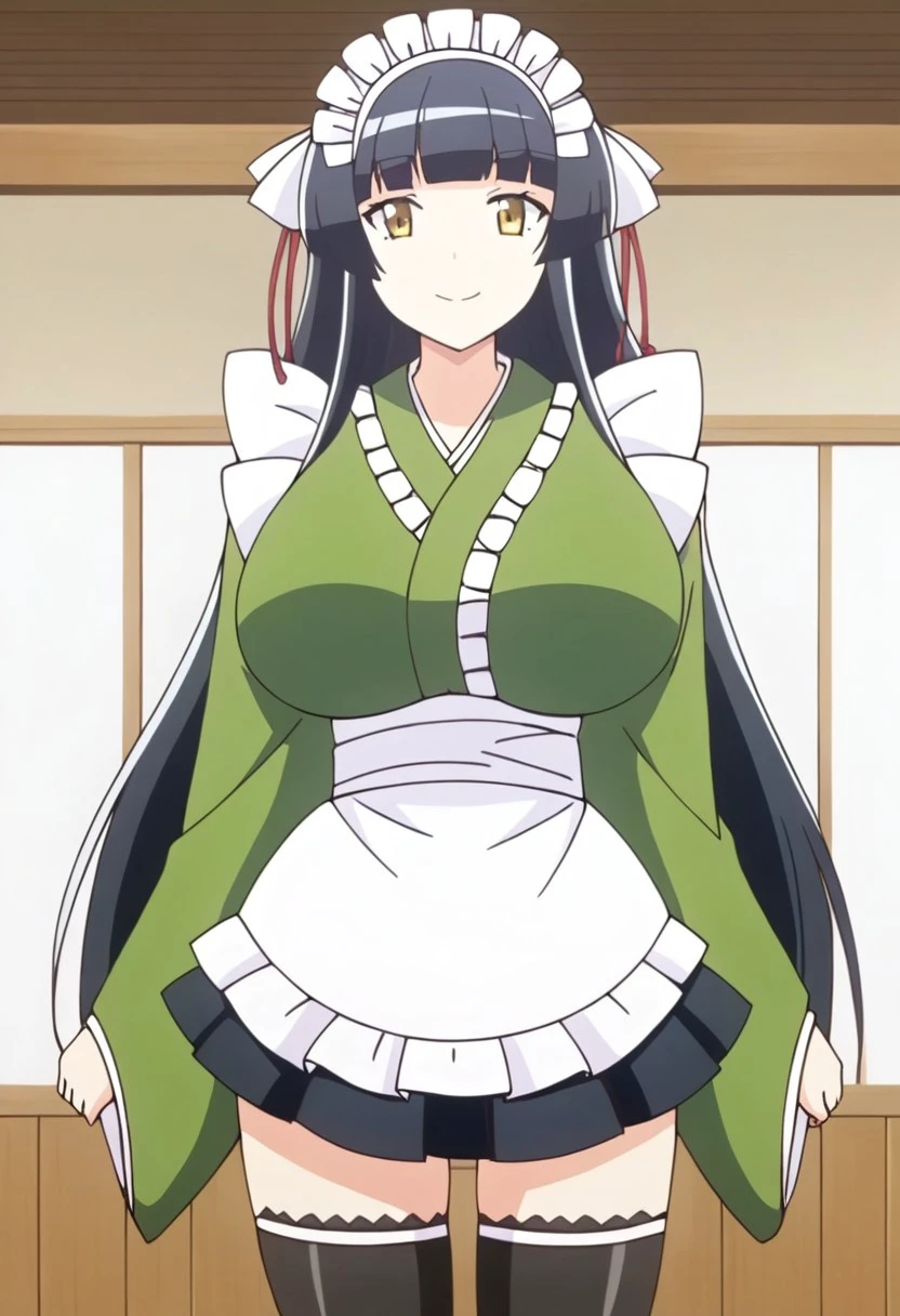 misaki sayama, black hair, long hair, blunt bangs, sidelocks, hair bow, white bow, hair ornament, yellow eyes, maid headdress, wa maid, japanese clothes, green kimono, long sleeves, wide sleeves, maid apron, white apron, waist apron, black skirt, pleated skirt, black thighhighs, huge breasts,