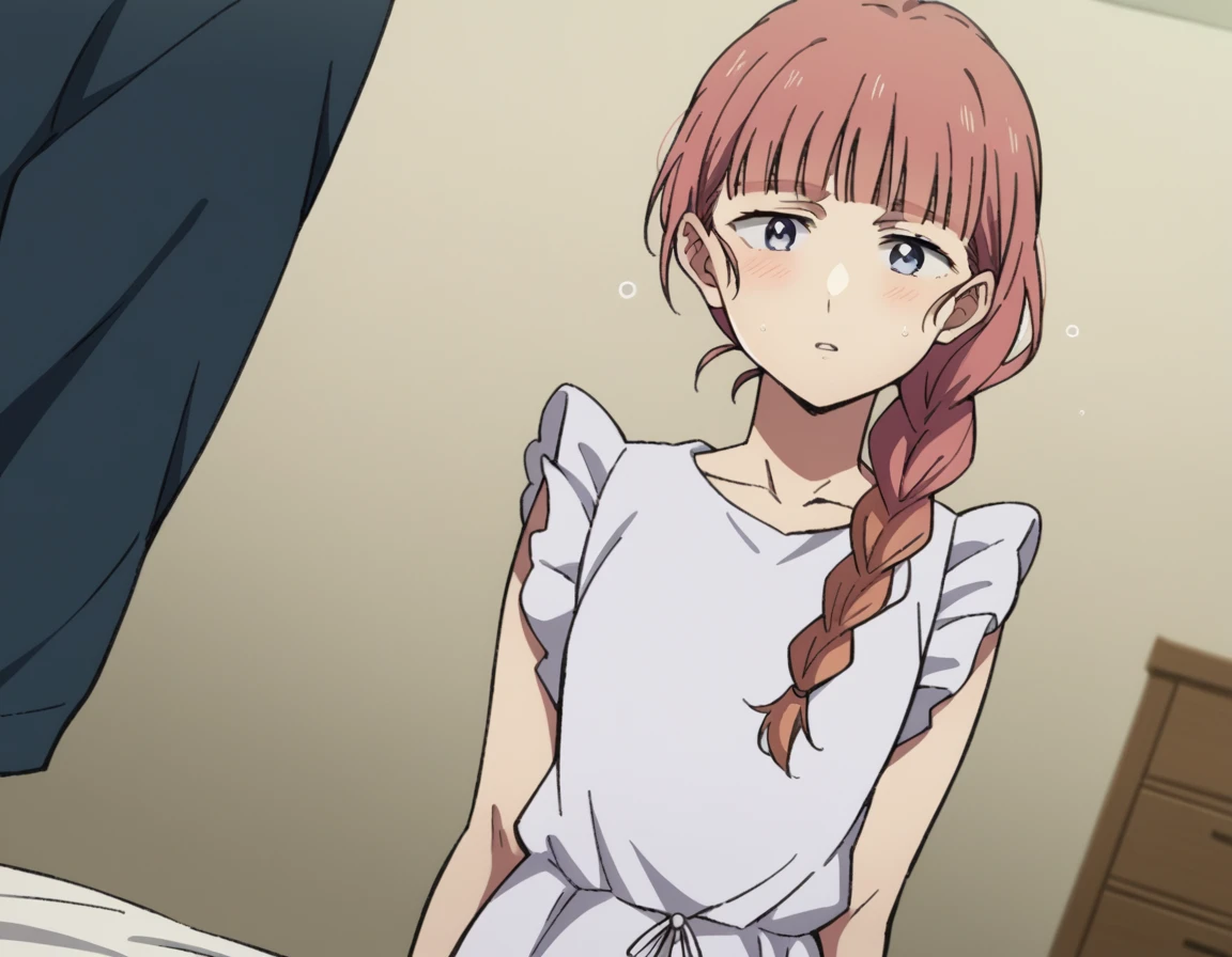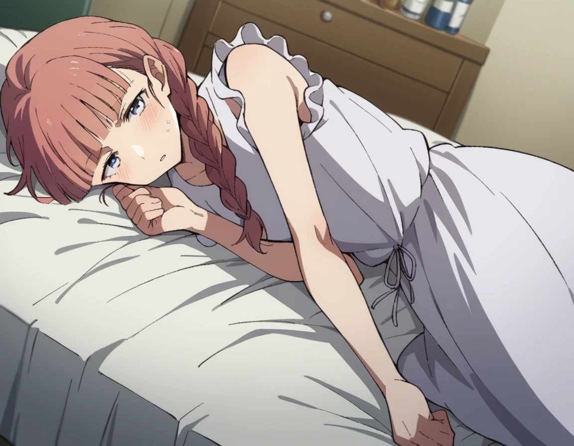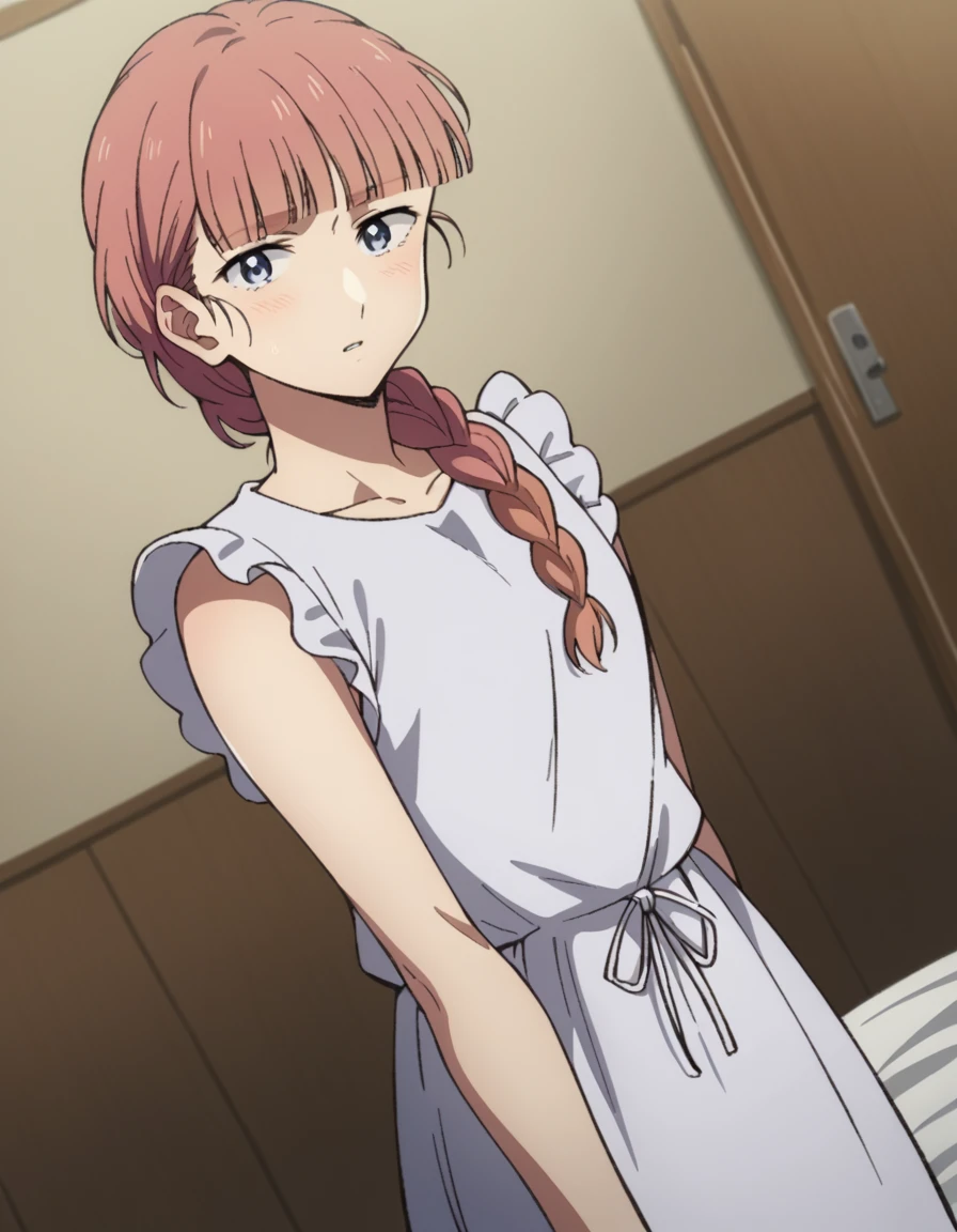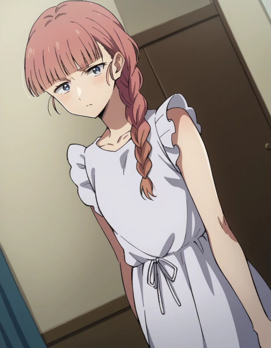 tokiko hishigata, long hair, bangs, brown hair, blue eyes, braid, blunt bangs, single braid, hair over shoulder,