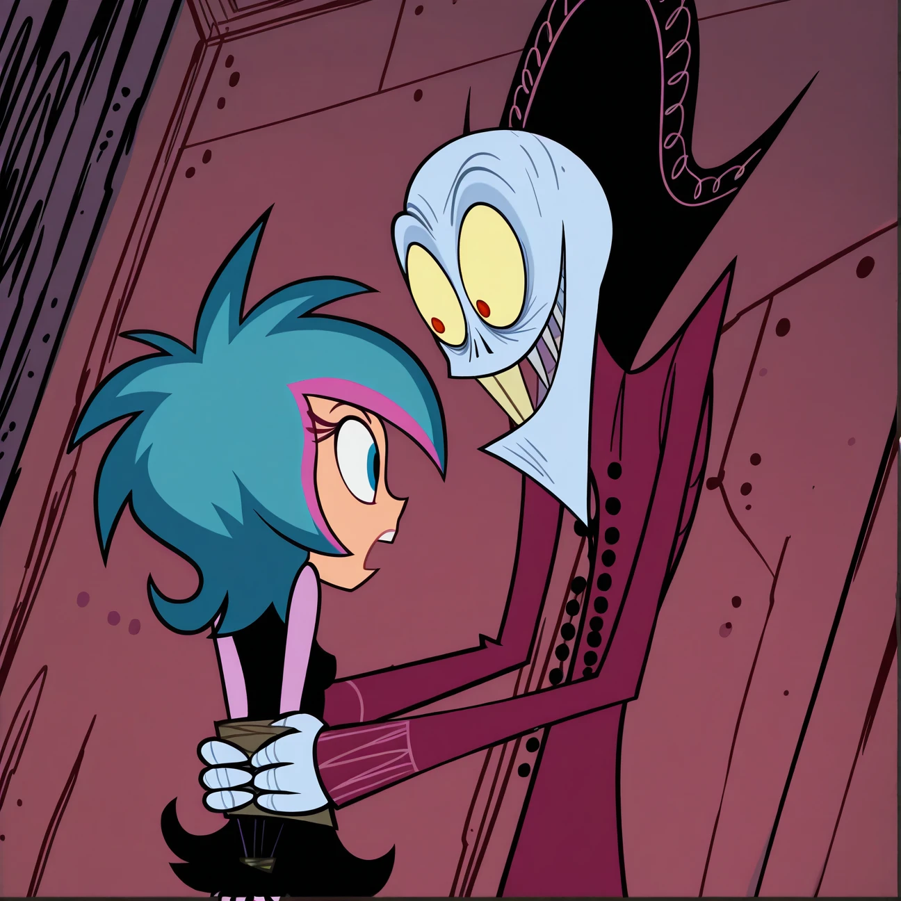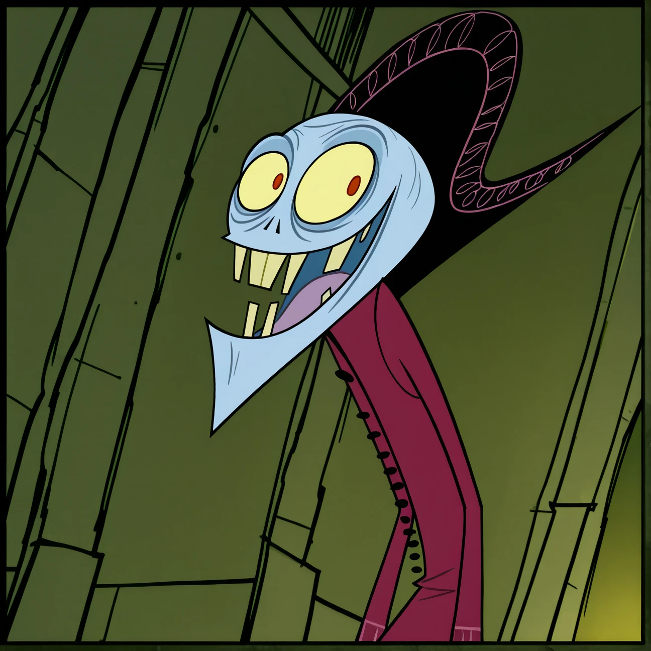 Baron Vain: v41n, 1boy, solo, creature, male focus, bald, colored skin, red eyes, colored sclera, wide-eyed, yellow sclera, teeth, fangs, bulging eyes, yellow teeth, grey skin, blue skin, high collar, red suit, old, claws