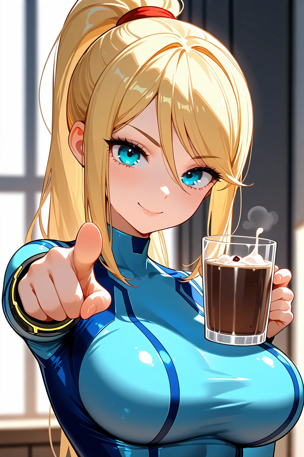 looking at viewer, holding cup, pointing at viewer, smile