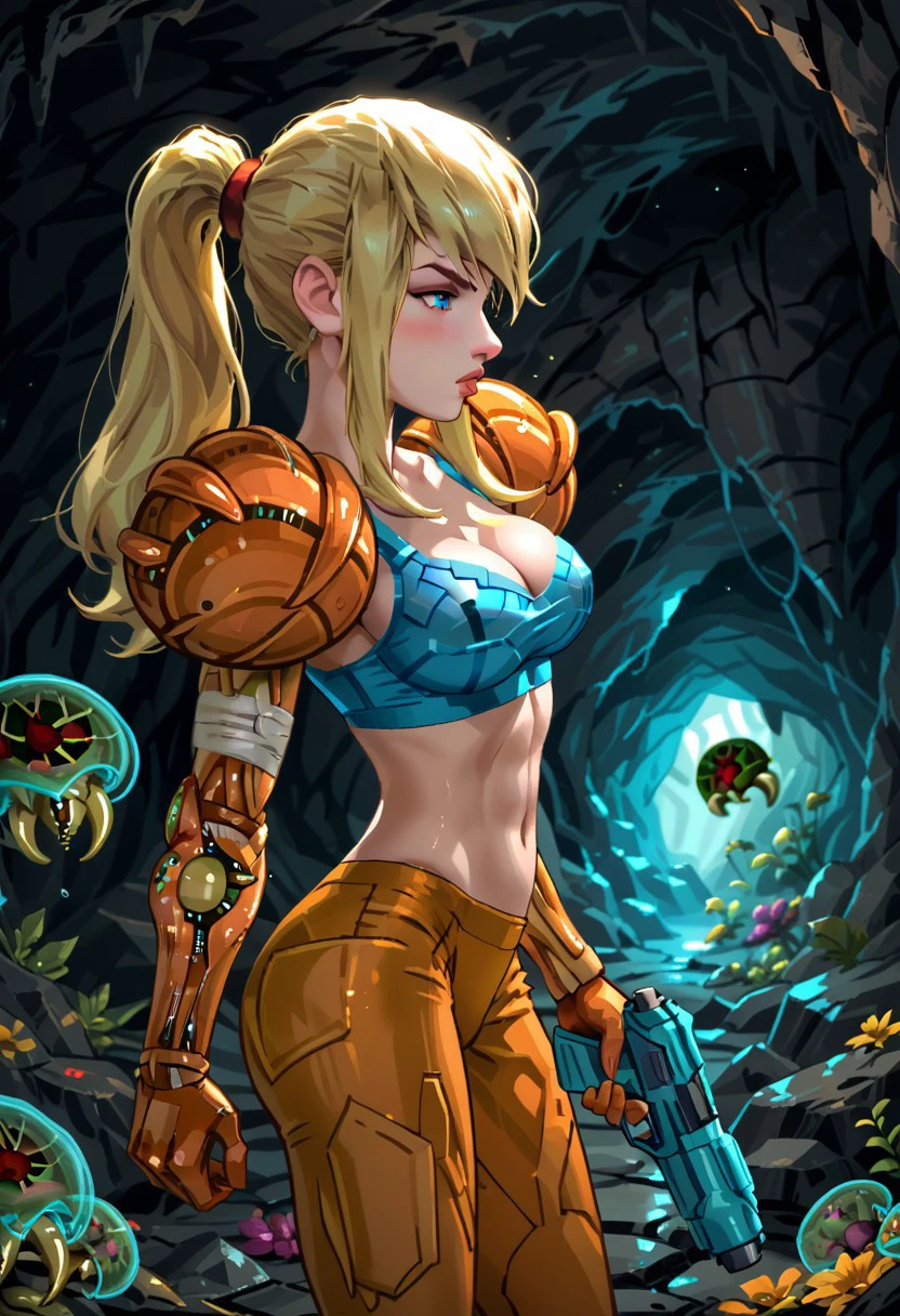 1girl, blonde hair, power suit (metroid), plsamus, blue eyes, solo, ponytail,bandage bra, pants, gun arm, inside, cave