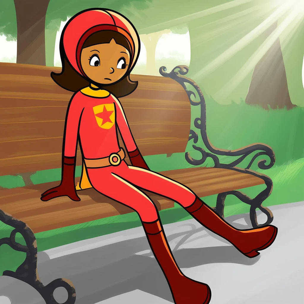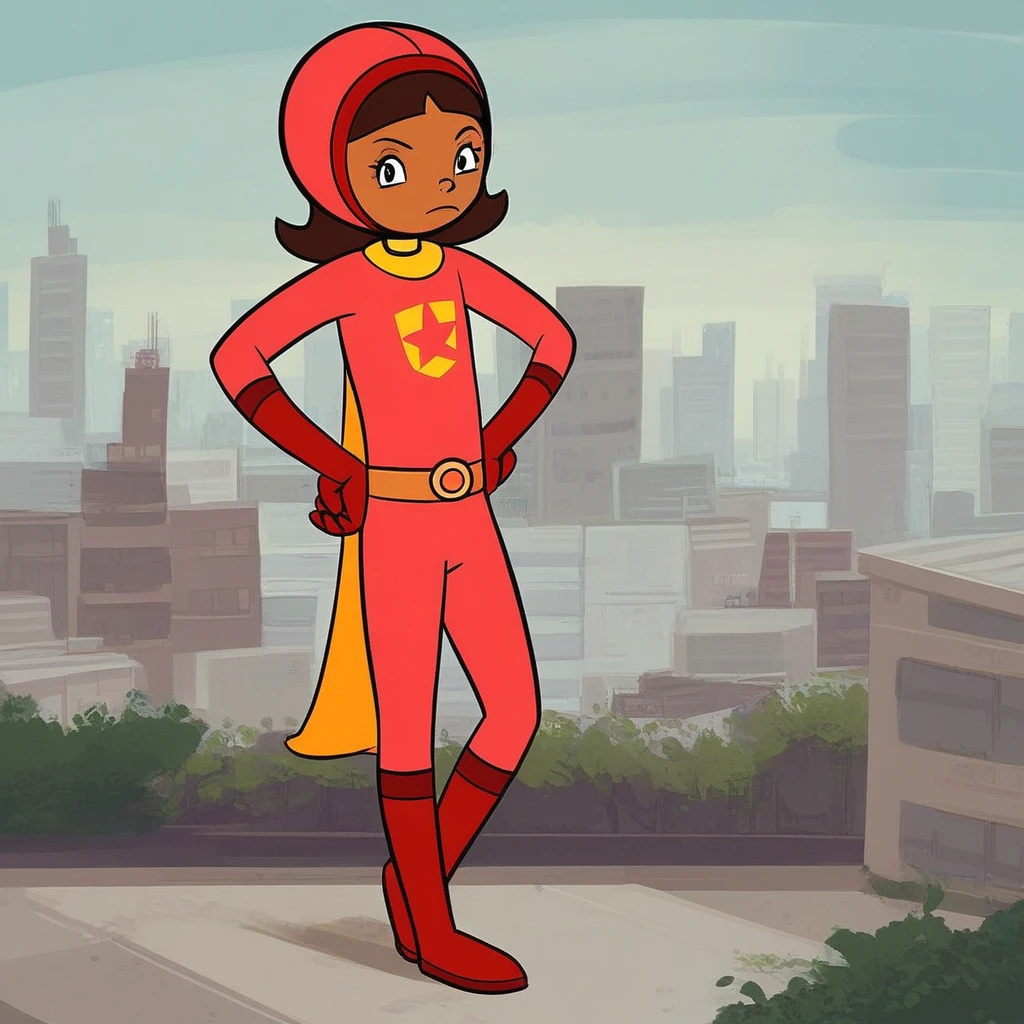 wordgirl, brown hair, dark skin, bodysuit, gloves, belt, boots,