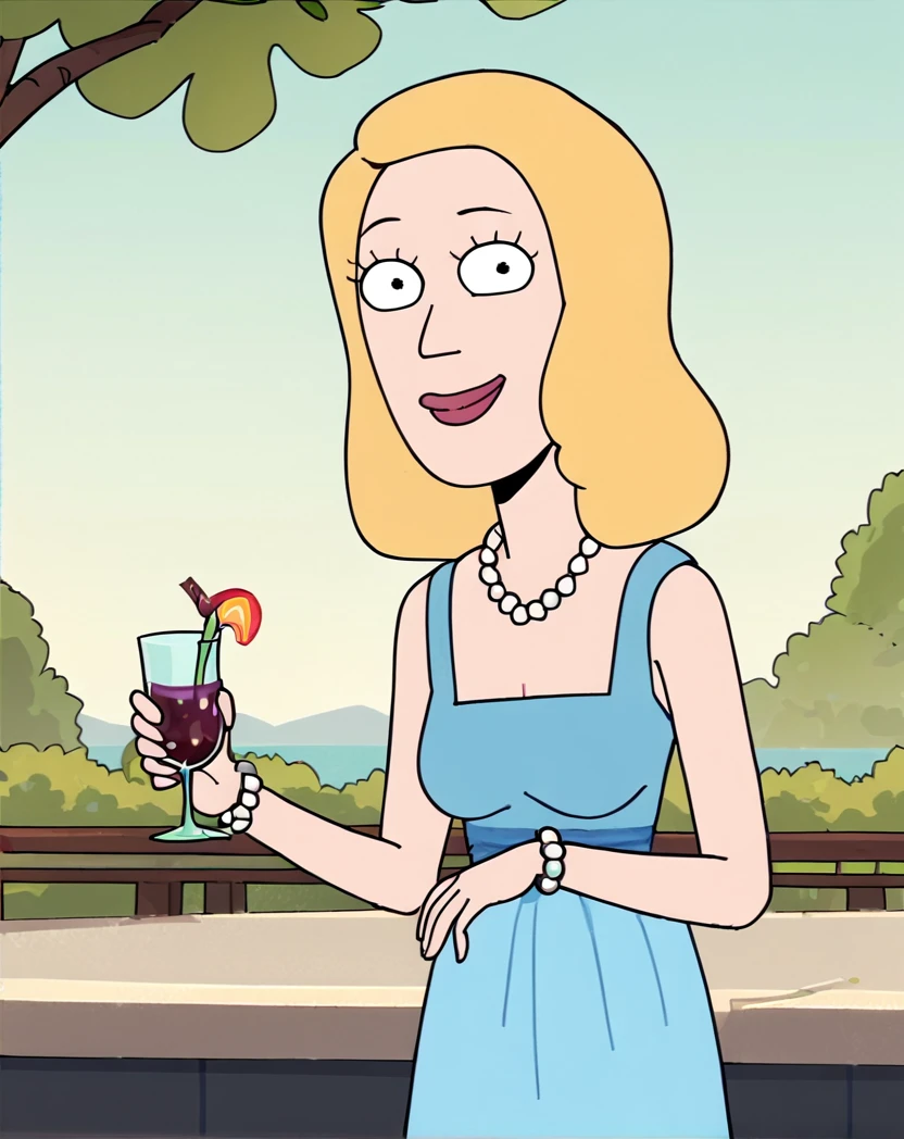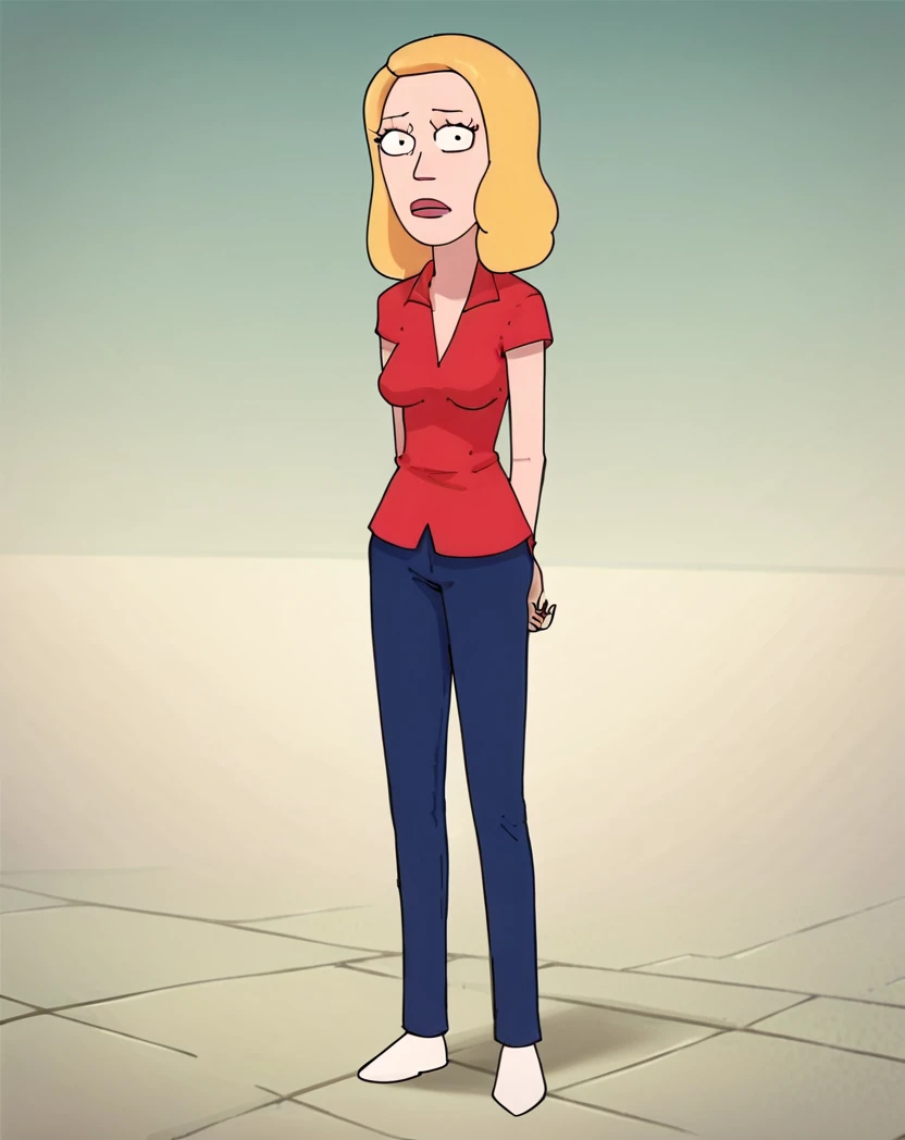 beth, 1girl, blonde hair, solo, red shirt, blue pants,