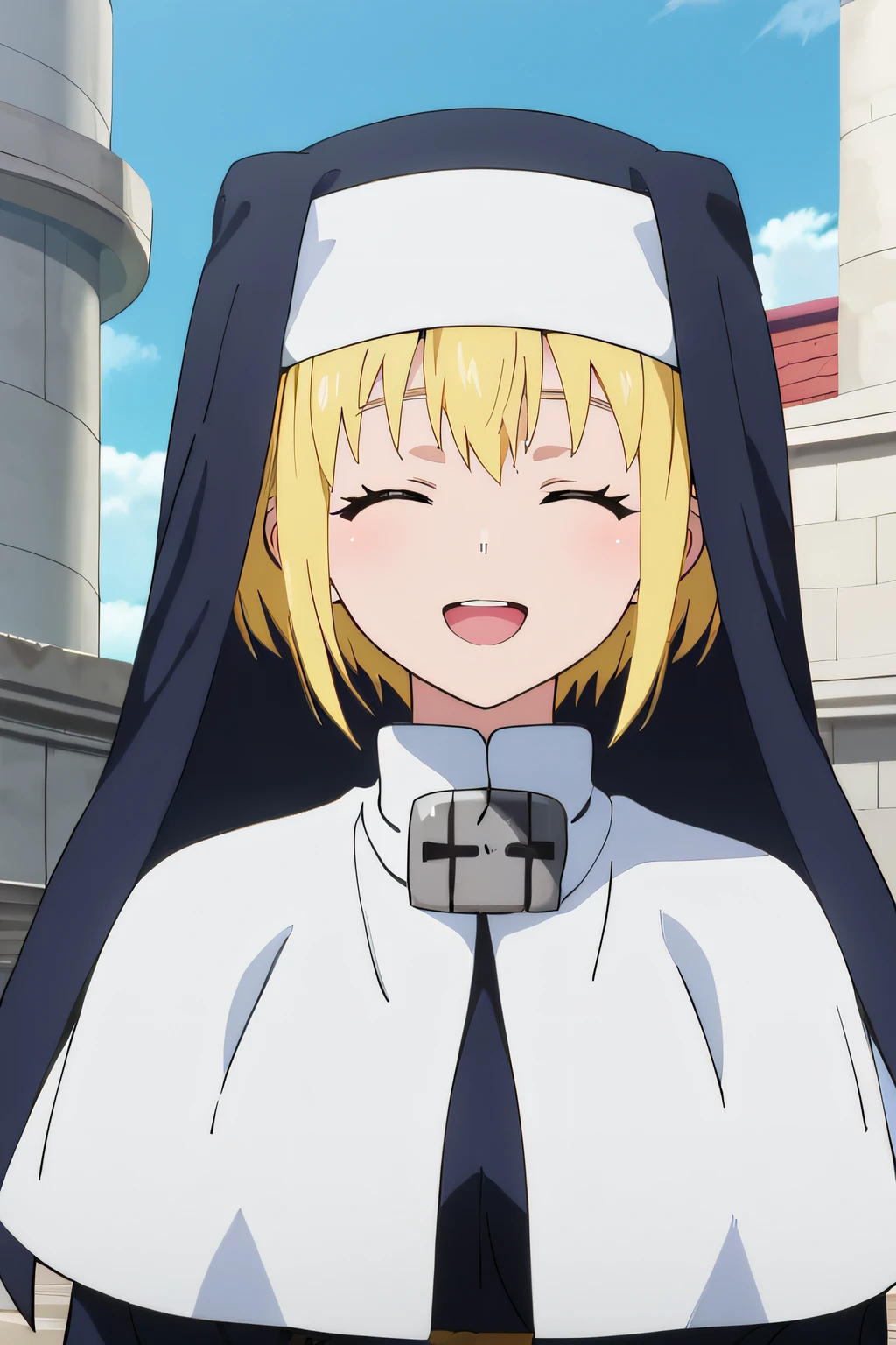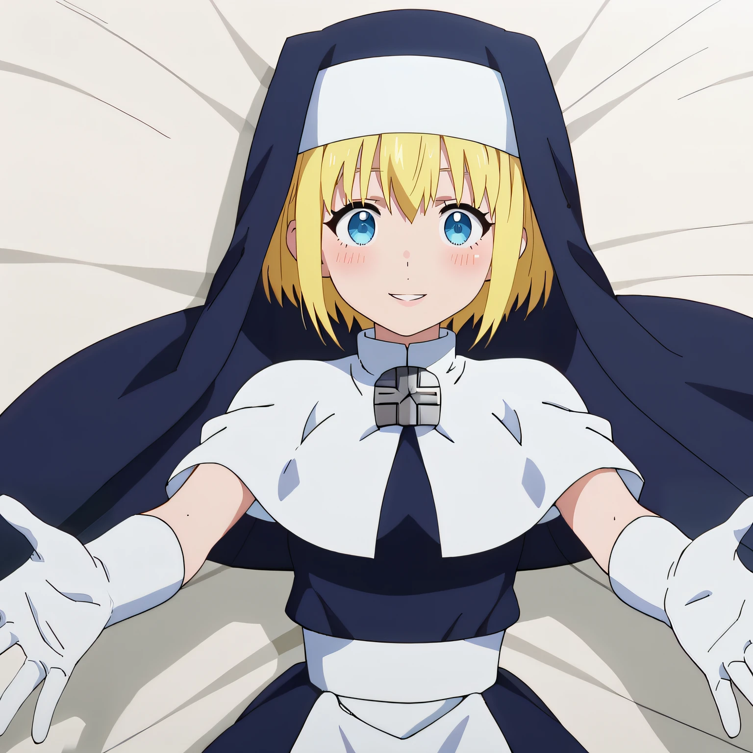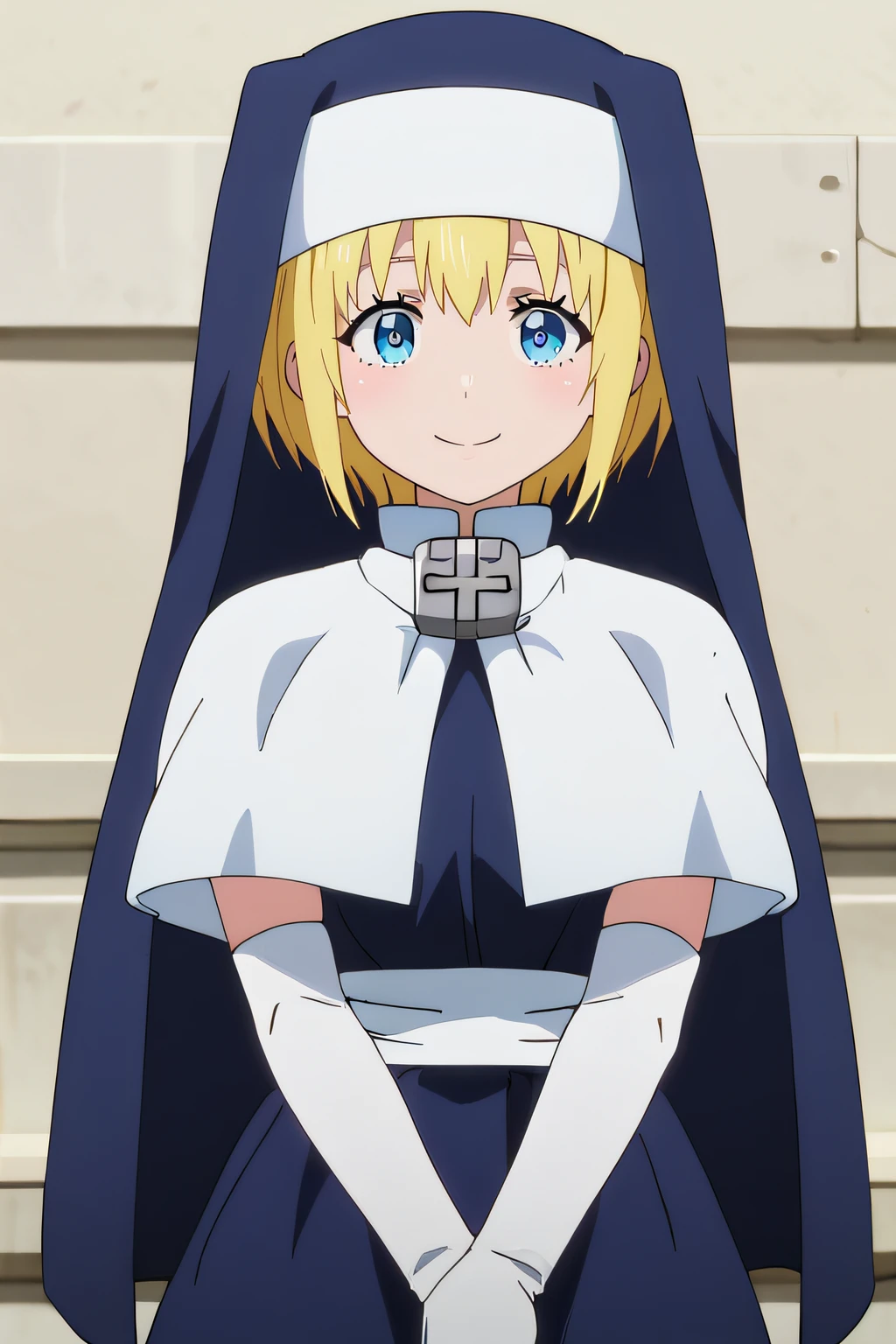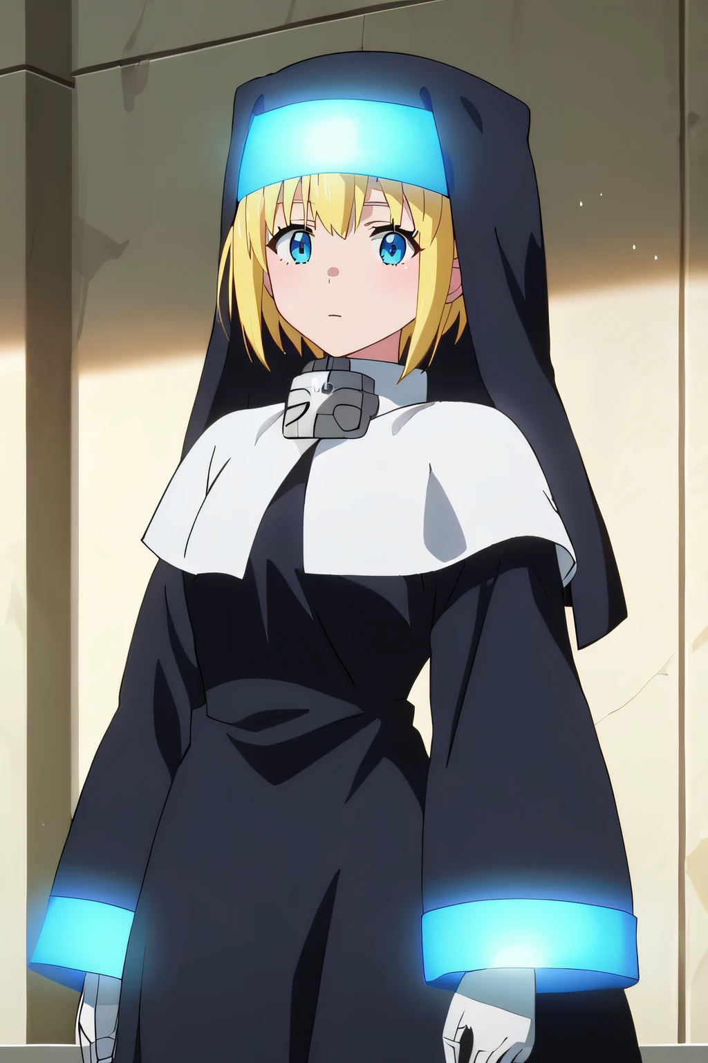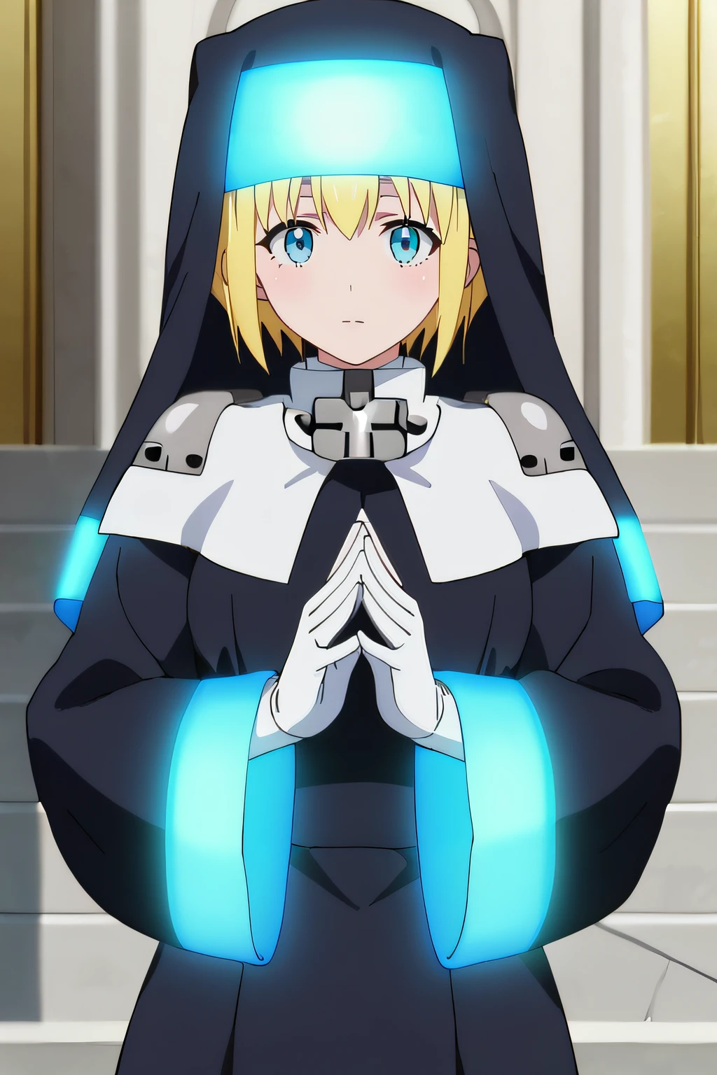 iris, blonde hair, blue eyes, short hair, nun, black habit, shoulder armor, long sleeves, white gloves, wide sleeves, glowing cuffs