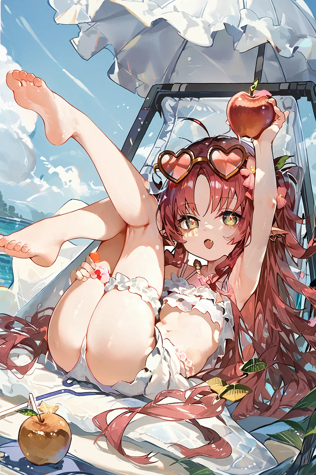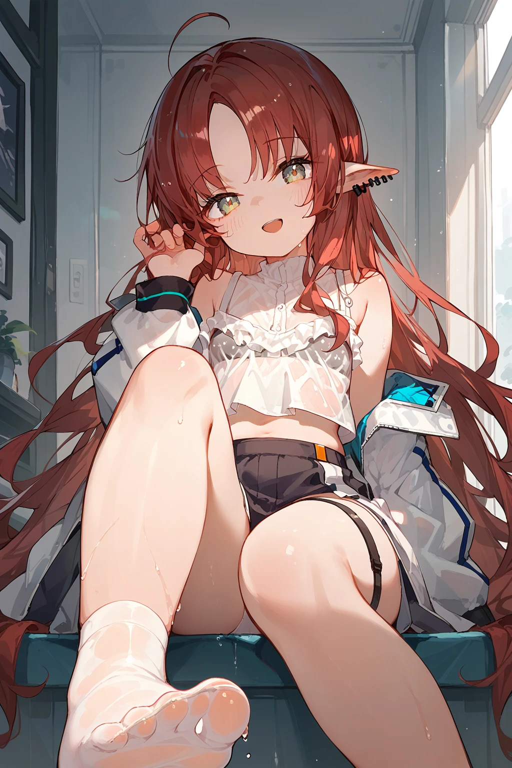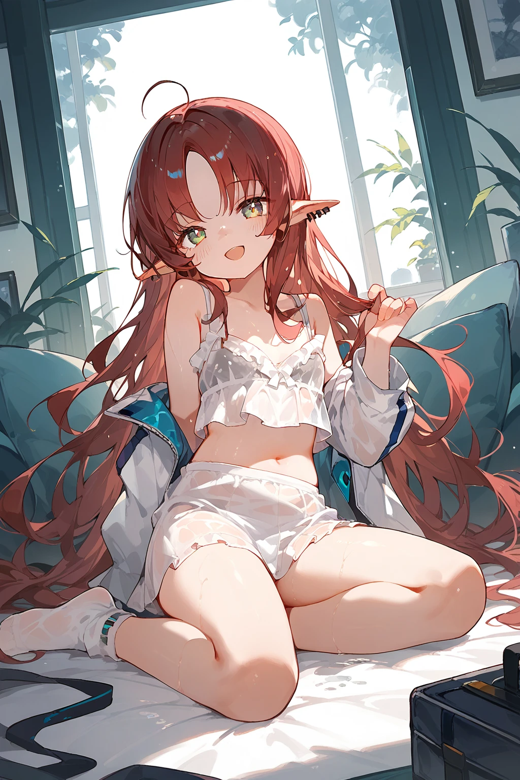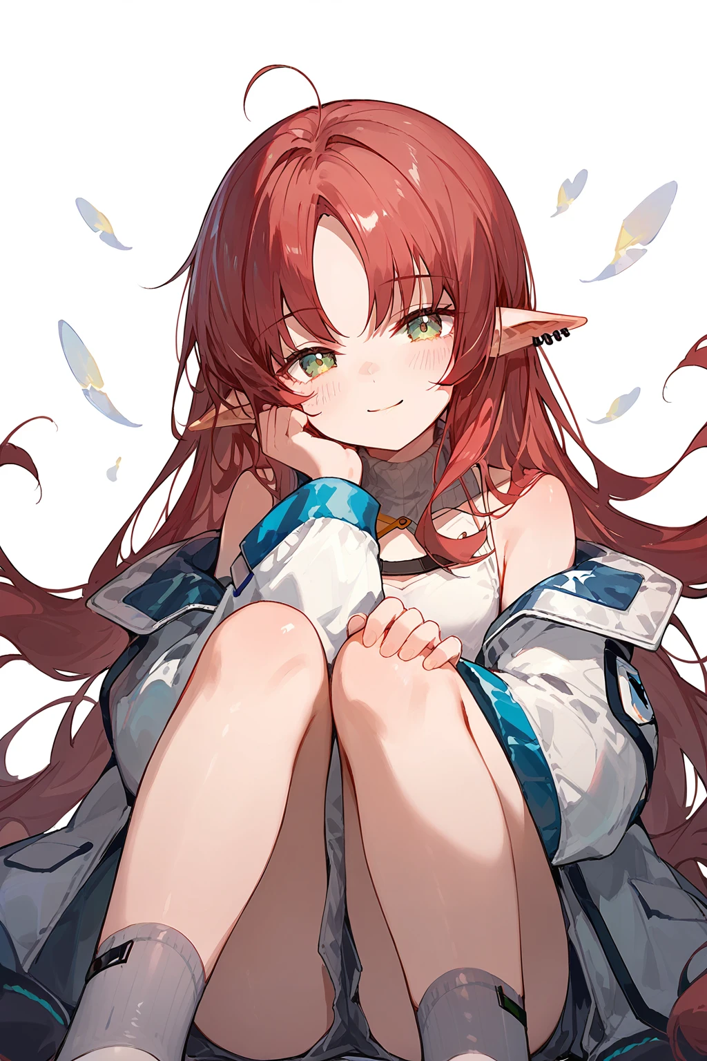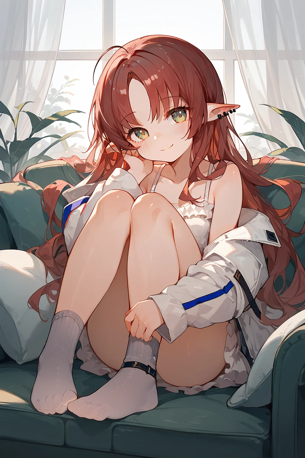 Myrtle(Arknights),1girl,solo,pointy ears,long hair,smile,looking at viewer,jacket,piercing,ear piercing,socks,white jacket,bangs,off shoulder,long sleeves,ahoge,bare shoulders,very long hair,