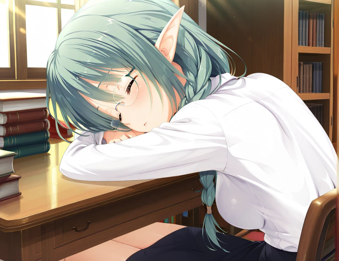 Nauts_Tia, elf, pointy ears, green hair, yellow eyes, , glasses,