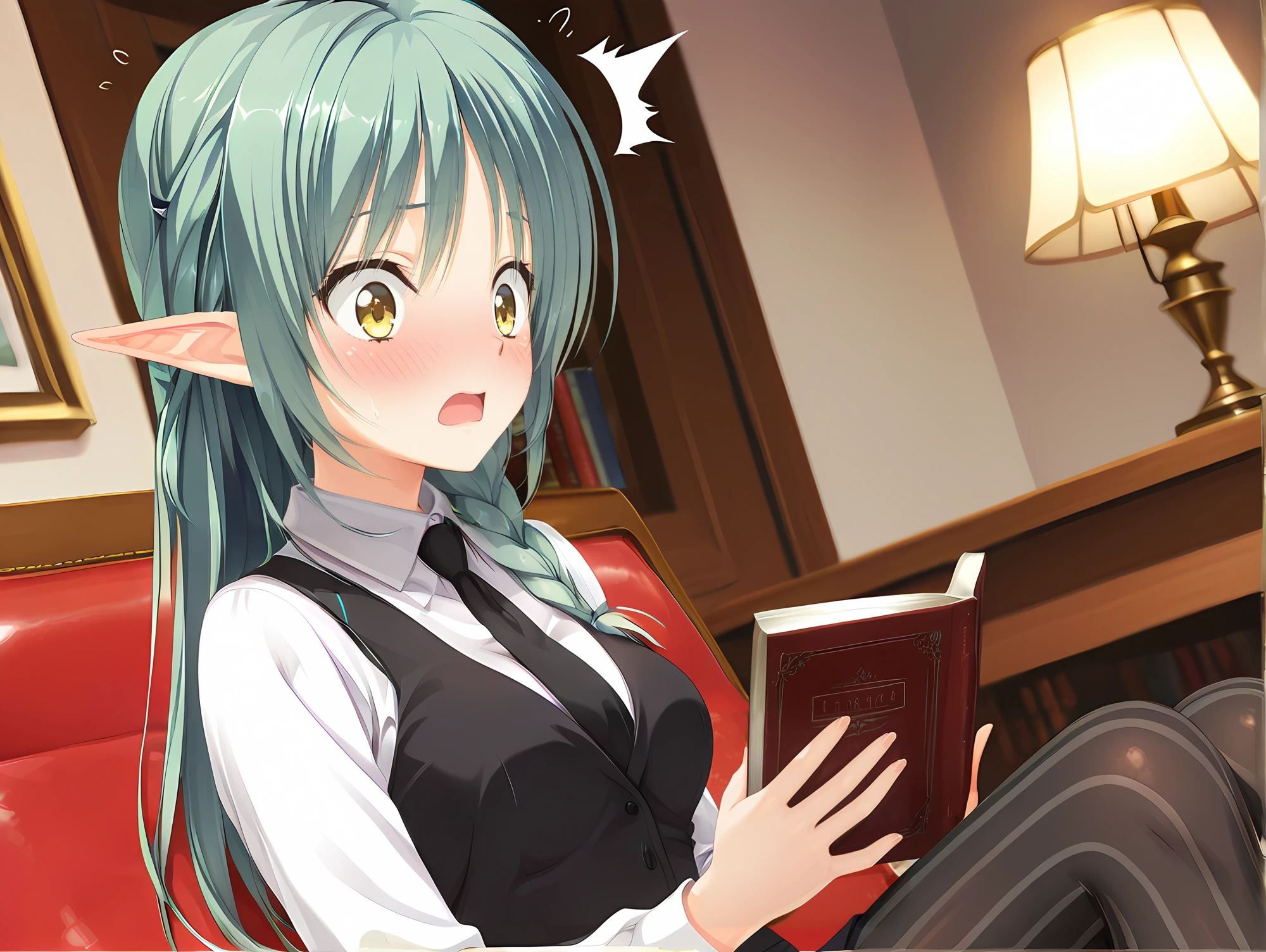 Nauts_Tia, elf, pointy ears, green hair, yellow eyes, medium breasts, glasses,
