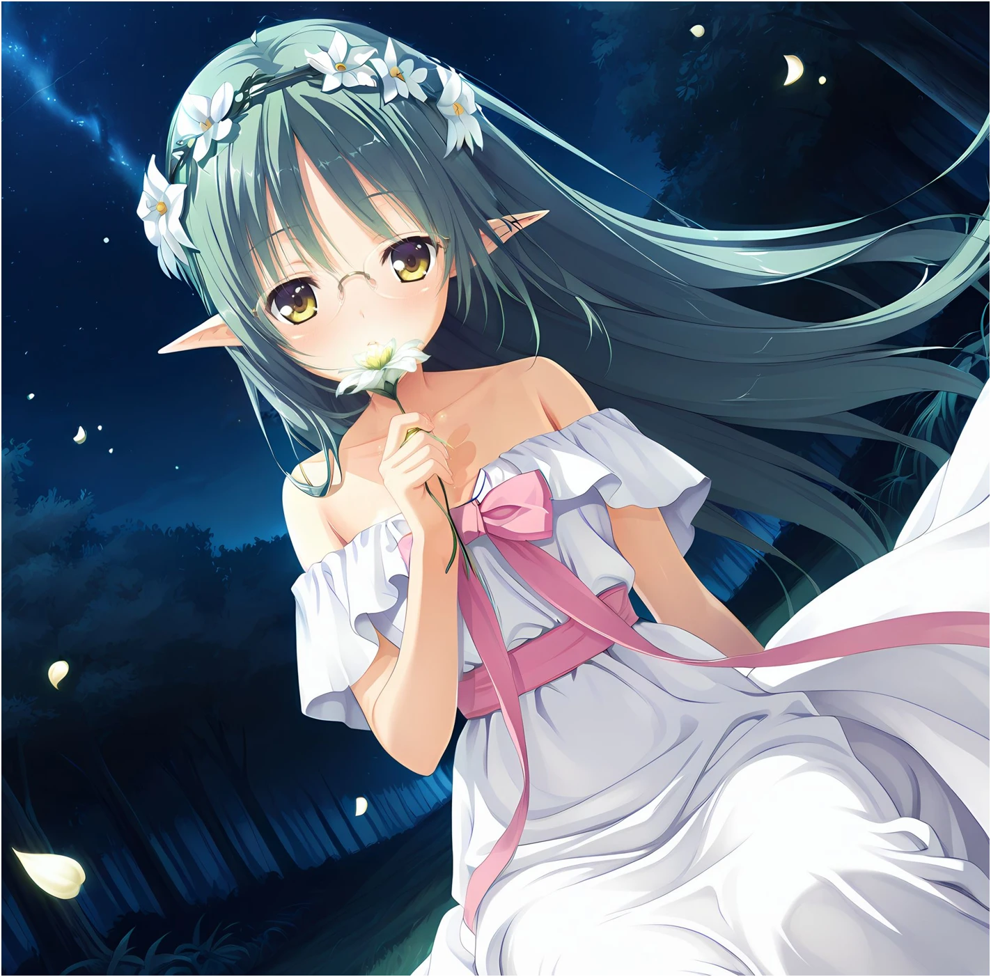 white dress, ribbon, head wreath, hair flower, bare shoulders, long hair, glasses,Description