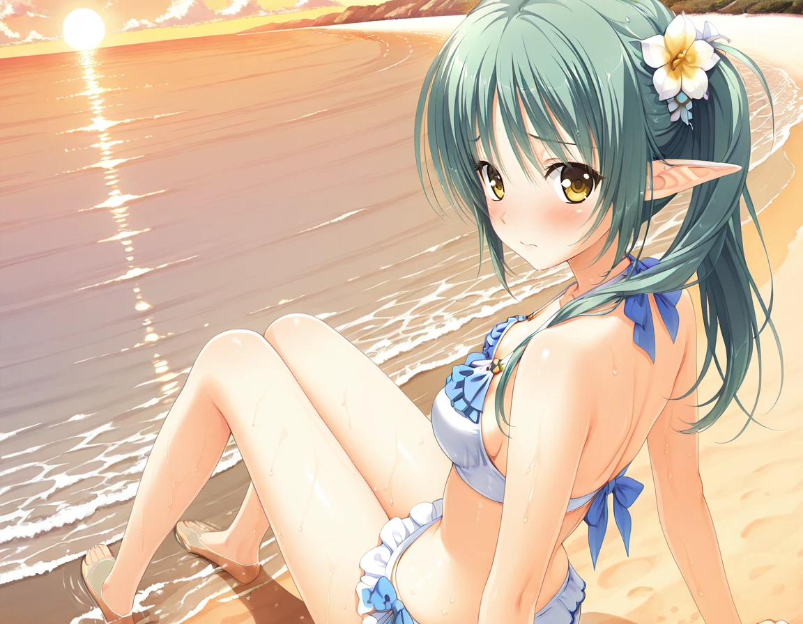 , frilled , skirt, swimsuit, barefoot, long hair, side ponytail, hair ornament,
