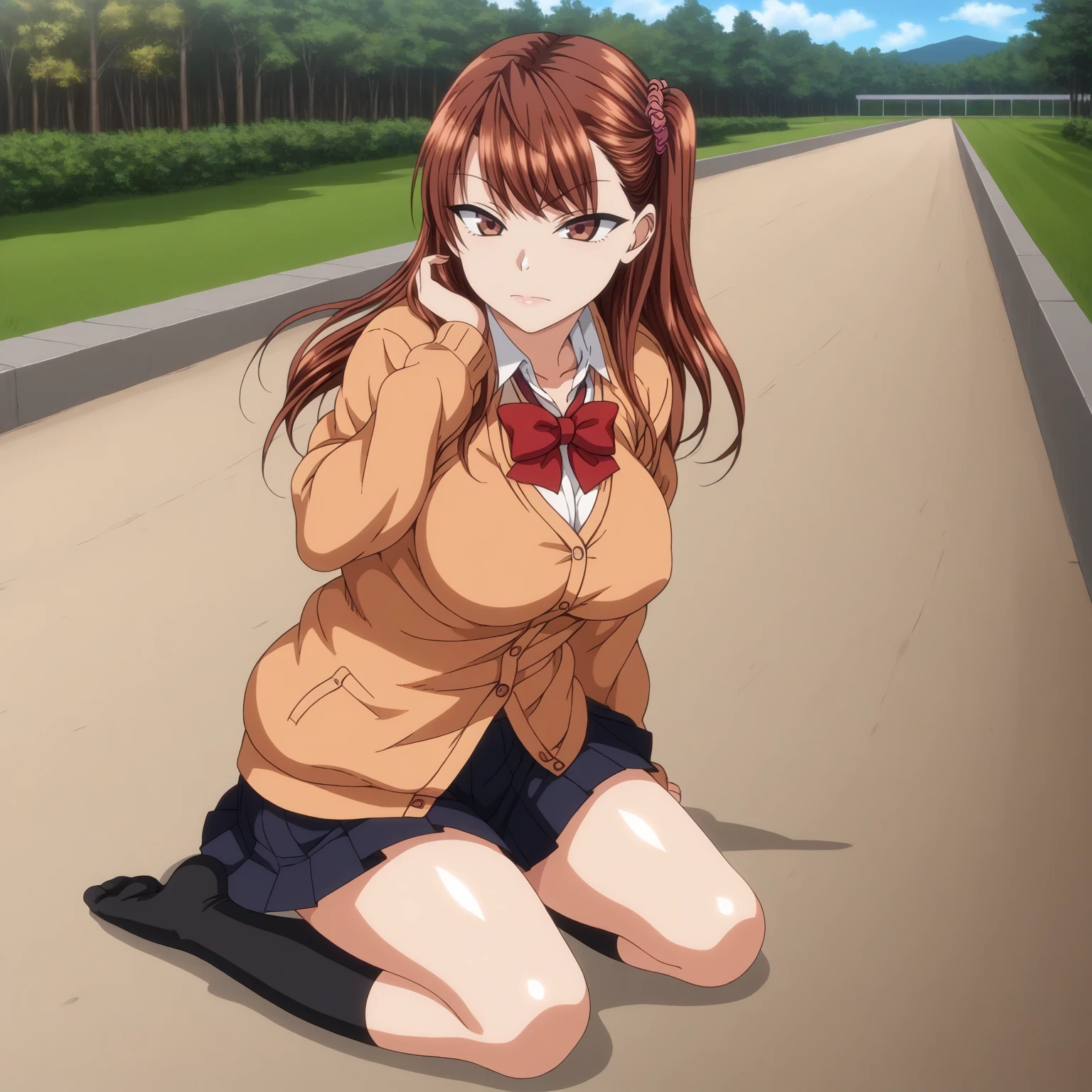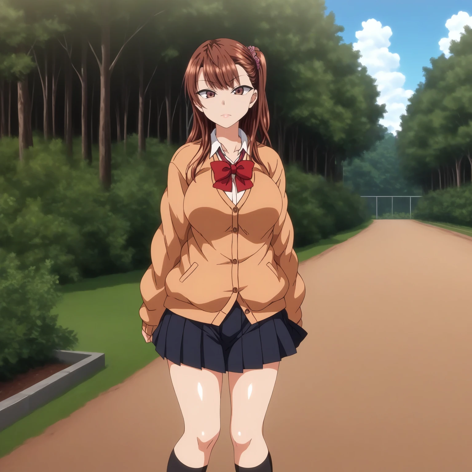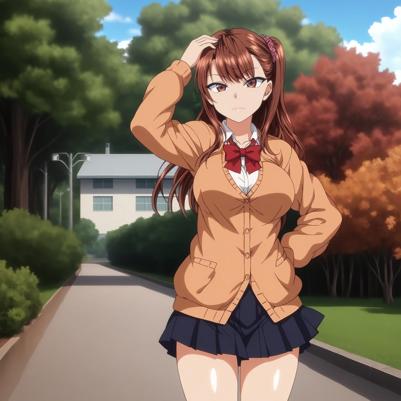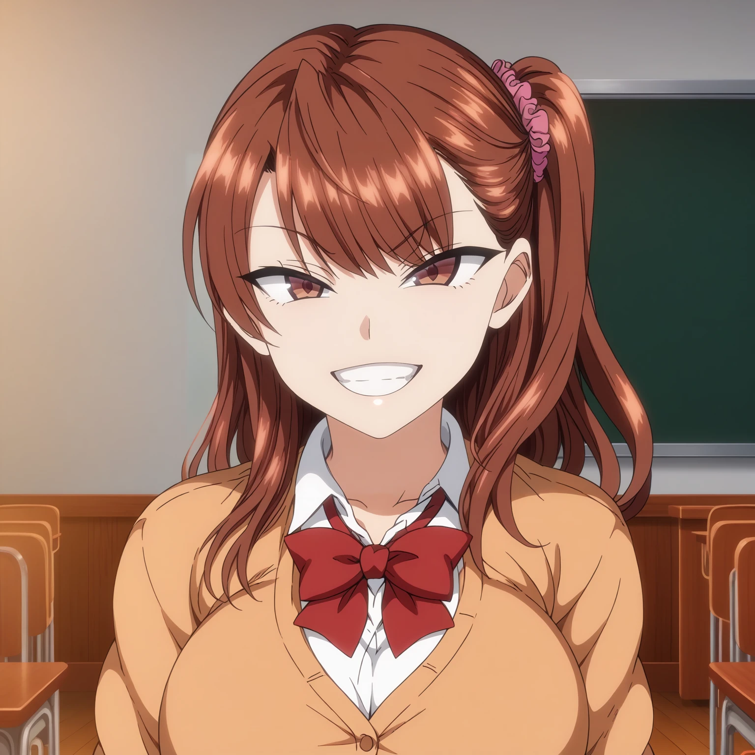 IzumiNogami,1girl,brown hair,long hair,hair scrunchie,one -side -up,brown eyes, large breasts,
