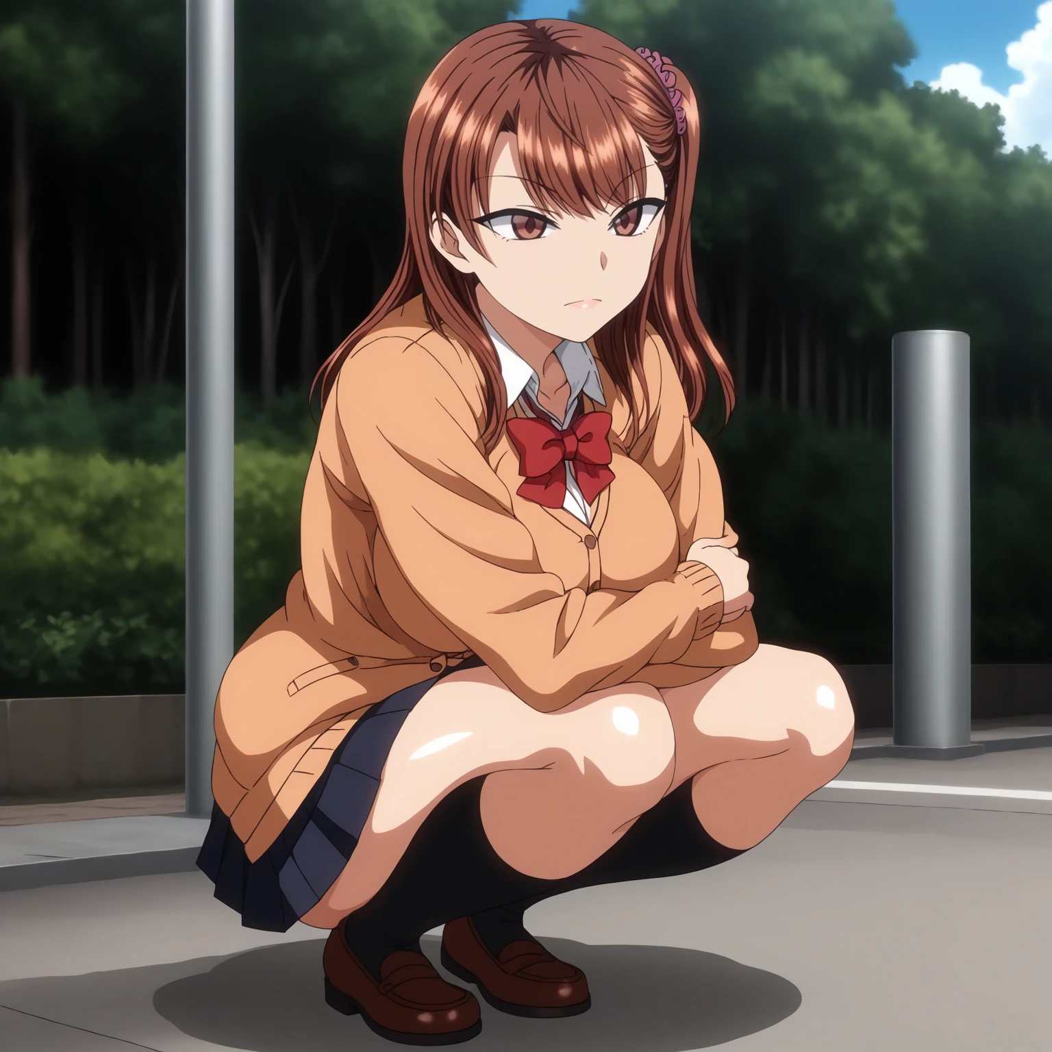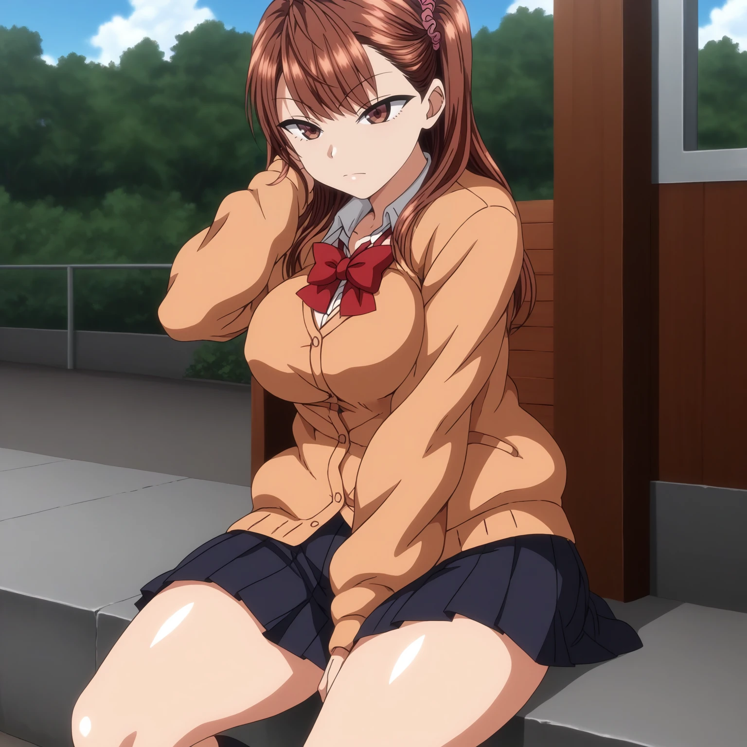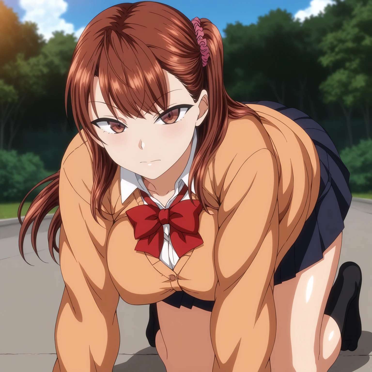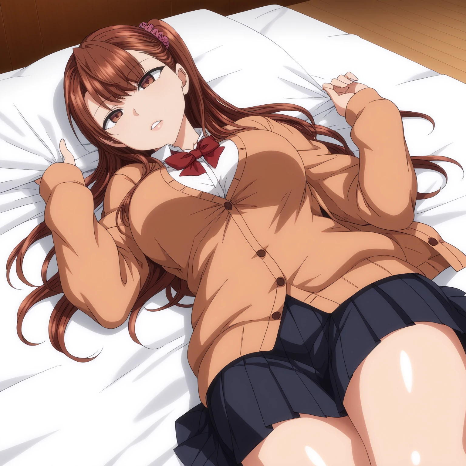 IzumiNogami,1girl,brown hair,long hair,hair scrunchie,one -side -up,brown eyes, large breasts,