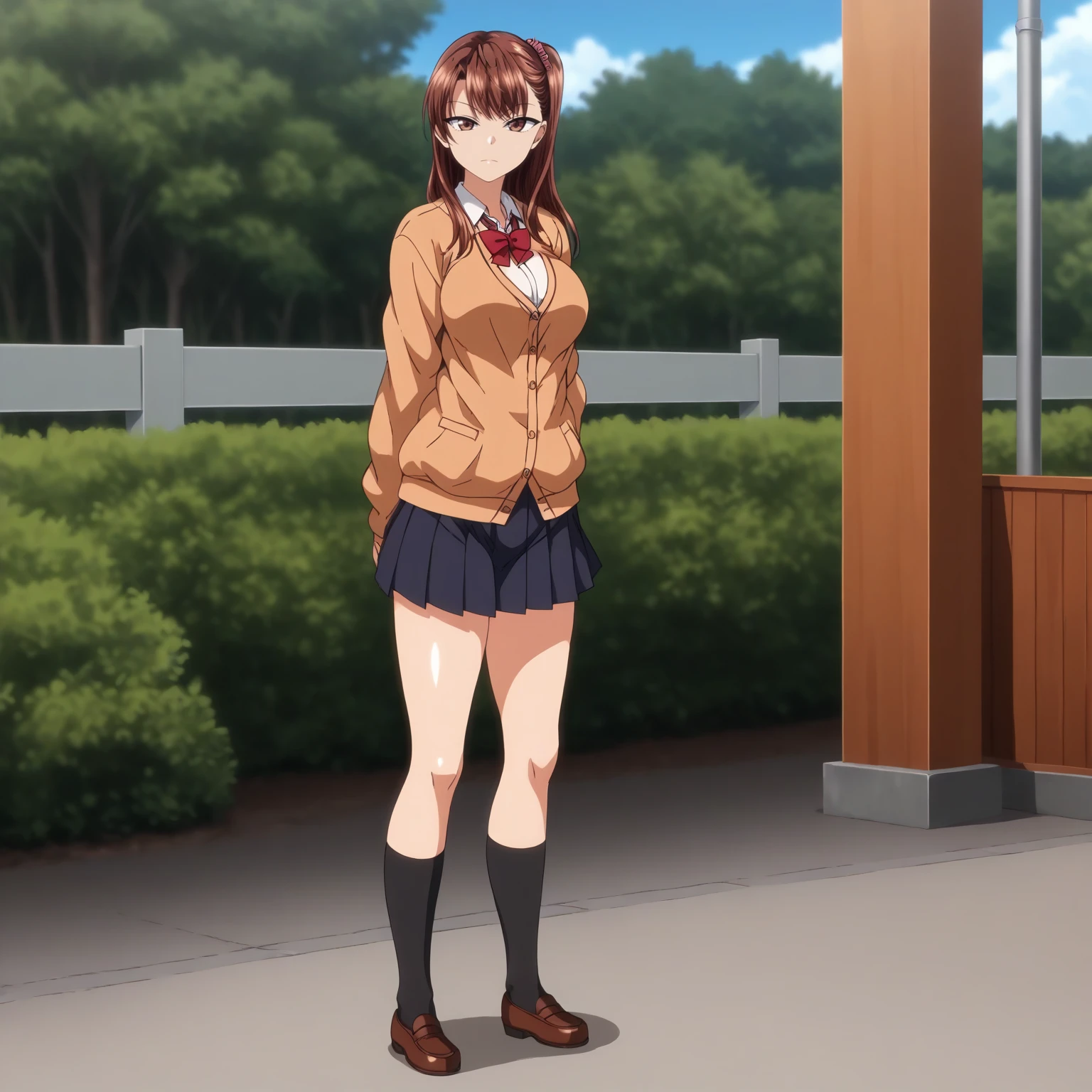 red bowtie,cardigan, pleated_skirt,