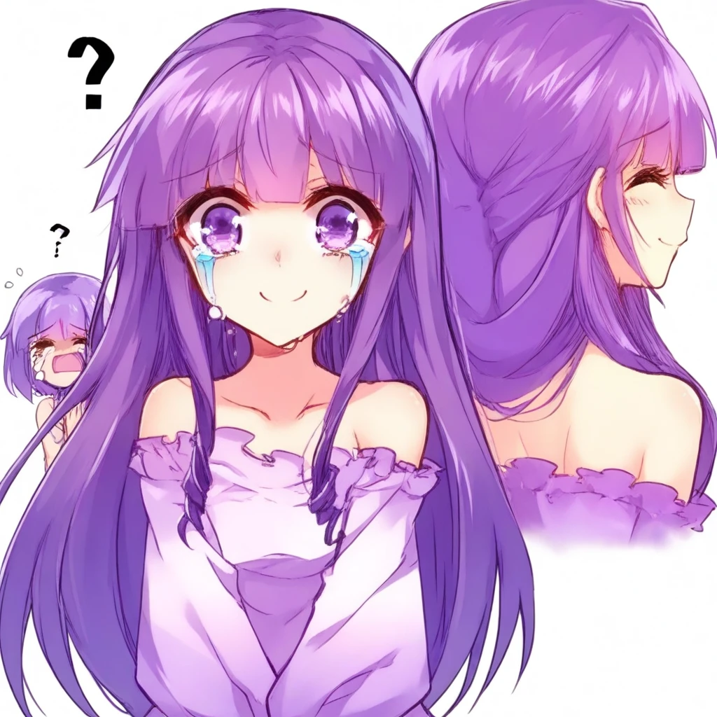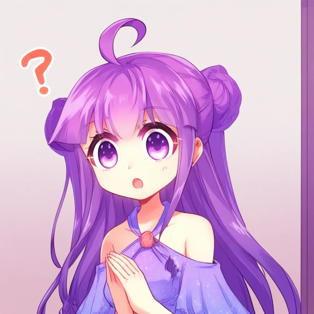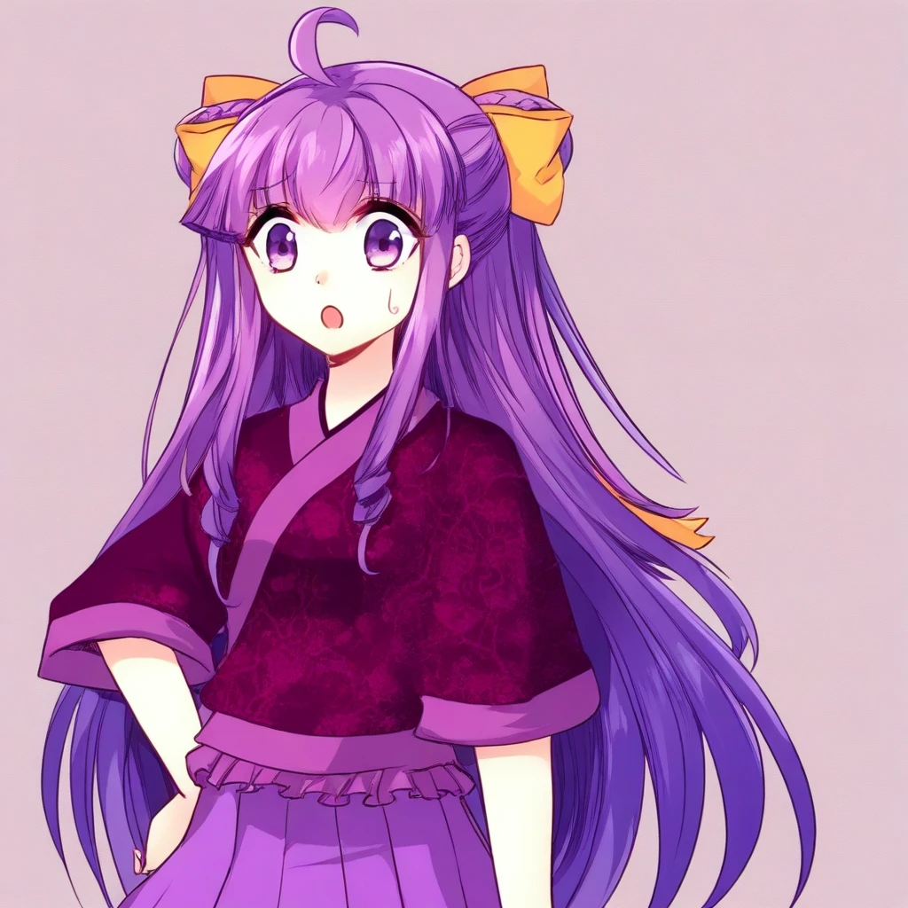 very long hair, 1girl, ahoge, :o, japanese clothes, skirt, sweatdrop, hair bow, hair bun, purple hair, hand on hip, solo