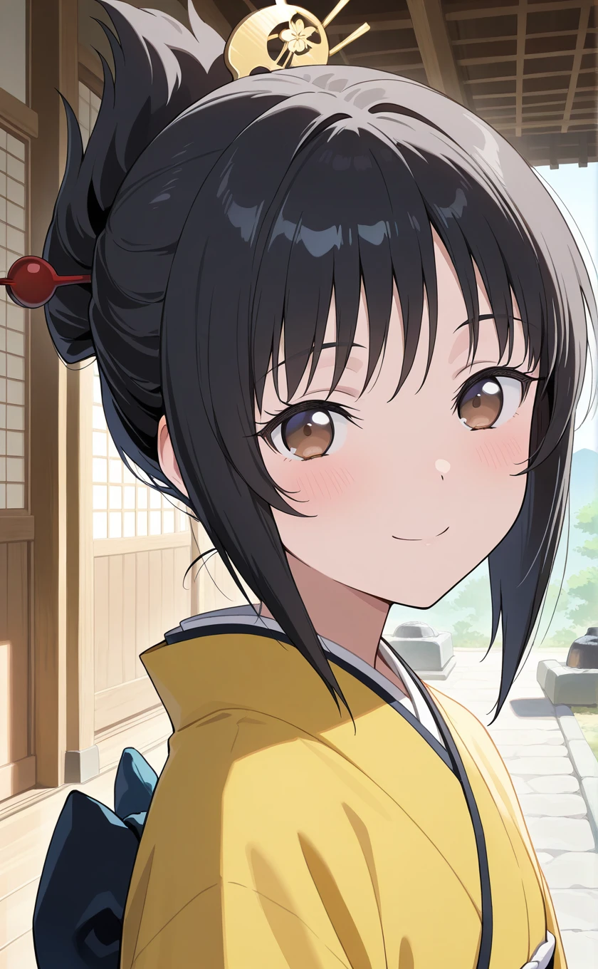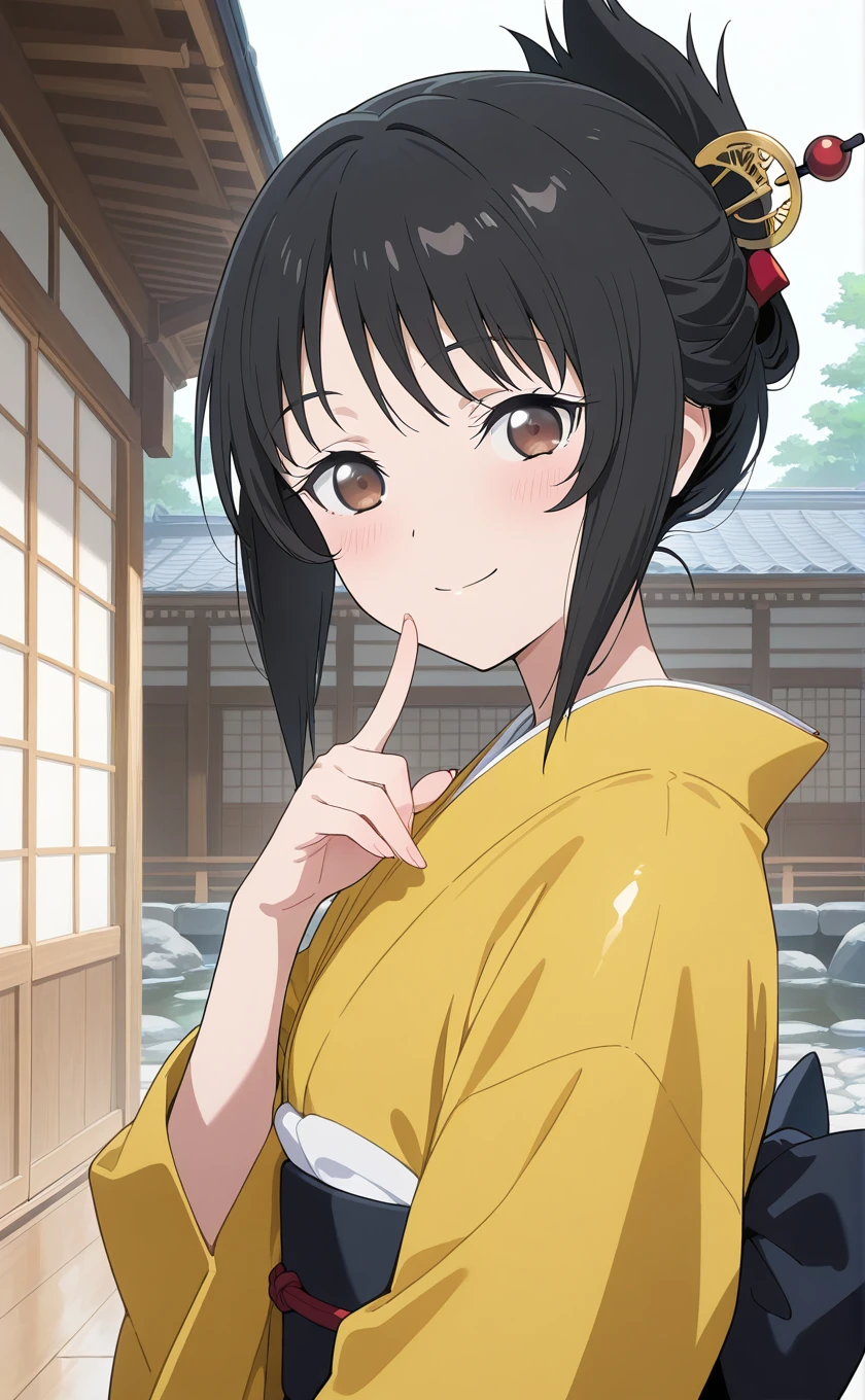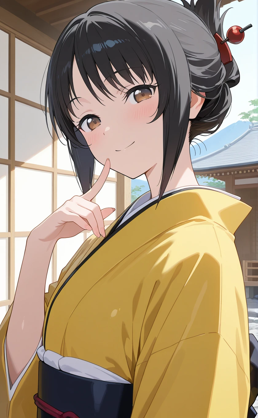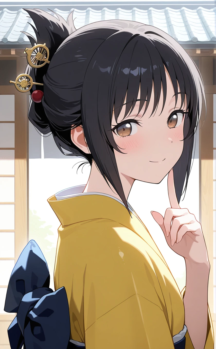 short hair,black hair,folded ponytail,hair ornament,hair stick,shouji,brown eyes